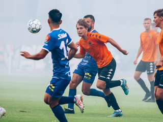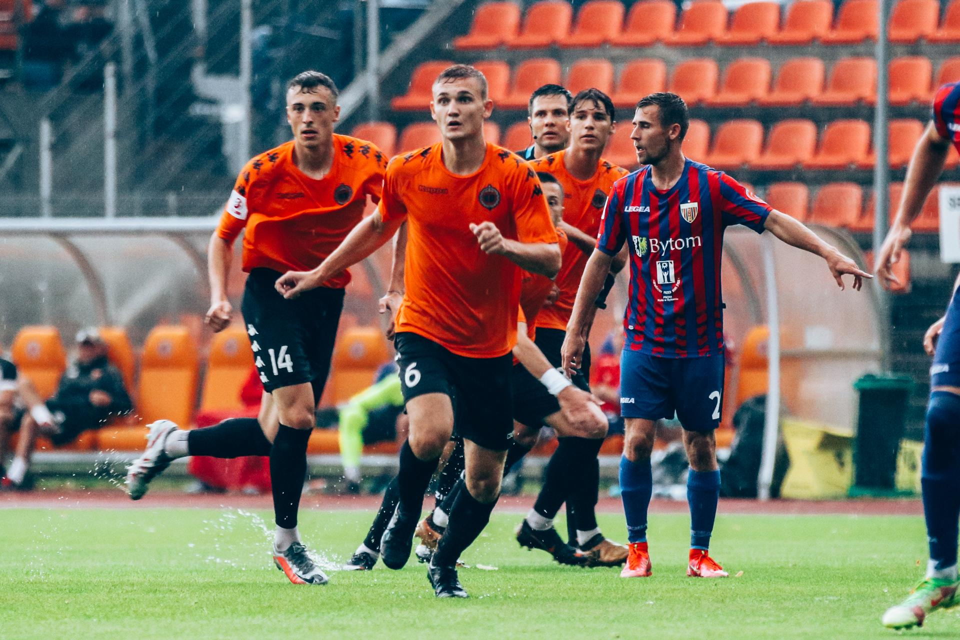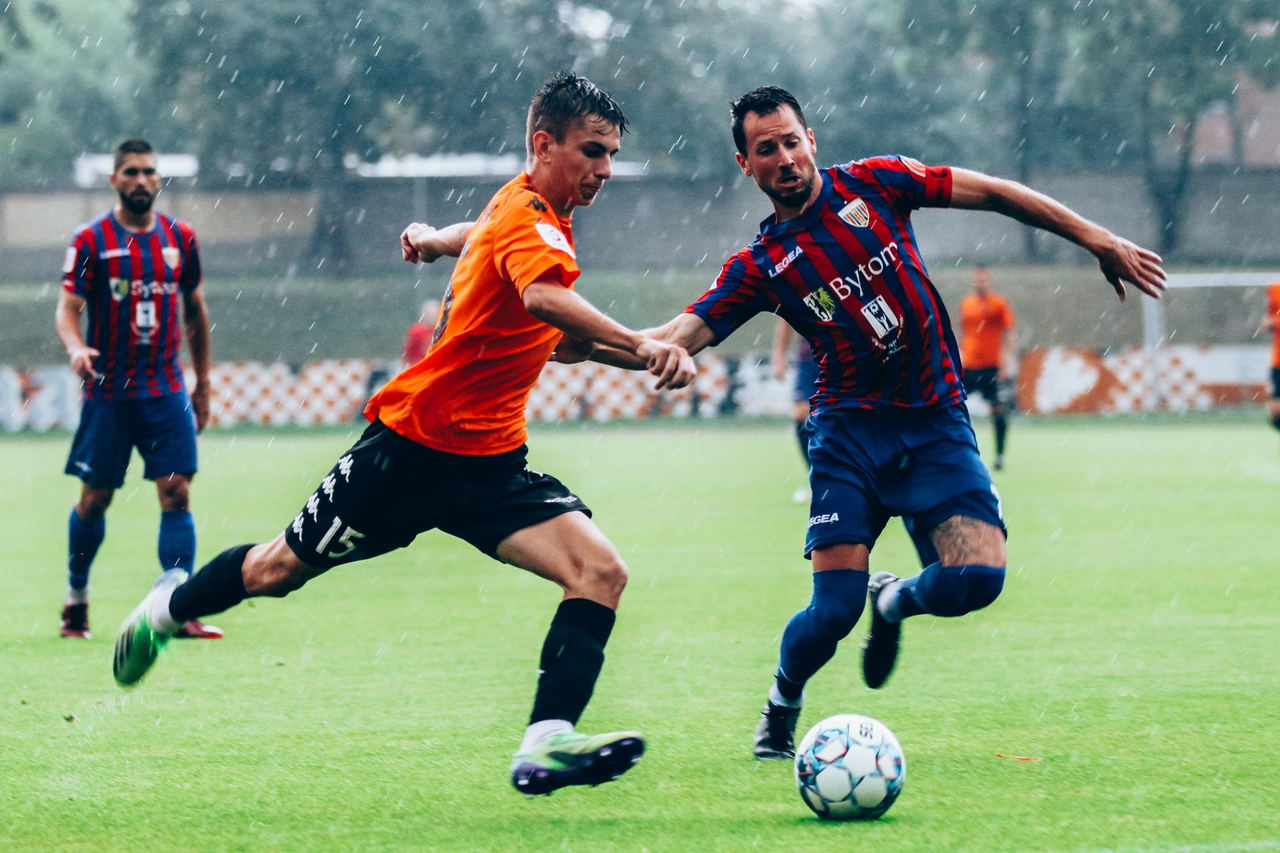 3 LIGA: Chrobry II Głogów - Polonia Bytom 0:2 W 4 kolejce 3 ligi Chrobry przegrał z Polonią Bytom 0:2. 20-08-2022 07:02 autor: ŁJ Mecz toczył się w trudnych warunkach, przy momentami mocno padającym deszczu i to miało wpływ na wygląd spotkania. W pierwszej połowie w tych warunkach więcej z przodu zdziałali bardziej doświadczeni goście, którzy mieli więcej okazji, a przy dwóch głogowian ratowała poprzeczka i słupek. W 41 minucie rywale wykonywali rzut rożny i zrobili z niego użytek. Po dośrodkowaniu z narożnika głową Bartka Szafera pokonał Jakub Góralczyk i po 45 minutach Polonia była na jednobramkowym prowadzeniu. W drugiej połowie Polonia zdołała podwyższyć swoje prowadzenie. W 78 minucie, po stracie piłki przez głogowian, bramkę po ładnym strzale z kilkunastu metrów zdobył Tomasz Gajda. Choć młodym zawodnikom Chrobrego II nie można odmówić woli walki i podejmowania prób odrobienia strat nawet po stracie drugiego gola, zwycięstwo bytomian jest zasłużone. Chrobry ma teraz tydzień przygotowań do kolejnego meczu. W 5 kolejce głogowianie zmierzą się w małych derbach z Miedzią II Legnica. Początek zaplanowano na sobotę 28 sierpnia na godz. 12.00 w Legnicy. CHROBRY II GŁOGÓW – POLONIA BYTOM 0:2 (0:1) 0:1 Góralczyk 41 0:2 Gajda 78 CHROBRY II: Szafer – Iwanowicz, Malczuk, Wawrzyniak, Jandziak, Inoue (58 Jurgo), Cieślicki (58 Wojciechowski), Matysiak (74 Krawiec), Maćkowiak, Bartlewicz (58 Jaszczyk), Jóźwiak (68 Zygmunt). POLONIA: Gniełka – Zieliński (87 Tkachuk), Żagiel (68 Lipp), Góralczyk, Stefański (68 Andrzejczak), Gajda, Wolny, Bedronka, Budzik (89 Anklewicz), Konieczny, Radkiewicz. ŻÓŁTE KARTKI: Malczuk, Bartlewicz, Szafer, Wawrzyniak, Cieślicki – Stefański, Konieczny, Radkiewicz, Andrzejczak.
