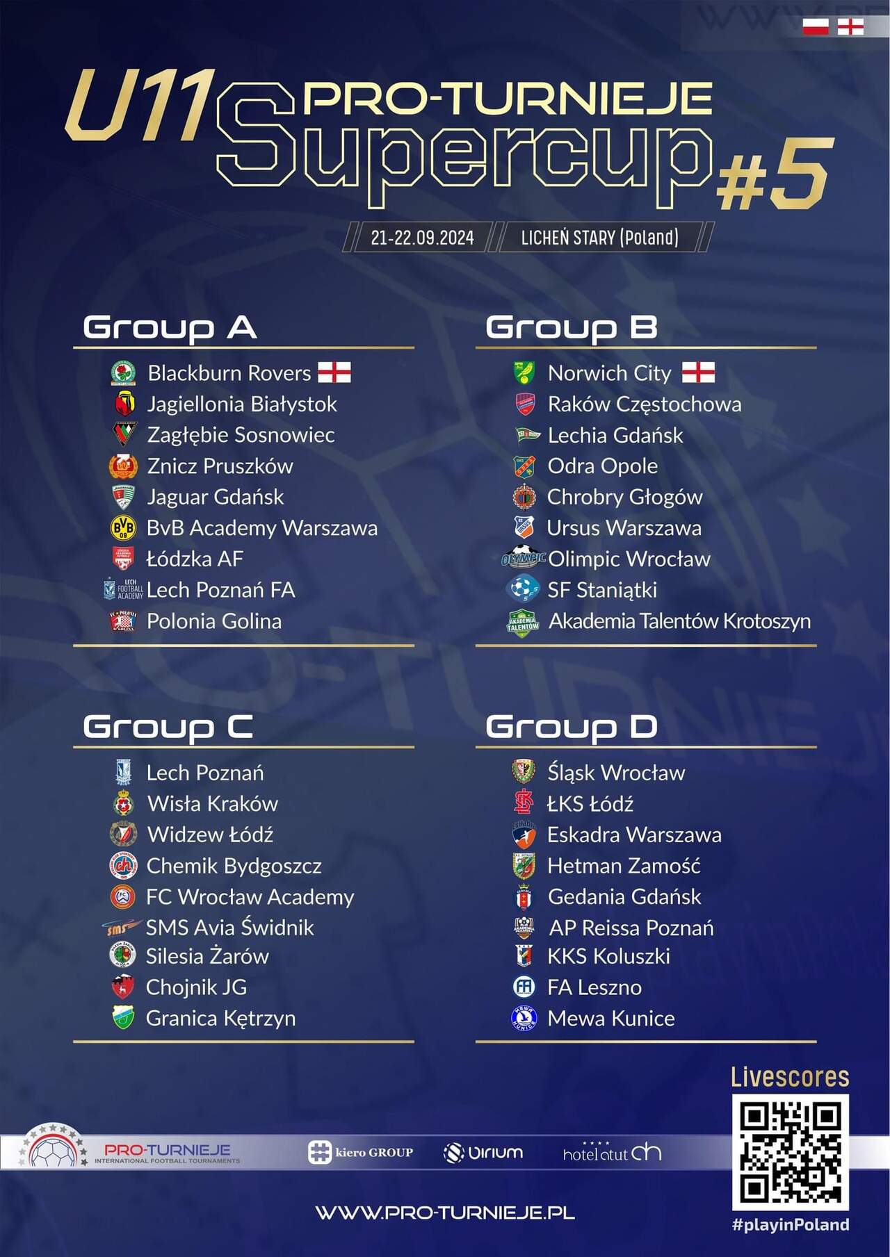 Chrobry U-11 zagrał w Licheniu Za Chrobrym U-11 udział w bardzo mocno obsadzonym turnieju Super Cup w Licheniu Starym. 23-09-2024 07:12 autor: ŁJ W turnieju udział wzięło ponad 30 klubów i akademii z całej Polski, a także Anglii. Już w grupie Pomarańczowo-Czarni mieli okazję rywalizować z Norwich City, Rakowem Częstochowa, Lechią Gdańsk czy Odrą Opole, a więc za nimi kawał wpływającego na dalszy rozwój grania. Strzelcy Chrobrego: 13 - Kuba Lebedyński 2 - Oliwer Przyboś, Tiago Stafanowski 1 - Kajetan Kwaśnik, Jan Kaczmarek, Olek Koselarz, Alan Stępień Skład Chrobrego: Wojtek Burgchardt, Maksymilian Bednarowski, Antek Walkowiak, Kajetan Kwaśnik, Tiago Stefanowski, Szymon Sekuła, Ilian Bożek, Oliwier Przyboś, Alan Stępień, Jan Kaczmarek, Kuba Lebedyński, Aleksander Koselarz. Trener: Kajetan Frankowski.