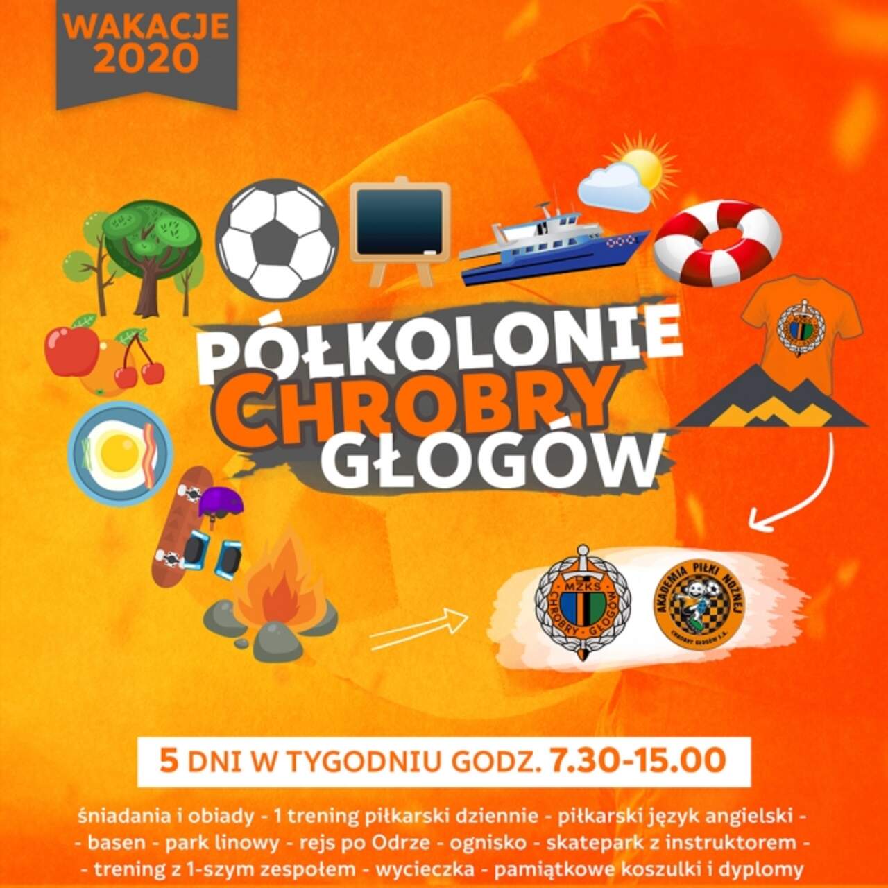 Półkolonia Chrobrego na dobry początek wakacji Chrobry Głogów organizuje i zachęca do wzięcia udziału w wakacyjnych piłkarskich półkoloniach dla dzieci w wieku 6-13 lat. Pierwszy turnus rozpocznie się już 29 czerwca. Każdy to kilka dni, 8 godzin dziennie, a w tym codzienne… 22-05-2020 02:25 autor: ŁJ Chrobry Głogów organizuje i zachęca do wzięcia udziału w wakacyjnych piłkarskich półkoloniach dla dzieci w wieku 6-13 lat. Pierwszy turnus rozpocznie się już 29 czerwca. Każdy to kilka dni, 8 godzin dziennie, a w tym codzienne piłkarskie treningi, trening z pierwszym zespołem Chrobrego, instruktażowe zajęcia na skateparku, w basenie, nauka piłkarskiego angielskiego, rejs po Odrze, ognisko, koszulki i cerytyfikaty uczestnictwa i - opcjonalnie - zdobywanie gór podczas całodniowego wyjazdu do Karpacza. To namiastka obozu przygotowawczego z prawdziwego zdarzenia!Organizujemy dwa turnusy. Pierwszy odbędzie się w dniach 29 czerwca - 3/4 lipca, drugi w dniach 6 lipca - 10/11 lipca. Każdego dnia zbieramy się od godz. 7.30, a kończymy o godz. 15.00. Czas pomiędzy śniadaniem a zakończeniem dnia wypełniamy licznymi zajęciami sportowo-rekreacyjnymi.Półkolonie są piłkarskie, dlatego w ciągu dnia dużo piłkarskich aktywności: codzienne treningi, trening z pierwszoligowym Chrobrym i nauka piłkarskiego języka angielskiego. Wszystkie zajęcia będą prowadzone przez wykwalifikowaną kadrę Akademii Piłki Nożnej oraz lektorów Lingua Expert.FORMULARZ ZGŁOSZENIOWYPlik należy pobrać, wypełnić i wysłać na klub@chrobry-glogow.pl Bonusem są pozapiłkarskie aktywności, również o charakterze rekreacyjnym. W zależności od warunków pogodowych i innych będą to zajęcia sportowo-rekreacyjne na skateparku z instruktorem, na basenach, w parku linowym, rejs statkiem po Odrze i ognisko. Dodatkowo, opcjonalnie dla chętnych osób, szóstego dnia proponujemy całodniowy wyjazd do Karpacza, wejście do Karkonoskiego Parku Krajobrazowego i zdobywanie naszych karkonoskich gór.W ofercie półkolonii Chrobrego jest wyżywienie dla każdego uczestnika, śniadanie, dwudaniowy obiad i zdrowe przekąski w trakcie. Wszyscy otrzymają pamiątkowe koszulki oraz cerytyfikaty ukończenia piłkarskiej półkolonii Chrobrego.Koszt dla członków Akademii Piłki Nożnej (15% zniżki): 500 zł (+100 zł w przypadku wyjazdu do Karpacza*)Koszt dla osób spoza Akademii Piłki Nożnej: 590 zł (+100 zł w przypadku wyjazdu do Karpacza**płatność za całodniowy wyjazd do Karpacza do uregulowania w trakcie turnusu (wyjazd zależy od liczby chętnych)Termin upływania zgłoszeń upływa 14 czerwca. Na ich podstawie Chrobry będzie kontaktował się z osobami, które złożyły formularz, w ten sposób potwierdzając udział w półkolonii.W przypadku pytań prosimy o kontakt:Grzegorz Nowak tel. 504 591 757, Alicja Męczyńska tel. 504 591 831 PoniedziałekWtorekŚrodaCzwartekPiątekSobota(opcjonalnie)8.00śniadanieśniadanieśniadanieśniadanieśniadanie wycieczka(Karpacz)9.00piłkarski język angielskipiłkarski język angielskipiłkarski język angielskipiłkarski język angielskipiłkarski język angielski 10.00trening piłkarskitrening piłkarskitrening piłkarski trening piłkarski trening piłkarski 12.00przekąska regeneracyjnaprzekąska regeneracyjnaprzekąska regeneracyjnaprzekąska regeneracyjna przekąska regeneracyjna 12.30atrakcje wodne(pierwsza pomoc nad wodą)park linowyskatepark(trening z instruktorem - podstawy)atrakcje wodne(piłka wodna)wycieczka(rejs statkiem po Odrze) 14.30obiadobiadobiadobiad ognisko / obiad 15.00odbiór dzieciodbiór dzieciodbiór dzieciodbiór dzieciodbiór dzieci 21.00 powrót z Karpacza