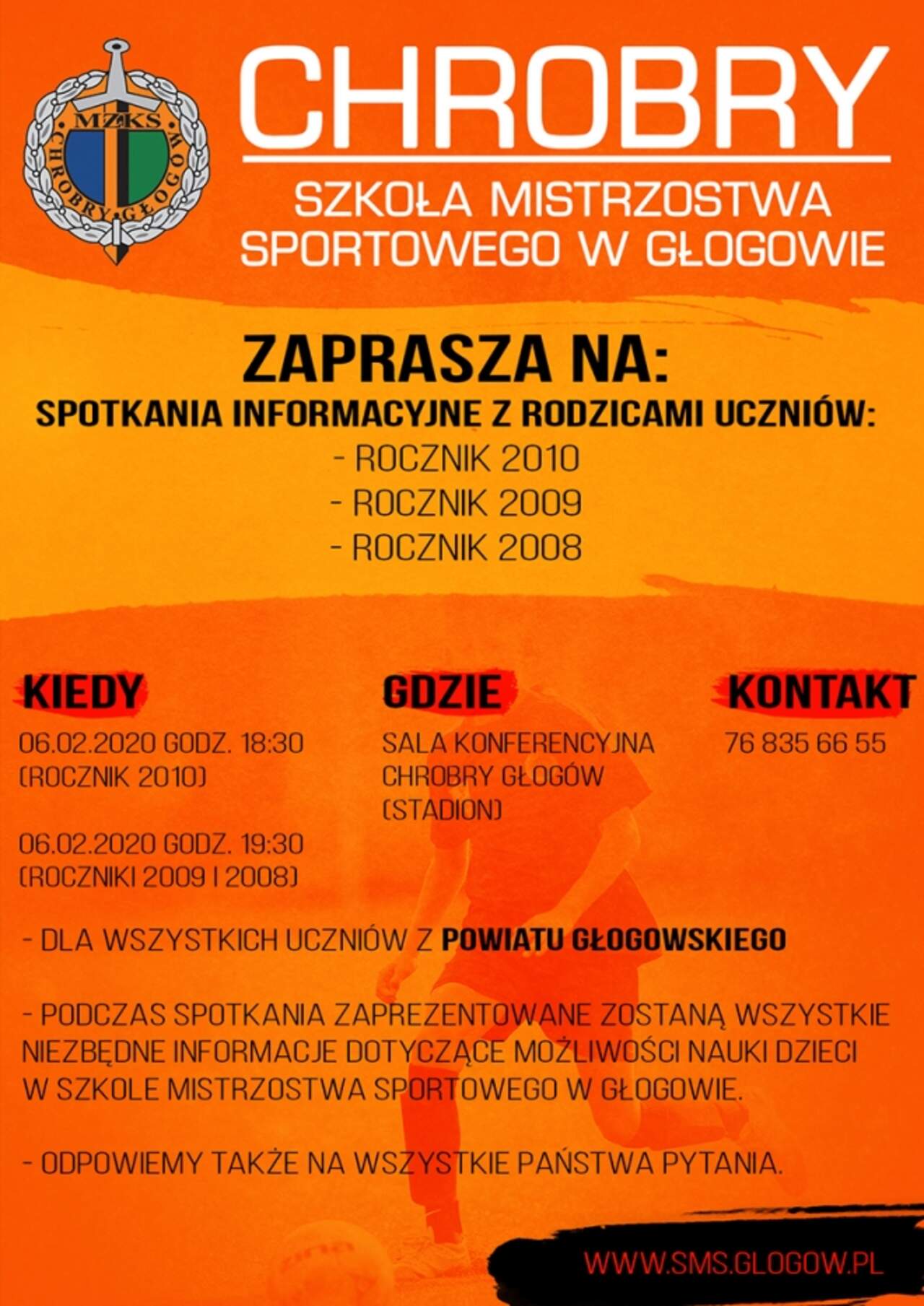 Spotkanie SMS ChG. Roczniki 2008-2010 Szkoła Mistrzostwa Sportowego Chrobry Głogów organizuje spotkanie informacyjne dla rodziców uczniów, którzy chcieliby podjąć naukę w szkole i treningi w klubie.Spotkanie dotyczy osób z roczników 2008, 2009 i 2010. Odbędzie się… 04-02-2020 11:04 autor: ŁJ Szkoła Mistrzostwa Sportowego Chrobry Głogów organizuje spotkanie informacyjne dla rodziców uczniów, którzy chcieliby podjąć naukę w szkole i treningi w klubie.Spotkanie dotyczy osób z roczników 2008, 2009 i 2010. Odbędzie się w czwartek (06.02.2020) w godz. 18:30 i 19:30 w budynku klubowym Chrobrego Głogów przy ul. Wita Stwosza. Prowadzący odpowiedzą na wszelkie pytania i przedstawią argumenty, które przemawiają za dalszym rozwojem w SMS Chrobry.