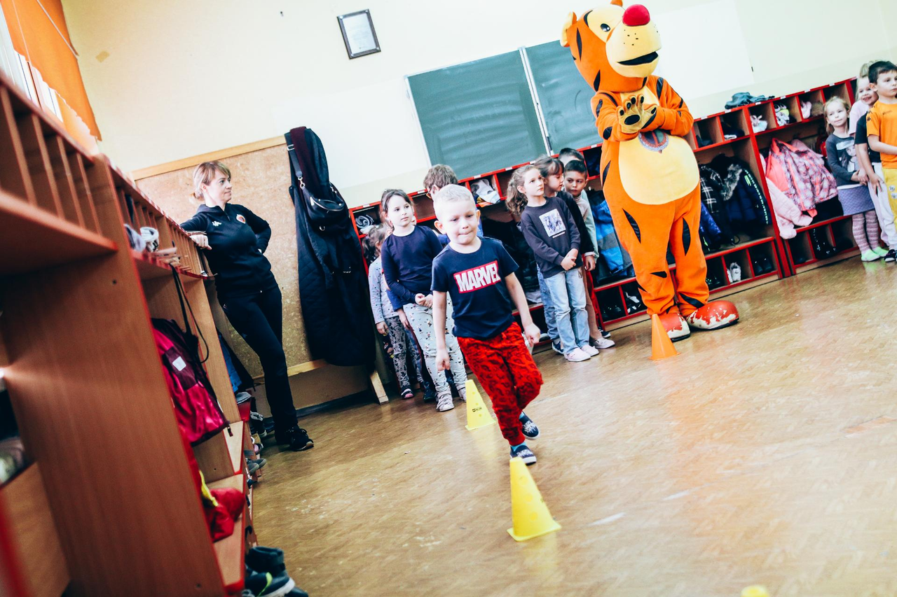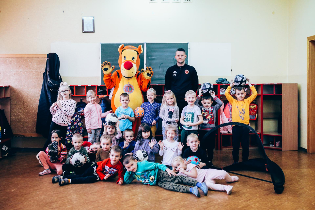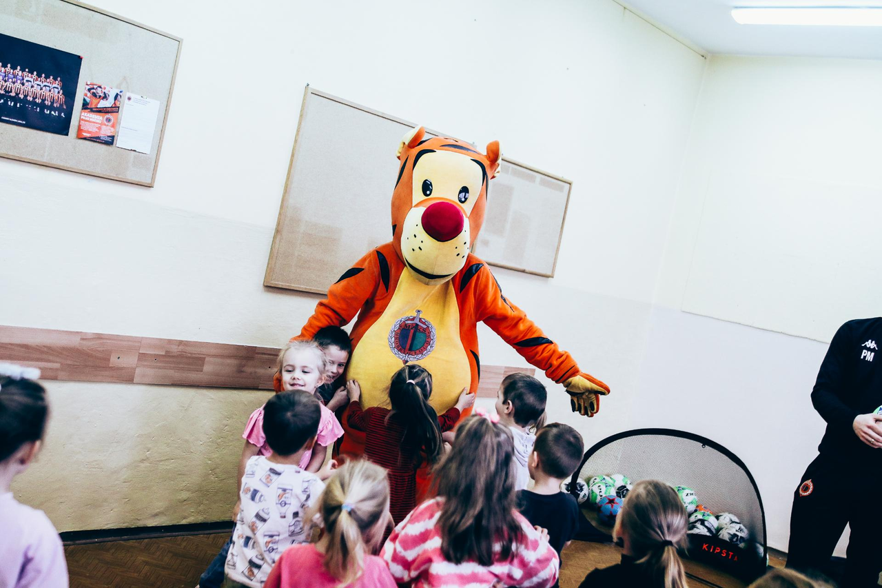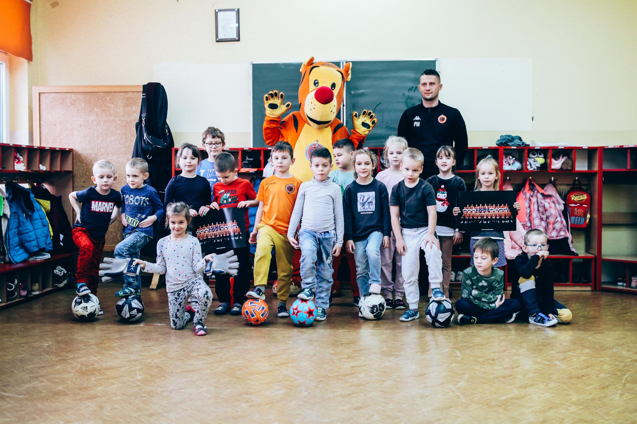 Trening Akademii z przedszkolakami z "piątki" Wraz z trenerem Chrobrego U-7 Pawłem Marszałkiem i klubową maskotką odwiedziliśmy dziś dzieci z Przedszkola Publicznego nr 5. 29-11-2022 11:25 autor: ŁJ Podzieliliśmy się wiedzą o piłce nożnej, bo wielu przedszkolaków wiedziało nawet z jakim numerem występuje Robert Lewandowski, pokazaliśmy stroje meczowe, specjalne buty z korkami i potrenowaliśmy z piłką, pokazując w ten sposób, jak wyglądają treningi w Akademii Piłki Nożnej Chrobrego dla najmłodszych. Zapraszamy do obejrzenia zdjęć z wizyty Akademii Piłki Nożnej u przedszkolaków.