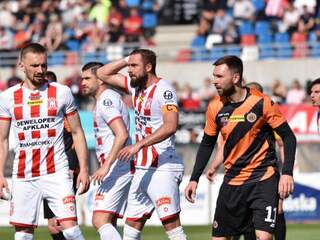 Bez punktów z ostatniej wyprawy W przedostatnim występie Chrobry przegrał z Resovią Rzeszów 0:1. Zadecydował gol z 16 minuty, po którym Pomarańczowo-Czarni mimo kilku prób głównie ze stałych fragmentów nie zdołali zdobyć przynajmniej wyrównującej… 05-06-2021 07:59 autor: ŁJ W przedostatnim występie Chrobry przegrał z Resovią Rzeszów 0:1. Zadecydował gol z 16 minuty, po którym Pomarańczowo-Czarni mimo kilku prób głównie ze stałych fragmentów nie zdołali zdobyć przynajmniej wyrównującej bramki.Pierwszą groźniejsza okazję stworzyli głogowianie. W 14 minucie niebezpieczną piłkę wzdłuż bramki posłał Marcel Ziemann. Blisko bramkarza był Damian Piotrowski, ale ostatecznie broniący Paweł Łakota uratował sytuację wybiciem poza linię końcową. Minęło 120 sekund i na prowadzeniu byli gospodarze. Po przejęciu piłki na połowie Chrobrego, dobre podanie w szesnastkę otrzymał Bartosz Jaroch i strzałem na dalszy słupek pokonał Rafała Leszczyńskiego.Do końca tej części wynik nie uległ zmianie, a najbliżej tego była Resovia. W ostatnich minutach groźnie z dystansu przymierzył Maksymilian Hebel, ale futbolówka poszybowała tuż nad poprzeczką. Późniejsza główka Olivera Praznovskyego po rzucie rożnym była nieco dalej od celu. Pomarańczowo-Czarni szukali swoich okazji, lecz poza tą przy stanie 0:0 w wykonaniu Marcela Ziemanna więcej poważniejszych nie mieli.1:0 zdecydowanie mogło być w 56 minucie. Wyrównującego gola prawie przyniosło rozegranie rzutu wolnego. Po dośrodkowaniu Mateusza Machaja głową uderzał po raz kolejny Oliver Praznovsky i tym razem był zdecydowanie bliżej trafienia, ale swoje między słupkami zrobił Paweł Łakota, wybijając na rzut rożny. Po chwili zza szesnastki futbolówkę tuż obok słupka posłał Robert Mandrysz. Chrobry wyraźniej przejął inicjatywę, lecz minuty mijały, a rezultat nie ulegał zmianie. Te zapędy też jakby utraciły na sile. Spróbowali miejscowi. W 72 minucie drugi raz w tym pojedynku z kilkunastu metrów strzelił Maksymilian Hebel, a Rafał Leszczyński odbił piłkę. W ostatnim kwadransie głogowianie zagrali na dwóch napastników, bo do Mikołaja Lebedyńskiego dołączył Damian Kowalczyk, ale nie przyniosło to oczekiwanej zmiany w tej najważniejszej statystyce. Choć raz jeszcze niewiele zabrakło Oliverowi Praznovskyemu. Aktywny przy stałych fragmentach obrońca kończył głową daleki wyrzut z autu Mavroudisa Bougaidisa, tyle że golkiper Resovii znów stanął na posterunku. Koniec końców punkty zostały w Rzeszowie. Dla Chrobrego to druga porażka 0:1 z rzędu.Do rozegrania pozostał jeszcze jeden mecz. W niedzielę 13 czerwca o godz. 12.40 Chrobry zmierzy się z Arką Gdynia i na tym sezon dobiegnie końca.