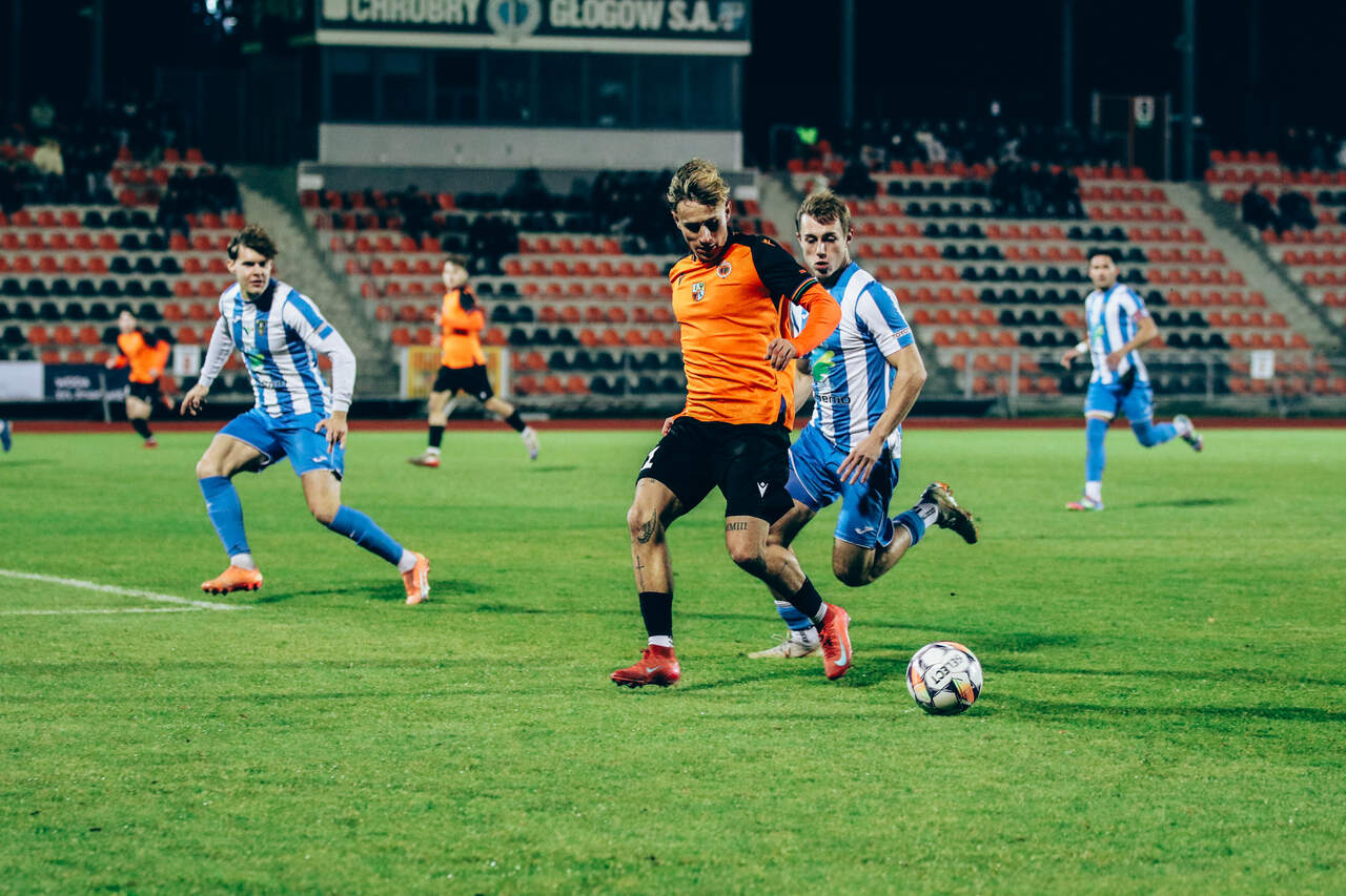 ChG II: cztery gole, piąte zwycięstwo z rzędu Zwycięstwo Chrobrego II w 15. kolejce Koleje Dolnośląskie 4 Lidze. Głogowianie pokonali Górnika Wałbrzych 4:1, a to już ich piąte ligowe zwycięstwo z rzędu. 05-11-2025 08:43 autor: ŁJ Do 45 minuty wynik nie uległ zmianie, choć sytuacji nie brakowało. Można było więc oczekiwać, że ten worek z bramkami rozwiąże się po przerwie. Zaczął Chrobry, który objął prowadzenie w 57. minucie, gdy wstrzelił się Kacper Szulc. Górnik odpowiedział trafieniem Michała Rzońcy w 63. minucie, ale po tym Pomarańczowo-Czarni w efektowny sposób postawili na swoim. Bramki Sebastian Francusa i Mateusza Machaja były przedniej urody i spokojnie obie mogłyby stanąć do konkursu na najładniejszą w rundzie. Wynik spotkania na 4:1 ustalił w 79 minucie Szymon Manijak. CHROBRY II GŁOGÓW - GÓRNIK WAŁBRZYCH 4:1 (0:0) 1:0 Szulc 57 1:1 Rzońca 63 2:1 Francus 68 3:1 Machaj 71 4:1 Manijak 79 CHROBRY II: Wróblewski - Janik, Łaszyński, Skowronek (90 Solecki), Tworzydło K. (46 Wojtal (60 Manijak)), Francus (89 Dajnowski), Szulc (76 Cichy), Antkowiak (46 Szczęsny), Bartecki, Kozłowski (83 Rosa), Machaj (76 Simkov). ŻÓŁTE KARTKI (CHROBRY II): Bartecki, Machaj, Manijak.