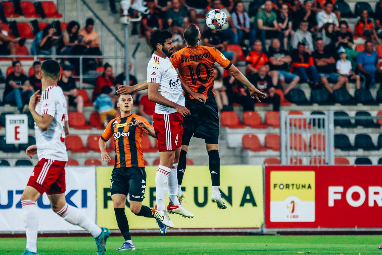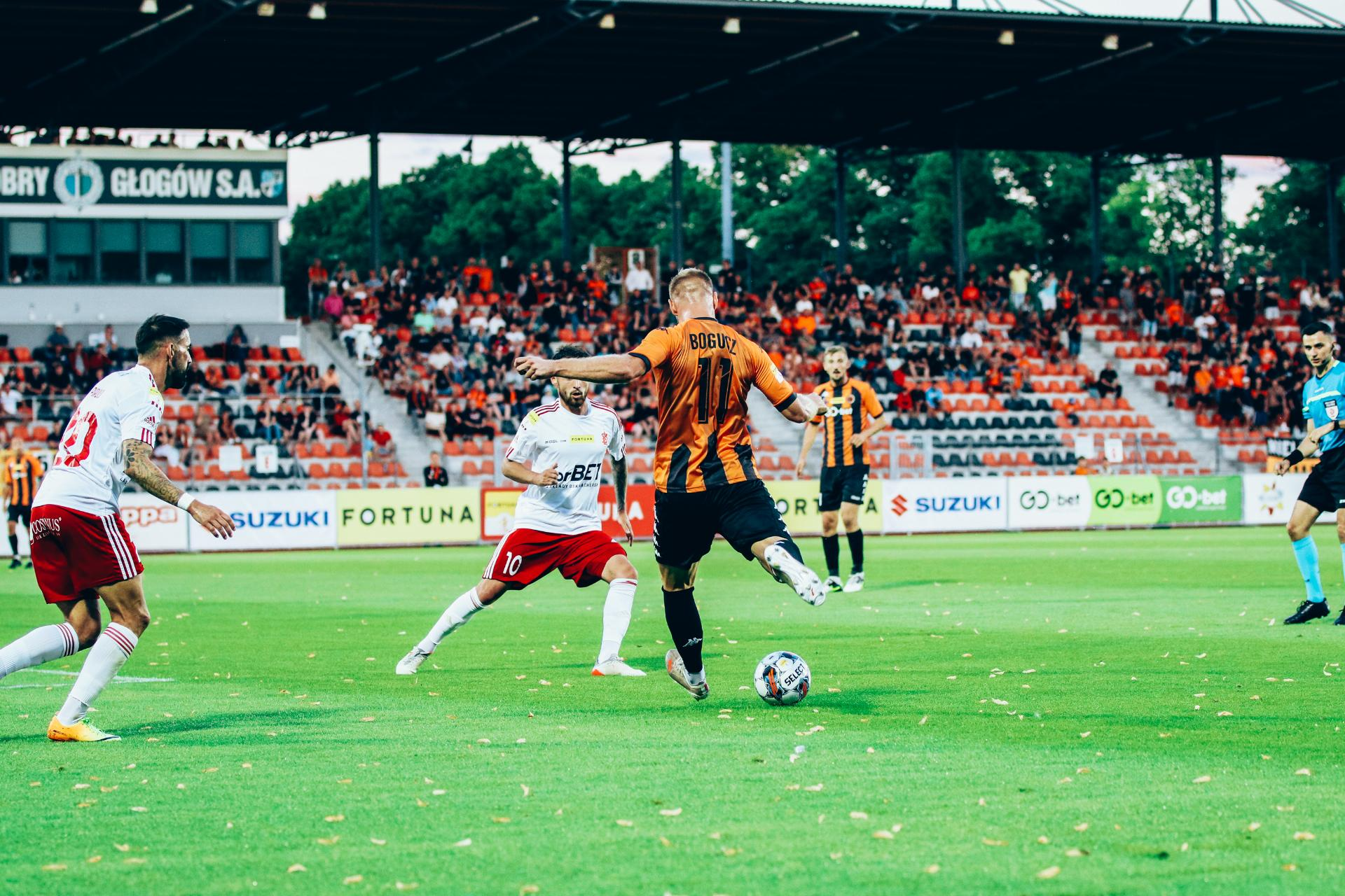 Efektowna pogoń nie została nagrodzona Dobry mecz, efektowna pogoń Chrobrego i pech w ostatniej akcji meczu. Chrobry - ŁKS 2:3. 06-08-2022 09:42 autor: ŁJ To był efektowny pościg Chrobrego do samego końca, włącznie z grą w jedenastu na połowie rywala, i szkoda że nie zostało to nagrodzone choćby punktem. Mateusz Bochnak zdobył dwa gole, mógł więcej, lecz z punktami pozostaje wygrywający 3:2 ŁKS Łódź. Po raz pierwszy w meczowej kadrze znalazł się nie tylko dołączony do drużyny w tym tygodniu Jakub Górski, ale też powracający do zdrowia Patryk Mucha. Z powodu kontuzji Patryk nie był do dyspozycji trenera w trzech dotychczasowych kolejkach. W samym składzie, w porównaniu do meczu z Chojniczanką, nastąpiła jedna zmiana na „pozycji” młodzieżowca, bo Dawida Hanca zastąpił Patryk Kusztal. Pierwsza połowa była dla Chrobrego… ciężka. ŁKS narzucił swoje tempo, a dający się zepchnąć do defensywy Chrobry już po kwadransie przegrywał 0:2. W 10 minucie miała miejsce pierwsza groźna sytuacja rywali, przy której bronił Karol Dybowski, jednak dosłownie sekundę wcześniej w szesnastce faulował Oliver Praznovsky. Został ukarany żółtą kartką, a zespół rzutem karnym, którego na gola zamienił Pirulo. Ten sam zawodnik pięć minut później podwyższył na 0:2, bliżej bramki kończąc drużynową akcję. Pomarańczowo-Czarni zaczęli się rozpędzać dopiero w końcowych minutach pierwszej odsłony i wypracowywali coraz większe zagrożenie, ale wynik nie uległ zmianie. To łodzianie na przerwę schodzili w komfortowej sytuacji. W drugiej połowie głogowianie zakasali rękawy i bardzo mocno wzięli się za odrabianie strat. Już w 51 minucie Mateusz Bochnak pięknym uderzeniem z pierwszej piłki, która po stałym fragmencie wyszła poza obręb szesnastki, pozwolił złapać kontakt. Chrobry próbował pójść za ciosem, cały czas napierał i pachniało wyrównującym golem. Zwłaszcza w 67 minucie. Wtedy na pierwszy plan mógł wysunąć się wchodzący na boisko chwilę wcześniej Paweł Tupaj, jednak zamykając wrzutkę na dalszy słupek trafił tylko w boczną siatkę. Nic tego ni zapowiadało, lecz gola zdobyli nie Pomarańczowo-Czarni, a łodzianie. W 76 minucie prowadzenie ŁKS-u podwyższył Mateusz Kowalczyk. Nawet to nie spowodowało, że z Chrobrego zeszło ciśnienie. Może trochę i tylko na jakiś czas, bo w 90 minucie Mateusz Bochnak po raz drugi pokonał golkipera gości. Czasu pozostawało niewiele, bo sędzia doliczył cztery minuty, choć w tym czasie działo się sporo. Karol Dybowski przy stałym fragmencie wbiegł nawet w pole karne rywali, a w ostatniej akcji meczu będący w świetnej sytuacji Mateusz Bochnak posłał futbolówkę za wysoko. Mógł zostać bohaterem tego pojedynku, lecz i tak należy pochwalić go za występ, a zespół za dobre widowisko z walką do samego końca. Przed Chrobrym bardziej intensywny tydzień, bo z dwoma meczami o ligowe punkty. W czwartek o godz. 18.00 spotkanie z Bruk-Bet Termaliką Nieciecza na stadionie rywala, a w niedzielę 14 sierpnia również o 18.00 z Podbeskidziem Bielsko-Biała na Wita Stwosza.