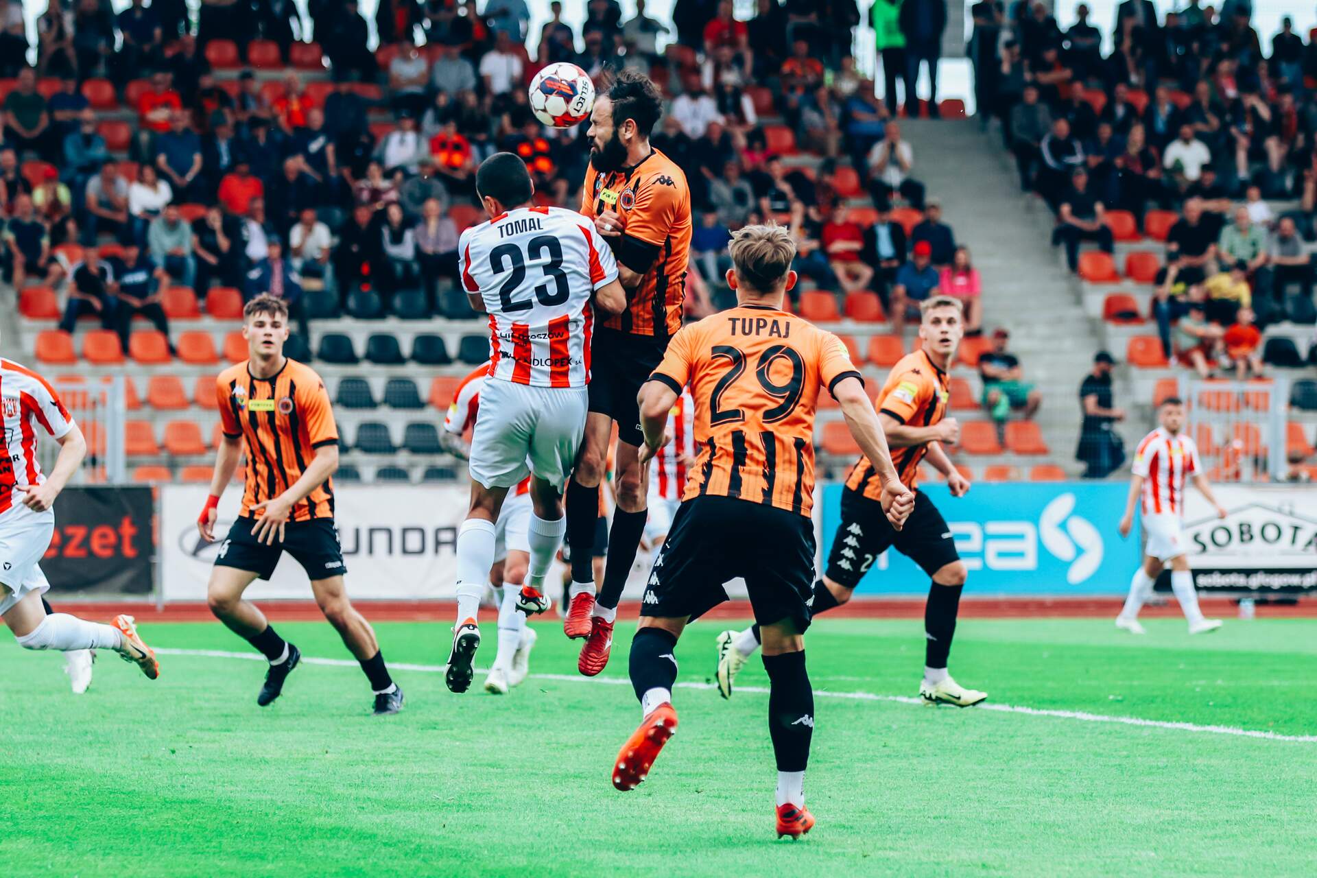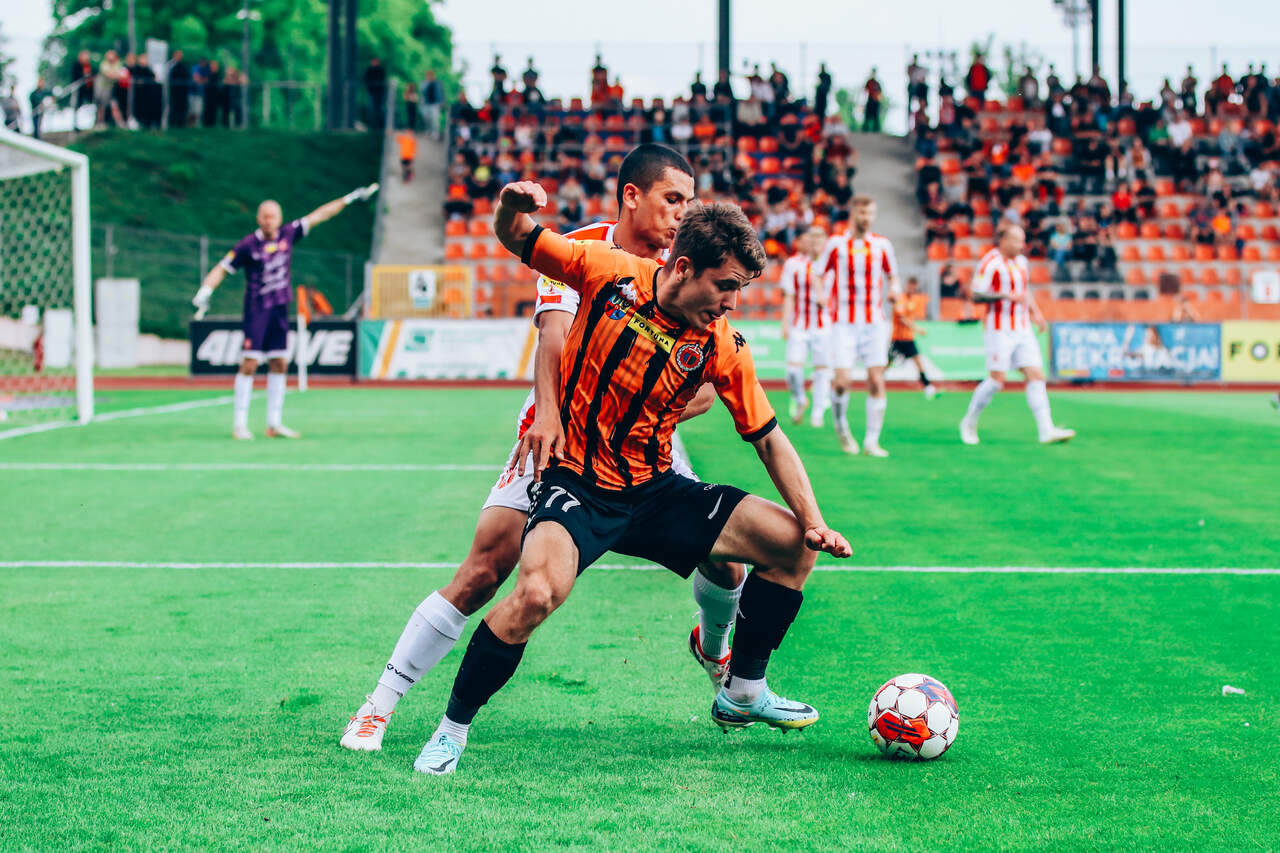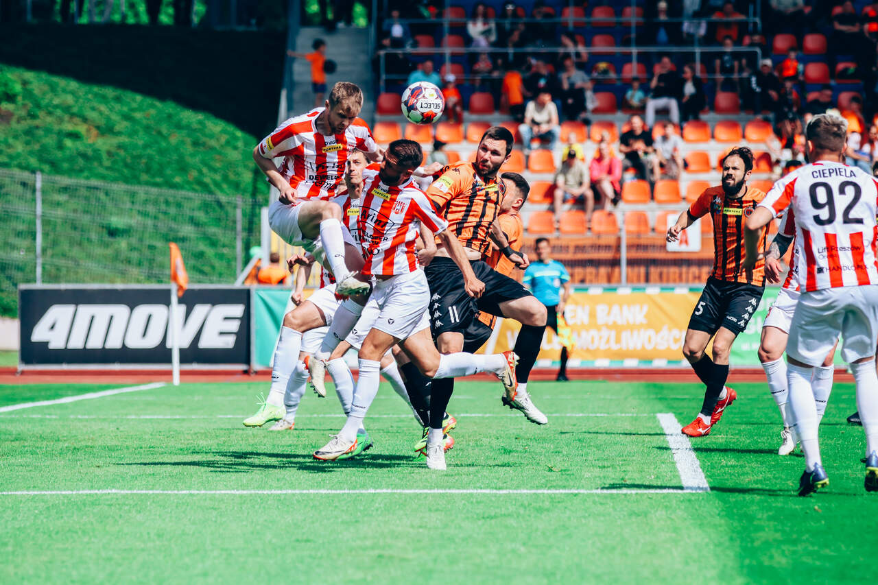 Remis z Resovią i coraz bliżej utrzymania Chrobry remisuje z Resovią Rzeszów 1:1. Dwie kolejki, pięć punktów przewagi, to się musi udać, choć walczyć trzeba do końca. 11-05-2024 04:55 autor: ŁJ Pod ścianą była przede wszystkim Resovia i to ona zagroziła jako pierwsza, bo w 16 minucie po strzale Adriana Łyszczarza musiał bronić Damian Węglarz. Ten strzał próbował jeszcze poprawić Bartłomiej Wasiluk, ale nie trafił w światło bramki. Po tym na boisku nie działo się aż tak dużo. Chrobry jednak cierpliwie wyczekał na swoją sytuację, która nadeszła w 36 minucie. Po podaniu Mateusza Machaja z futbolówką w pole karne odważnie ruszył Szymon Bartlewicz, sprawnie poradził sobie z rywalami i efektownie pokonał golkipera z Rzeszowa. Po 45 minutach Chrobry był na prowadzeniu. Pomarańczowo-Czarni dobrze weszli w drugą cześć. W 57 minucie do bramki trafił Mikołaj Lebedyński, choć ze względu na pozycję spaloną gol nie został uznany. Blisko bramki było 120 sekund później, gdy najpierw uderzenie Lebedyńskiego zostało zablokowane, a po poprawce w wykonaniu Bartosza Biela i rykoszecie futbolówka przeszła obok słupka. Resovia odpowiedziała w 62 minucie - wtedy Damian Węglarz interweniował po tym, jak strzelał Kalechukwu Ibe-Torti. Bezbłędny był za to chwilę później błyskawicznie strzelający po dograniu z boku Bartłomiej Eizenchart i od 66 minuty na stadionie w Głogowie mieliśmy remis. Strzelec wyrównującego gola dla rzeszowian mógł dodatkowo napsuć krwi w 70 minucie, jednak w tym przypadku posłał piłkę obok bramki. Chrobry też ma czego żałować. Trudno wytłumaczyć pechowy rozwój wydarzeń w 77 minucie. Z rzutu rożnego dośrodkowywał Patryk Mucha, a dwa razy wstrzelić się próbował Mavroudis Bougaidis. Najpierw piłka obiła słupek, dosłownie po chwili zawodnicy gości wybili ją tuż sprzed linii bramkowej… Duży pech, ale koniec końców Chrobry zostaje z punktem, który przybliża go do utrzymania. Do rozegrania pozostały już tylko dwa mecze. W poniedziałek 20 maja Chrobry zmierzy się w Bielsku-Białej z Podbeskidziem (godz. 18.00), a na koniec sezonu, w niedzielę 26 maja na Wita Stwosza, Chrobry - Zagłębie Sosnowiec (godz. 15.00).