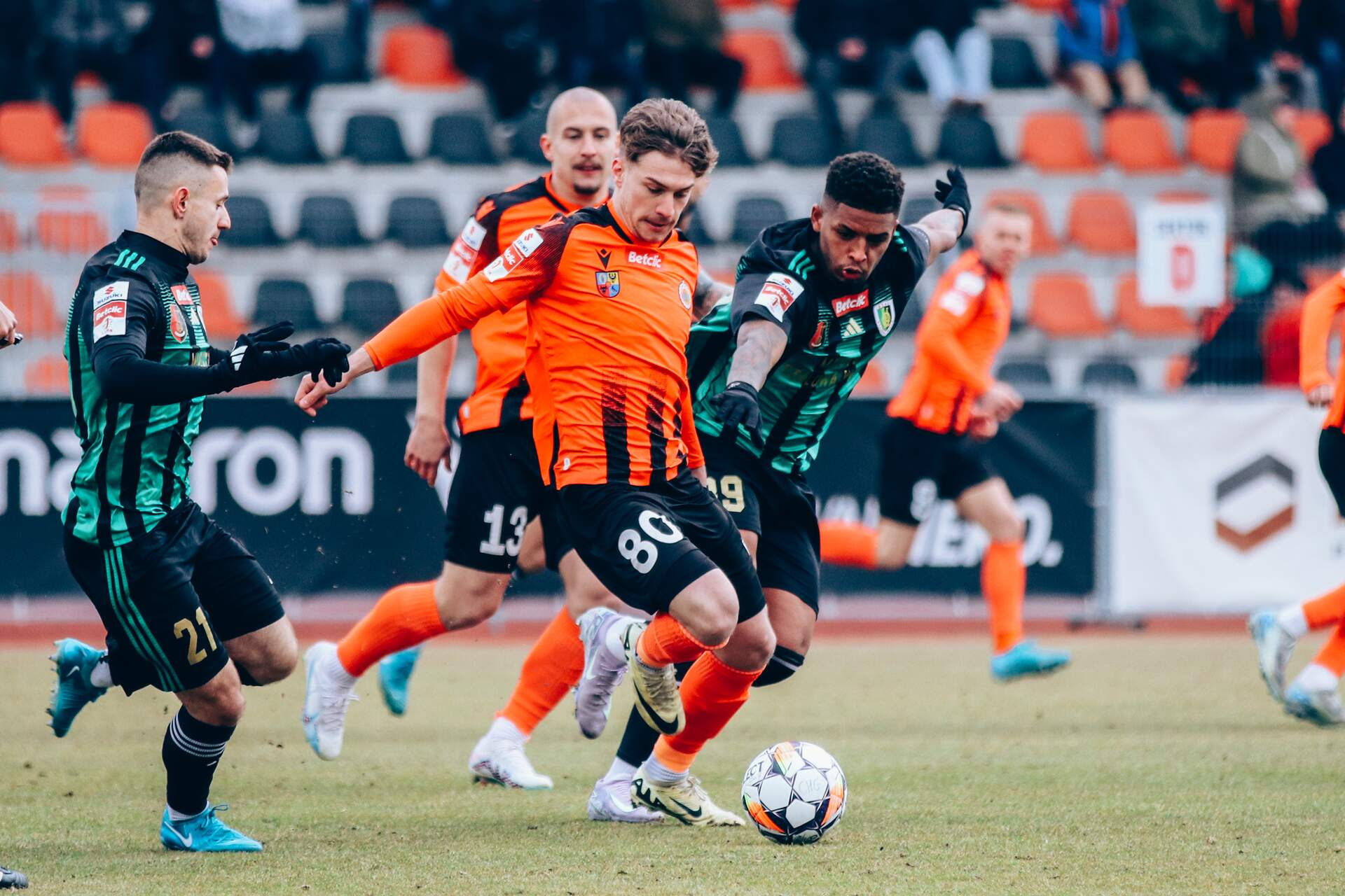 Bardzo ważne punkty zostają w Głogowie Chrobry staje na wysokości zadania i po golach dwóch Szymonów: Bartlewicza oraz Lewkota, wygrywa 2:0 mecz za "sześć punktów" ze Stalą Stalowa Wola. 02-03-2025 02:04 autor: ŁJ Chrobry do tego meczu przystąpił z dwiema zmianami w składzie. Do jedenastki powrócili Patryk Mucha z Mateuszem Lewandowskim. Poza kadrą pozostali natomiast kontuzjowani Mavroudis Bougaidis oraz Albert Zarówny. Pierwsza połowa należała do bardzo wyrównanych. Dało się odczuć wagę tego spotkania w kontekście utrzymania i nikt mocno nie zaryzykował. Długo żadna ze stron nie mogła wypracować klarowanej sytuacji. Strzały były, jak ten Przemysława Szarka, ale nie tak oczywiste, aby myśleć o prowadzeniu. Dopiero w końcówce głogowianie przejęli piłkę po rzucie rożnym gości, a po tym sam na sam z bramkarzem Stali wychodził Szymon Bartlewicz. W ostatnim momencie dogonił go zawodnik rywali i wybił tę piłkę, a tym samym całą kontrę z rytmu. Dużo zmieniła przerwa. Zaraz po niej Chrobry w świetnym stylu zameldował się na murawie i już po upływie siedmiu minut prowadził 2:0. W 46 minucie jako pierwszy w tym meczu trafił Szymon Bartlewicz, wykorzystując dogranie Patryka Szwedzika, a w 52 minucie prowadzenie głogowian po podaniu Patryka Muchy podwyższył Szymon Lewkot, który przecież pierwszą odsłonę spędził na ławce. Mający 2:0 Chrobry spokojnie starał się kontrolować wynik tego spotkania i choć Stal próbowała odpowiedzieć, nie miała ku temu aż tak dużych szans. W tych nielicznych bramkarzy Chrobrego - bo kontuzjowanego Pawła Lenarcika musiał zastąpić Dawid Arndt - nie zdołali pokonać uderzający Michał Walski czy Kelechukwu Ibe-Torti. Tym sposobem bardzo, ale to bardzo ważne punkty pozostały w Głogowie. Chrobry w większym spokoju, bo po wyjściu ze strefy spadkowej, może szykować się do kolejnego występu. A ten w niedzielę 9 marca - o godz. 17.00 w Rzeszowie głogowianie będą podejmowani przez kolejną w tej lidze Stal.