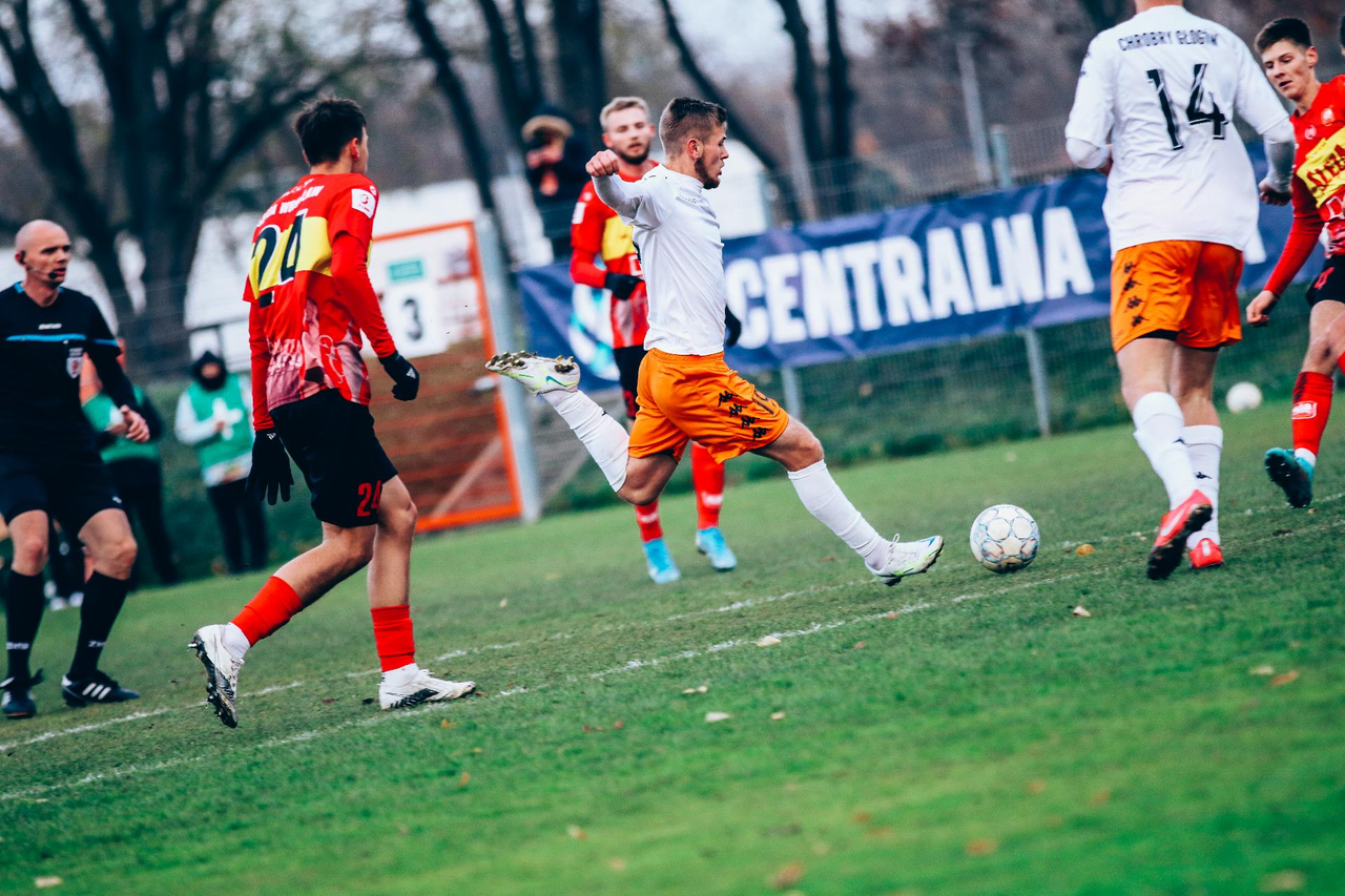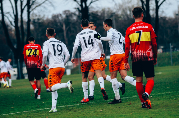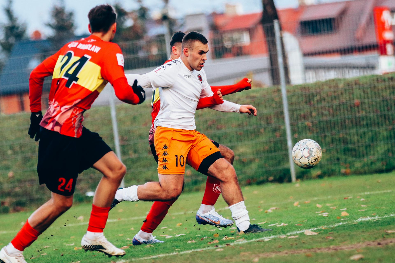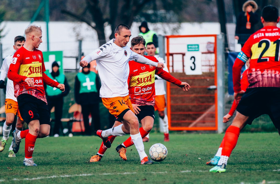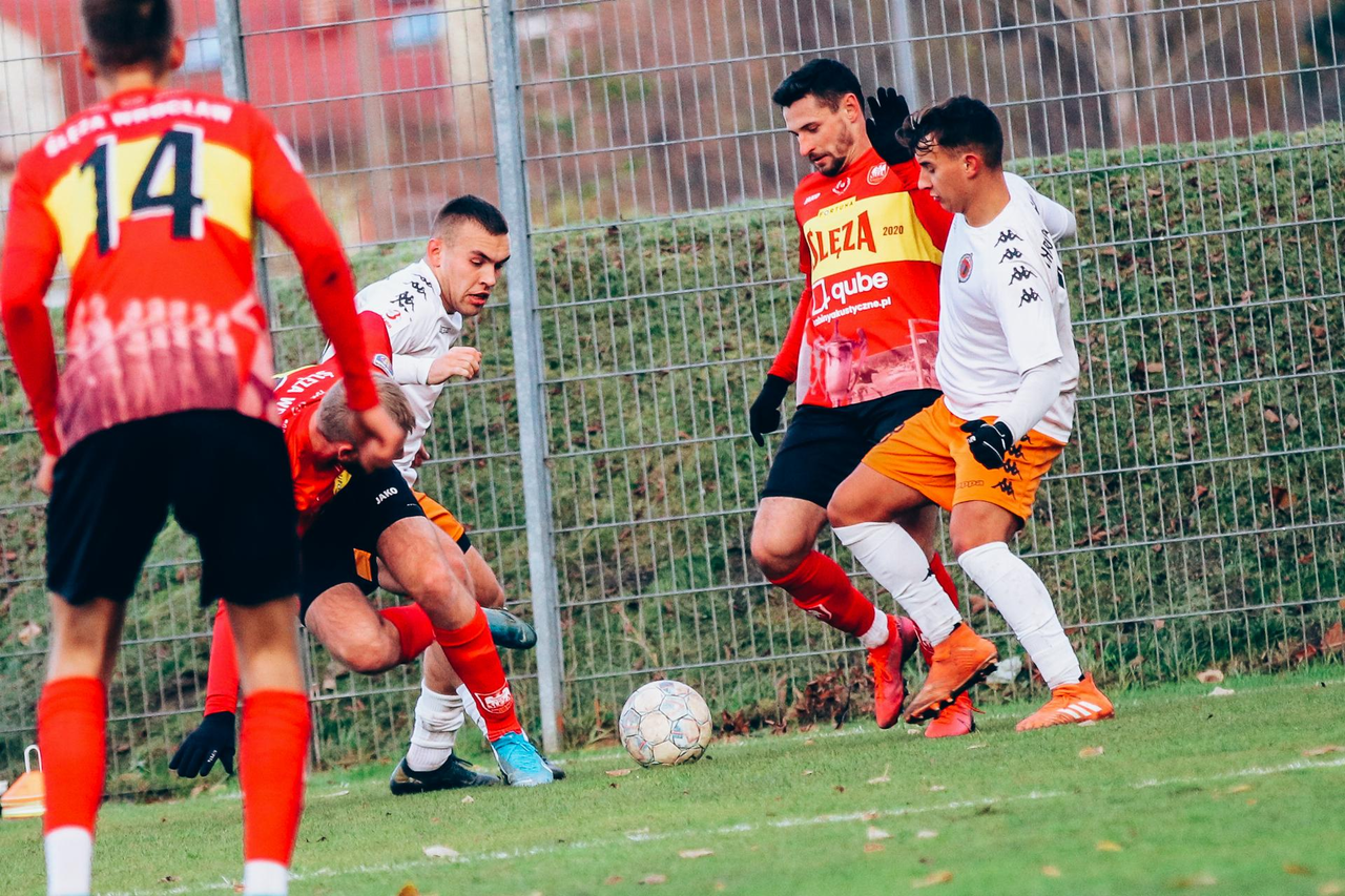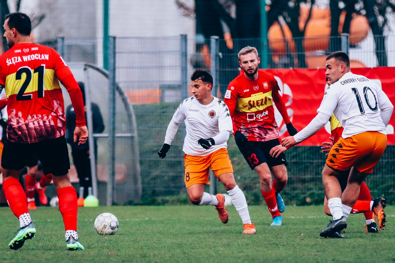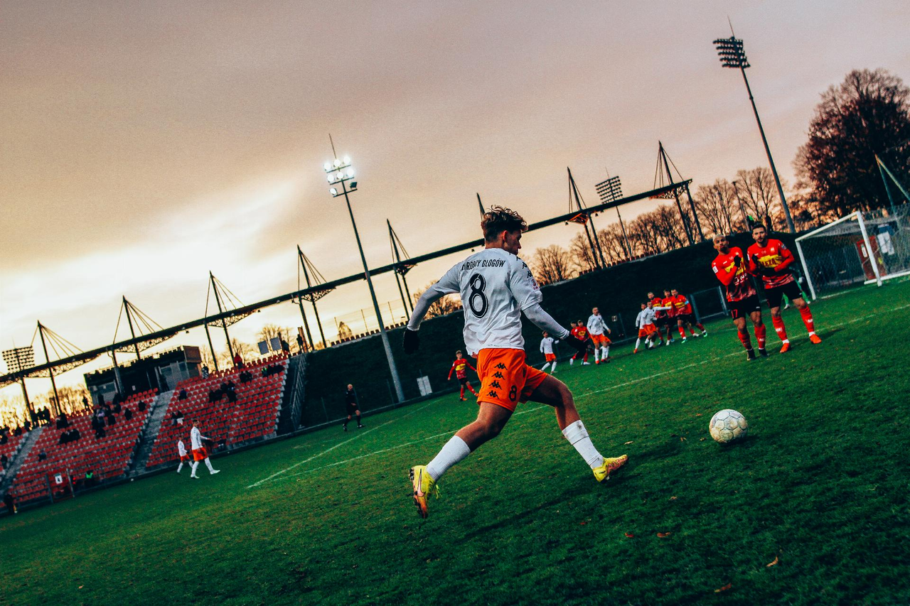 3 Liga: na finiszu porażka, ale i optymizm Chrobry – Ślęza 1:2 w ostatniej jesiennej kolejce. Ciąg dalszy w przyszłym roku. 19-11-2022 04:15 autor: ŁJ Chrobry II kończy zmagania w rundzie jesiennej 3 Ligi i choć w ostatnim występie musiał uznać wyższość rywali, to był dla niego dobry okres. Głogowianie do rundy wiosennej debiutanckiego sezonu będą na bezpiecznej 14 pozycji. Pierwsza połowa meczu ze Ślęzą była widowiskowa. Już po 20 minutach wrocławianie prowadzili 2:0. W 16 minucie Bartka Szafera z rzutu karnego pokonał Maciej Tomaszewski, choć głogowski bramkarz był blisko obrony. Cztery minuty później prowadzenie Ślęzy podwyższył „Vinicius Matheus”. Szybko więc sytuacja Chrobrego zrobiła się trudna, ale wtedy sprawy w swoje ręce wziął Tomasz Wojciechowski, który sam w polu karnym minął rywali i mocnym uderzeniem zdobył kontaktowego gola. Niewiele zabrakło, aby jeszcze w tej części zrobiło się 2:2, jednak mimo świetnych okazji Miłosza Jóźwiaka czy Adriana Marciniaka nie udało się pójść w ten sposób za ciosem. Szkoda zwłaszcza szansy Adriana Marciniaka, bo po jego strzale piłka odbijała się od poprzeczki i słupka. Po zmianie stron głogowianie przejęli inicjatywę i wyraźnie szukali swoich szans. Ciężko jednak było o rozmontowanie defensywy Ślęzy, w której nie zabrakło dużego doświadczenia w osobie Adama Samca. Tak naprawdę mimo dużo większej przewagi Pomarańczowo-Czarni mieli mniej okazji, niż w pierwszej połowie. Jakub Cieślicki przymierzył niecelnie, a w doliczonym czasie wychodzący sam na sam Michał Fryzowicz nie zdołał opanować piłki. Skończyło się więc na wygranej Ślęzy. Chrobry przerwę zimową spędzi na 14 pozycji, co – biorąc pod uwagę pierwszy na tym poziomie sezon – jest dobrym osiągnięciem. Głogowianie pomimo trudnego startu i czterech porażek w czterech pierwszych kolejkach z każdym kolejnym miesiącem prezentowali się coraz lepiej, opuścili strefę spadkową, potrafili urywać punkty nawet czołówce, więc przed nimi optymistyczne przygotowania do dalszej części sezonu. CHROBRY II GŁOGÓW – ŚLĘZA WROCŁAW 1:2 (1:2) 0:1 Tomaszewski 16 (k) 0:2 Vinicius Matheus 20 1:2 Wojciechowski 22 CHROBRY II: Szafer – Iwanowicz (46 Fryzowicz), Malczuk, Wawrzyniak, Jandziak, Pieczarka, Marciniak (84 Matysiak), Wojciechowski, Bartlewicz (63 Zygmunt), Cieślicki, Jóźwiak (84 Inoue). ŚLĘZA: Gasztyk – Stempin, Marcjan (82 Wroński), Wawrzyniak, Olek, Maciołek, Vinicius Matheus (82 Krukowski), Samiec, Tomaszewski, Fediuk, Kluzek. ŻÓŁTE KARTKI: Wawrzyniak, Jandziak, Krawiec – Tomaszewski, Maciołek, Krukowski. ZOBACZ TABELĘ 3 LIGI