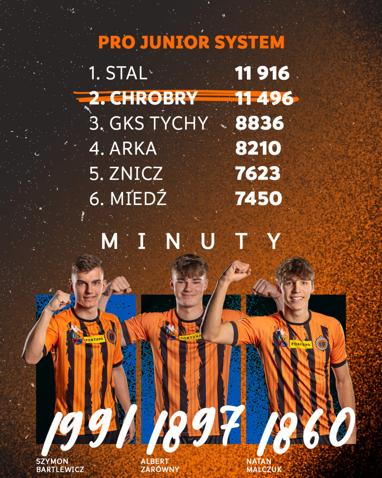 Drugie miejsce klubu w Pro Junior System Chrobry Głogów zajął drugie miejsce w klasyfikacji promującej grę młodzieżowców Pro Junior System. To trzeci sezon z rzędu, w którym znajduje się w czołowej piątce pierwszoligowców pod tym względem. 05-06-2024 04:07 autor: W tym sezonie do podstawowego składu Chrobrego należało aż trzech piłkarzy wywodzących się z grup młodzieżowych Akademii Piłki Nożnej i Szkoły Mistrzostwa Sportowego Chrobry. Niemal 2000 minut w Fortuna 1 Lidze rozegrali 18-letni Szymon Bartlewicz, 19-letni Albert Zarówny i 21-letni Natan Malczuk. Dodatkowo, choć klasyfikacja takiej liczby nie uwzględnia, swoje „pięć minut” miał też inny 19-latek: Eryk Pieczarka, którego wprowadzono na boisko w dwóch spotkaniach. Warto też dodać, że za tymi wszystkimi występami stoją inne, jeszcze ważniejsze dla zespołu liczby, bo pierwsza trójka wpisywała się na listę strzelców. Siedem bramek zdobył Bartlewicz, trzy Zarówny, a jedną Malczuk. W Pro Junior System sumuje się minuty młodzieżowców, a ta suma daje liczbę, na podstawie której powstaje klasyfikacja. Chrobry uzyskał w niej 11496 punktów, co w pierwszoligowym zestawieniu daje drugie miejsce, tuż za Stalą Rzeszów. Taka liczba jest też efektem tego, że w PJS „podwójnie” punktuje się występy wychowanków, a w przypadku Chrobrego wszyscy młodzieżowcy mają taki status. Również w 4 Lidze, w której występuje Chrobry II Głogów, klub jest w czołówce PJS. Z 14 553 punktami zajmuje drugą pozycję. Czołówka klasyfikacji PJS: 1. Stal Rzeszów - 11 916 pkt. 2. Chrobry Głogów - 11 496 pkt. 3. GKS Tychy - 8836 pkt. Występy młodzieżowców: 1. Szymon Bartlewicz - 31 meczów 2. Albert Zarówny - 23 mecze 3. Natan Malczuk - 21 meczów 4. Eryk Pieczarka - 2 mecze