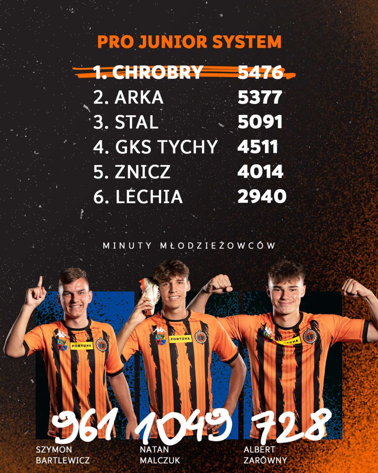 Chrobry pierwszy w Pro Junior System Chrobry Głogów zajmuje pierwsze miejsce w klasyfikacji promującej grę młodzieżowcami Pro Junior System. 21-12-2023 12:04 autor: ŁJ Chrobry przesunął się na pierwsze miejsce po meczu w Sosnowcu. W podstawowej jedenastce wyszedł nie tylko Natan Malczuk, ale też Albert Zarówny, dla którego był to 10 występ w tym sezonie Fortuna 1 Ligi. A minimum 10 rozegranych spotkań oraz 450 minut stanowią podstawowe kryteria PJS, po spełnieniu których dany klub punktuje w klasyfikacji. Rzutem na taśmę @ChrobryGlogowSA kończy rok jako lider PJS!🆕 Klasyfikacja Pro Junior System w @_1liga_ na podst. @90minut_pl ⤵️ pic.twitter.com/WjVsWrTyYz— Bartosz Urban (@naszpicy) December 20, 2023 W tym sezonie Chrobry odważnie gra swoimi młodzieżowcami z Akademii Piłki Nożnej i Szkoły Mistrzostwa Sportowego Chrobry. 16 meczów rozegrał Szymon Bartlewicz, 12 Natan Malczuk, a 10 Albert Zarówny. Zyskują zawodnicy, którzy w ten sposób rozwijają swoje kariery, zyskuje też klub, bo najwyższe miejsca w PJS są nagradzane finansowo, a jedna bramka Alberta Zarównego czy trzy asysty Szymona Bartlewicza są w tym sezonie pomocne. Czwartym grającym młodzieżowcem Chrobrego jest Eryk Pieczarka. Do tej pory zagrał w dwóch meczach, więc oficjalnie ranking jeszcze go nie uwzględnia. Klasyfikacja do końca sezonu będzie ulegać zmianie i nie jest przesądzone, że Chrobry pozostanie na czele, ale obecna sytuacja potwierdza prowadzoną przez klub politykę. Już w poprzednim sezonie Chrobry był czwarty w PJS, a w sezonie 2021/22 zajął drugie miejsce.