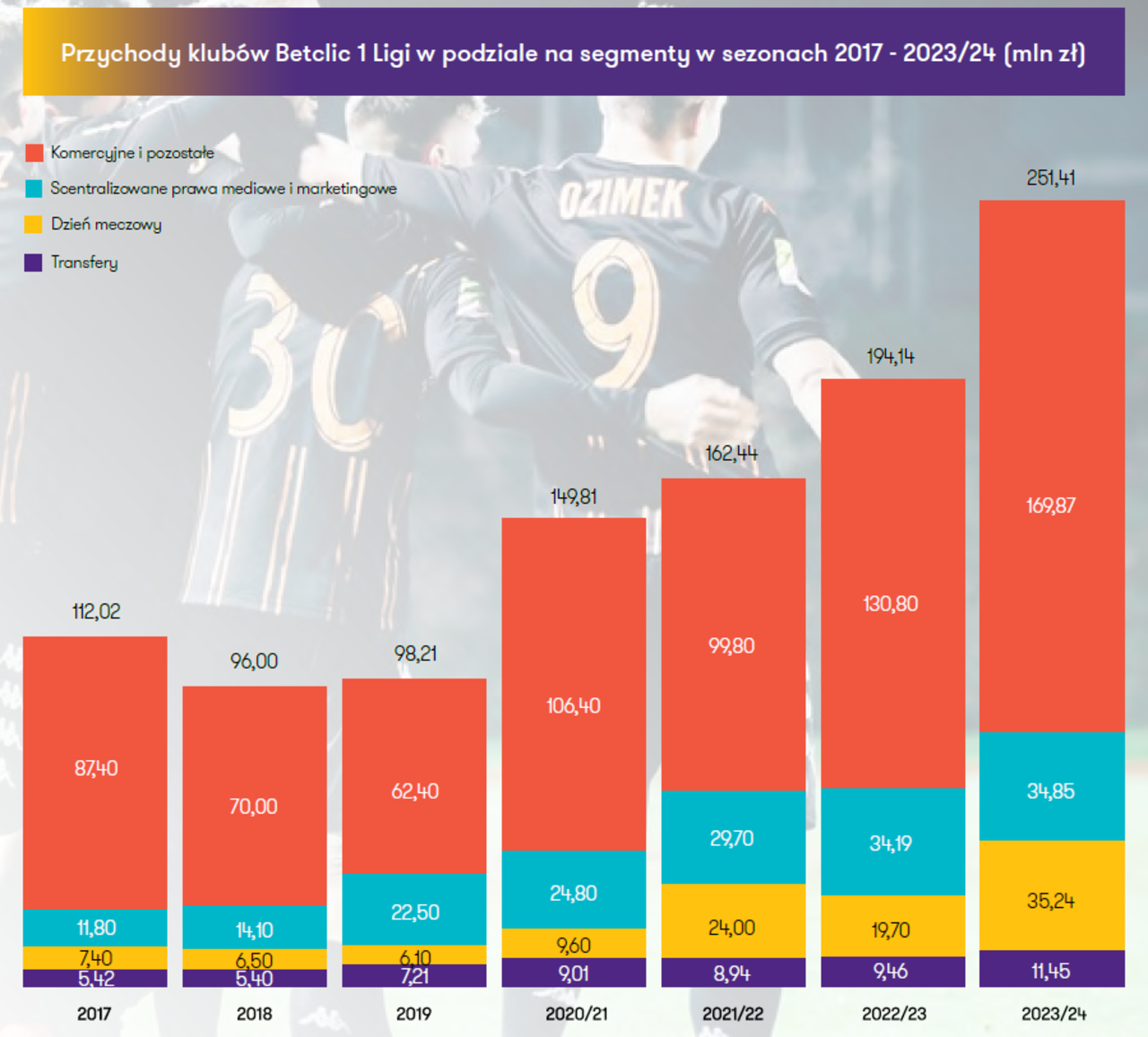 Ćwierć miliarda przychodów pierwszoligowych klubów (raport) Pod względem budżetowym ostatni sezon był najlepszym w historii Betclic 1 Ligi. Kluby osiągnęły 251 mln zł przychodów ogółem, czyli o 29% więcej niż w rekordowym do tej pory sezonie 2022/2023 – wynika z raportu „Finansowa pierwsza liga”, przygotowanego przez firmę audytorsko-doradczą Grant Thornton we współpracy z Pierwszą Ligą Piłkarską. 05-11-2024 05:24 autor: ŁJ Jak wynika z danych zebranych od klubów, w sezonie 2023/2024 przychody ogółem klubów biorących udział w rozgrywkach Betclic 1 Ligi przekroczyły 251 mln zł (dane nie uwzględniają klubu Bruk-Bet Termalica Nieciecza, który nie zdecydował się udostępnić danych). To zdecydowanie najwyższy wynik w historii – o 29% wyższy niż w sezonie poprzednim i o 156% wyższy niż cztery lata temu. Nawet jeśli uwzględnić podwyższoną inflację w Polsce w ostatnich latach, tzn. 5% w trakcie ostatniego sezonu oraz 39% w ostatnich 4 latach, wzrost ten jest imponujący. - Wraz z sezonem 2023/24 zakończył się pewien etap w rozwoju 1 Ligi. Po – odpowiednio – dziewięciu i siedmiu latach zakończyła się współpraca Polskiego Związku Piłki Nożnej i Pierwszej Ligi Piłkarskiej ze strategicznymi partnerami rozgrywek: Telewizją Polsat i firmą Fortuna. Ostatni rok wspólnego działania jeszcze bardziej wzmocnił pierwszoligowe środowisko, co znalazło odzwierciedlenie nie tylko w rosnącej frekwencji czy rekordowej liczbie transmisji, ale także w znaczącym wzroście wartości przychodów generowanych przez kluby – komentuje Marcin Janicki, prezes zarządu Pierwszej Ligi Piłkarskiej. Największym źródłem przychodów klubów pierwszoligowych były – podobnie jak w poprzednich latach - tzw. przychody komercyjne, a więc przede wszystkim wpływy od reklamodawców czy sponsorów wynikające z umów podpisanych bezpośrednio przez klub. W sezonie 2023/2024 wyniosły one 170 mln zł, czyli stanowiły 68% generowanych wpływów ogółem, a w porównaniu z sezonem 2022/2023 wzrosły o 30% (39 mln zł). To pokazuje, że kluby Betclic 1 Ligi w coraz bardziej profesjonalny sposób przyciągają biznes i potrafią przekonać firmy do wykorzystania ich możliwości promocyjnych. Dzień meczowy, dniem przychodowym Drugim największym segmentem przychodów były w tym roku tzw. przychody z dnia meczowego, a więc uzyskane np. ze sprzedaży biletów czy usług cateringowych. Wzrosły przez rok o 79% i sięgnęły 35,2 mln zł. To skutek wysokiej frekwencji na meczach (o czym dalej), ale też rozwoju infrastruktury stadionowej i coraz wyższej specjalizacji komórek odpowiadających w klubach za komercjalizację dnia meczowego. Skokowy wzrost przychodów z tego segmentu po raz pierwszy wyprzedził trzeci segment przychodów klubów, a więc tzw. scentralizowane prawa mediowe i marketingowe. Są to wpływy, jakie kluby otrzymują od Pierwszej Ligi Piłkarskiej z tytułu centralnie zawieranych umów dotyczących transmisji czy kontraktów reklamowych i sponsorskich. Wpływy te również wzrosły, choć w mniejszym stopniu niż w poprzednich dwóch segmentach – wyniosły 34,9 mln zł wobec 34,2 mln zł przed rokiem. - W ostatnim sezonie kluby Betclic 1 Ligi postawiły kolejny krok w stronę rozwoju biznesowego. Osiągnęły wzrost przychodów we wszystkich badanych przez nas kategoriach. Cieszy zwłaszcza fakt, że coraz skuteczniej pozyskują własnych sponsorów i coraz lepiej potrafią zarabiać na samej organizacji meczu, nie tylko przyciągając kibiców na stadiony, ale też organizując kluby biznesowe czy sprzedając możliwość oglądania meczów w lożach VIP – komentuje Tomasz Mleczak, partner w zespole Corporate Finance w Grant Thornton. Pierwszoligowe stadiony coraz mocniej zapełnione Co ważne, na stadionach klubów Betclic 1 Ligi kolejny rok z rzędu dynamicznie rośnie również frekwencja. W minionym sezonie na trybunach zasiadło łącznie 1,5 mln kibiców, a jeden mecz ligowy oglądało średnio 4,4 tys. osób, czyli o 26% więcej niż rok wcześniej i o 58% więcej niż dwa sezony temu. To efekt nie tylko rosnącej popularności rozgrywek wśród kibiców, ale też rozwoju stadionów i innej infrastruktury klubów. - Popyt na emocje sportowe po pandemii z roku na rok w Polsce rośnie, a Betclic 1 Liga i jej kluby pokazuję, że coraz lepiej potrafią tę falę wykorzystać, aby rozwijać się na polu biznesowym i finansowym. A to oznacza jeszcze lepiej skrojoną pod potrzeby kibica ofertę i profesjonalną jej realizację w praktyce. Oczywiście nadal przestrzeń do poprawy jest duża, wiele klubów nadal zmaga się niewystarczającymi budżetami, ale postęp w ostatnich latach jest widoczny – mówi Łukasz Słyż, menedżer w Departamencie Audytu w Grant Thornton. Wisła Kraków z przychodowym mistrzostwem Choć Wisła Kraków nie zdołała awansować do PKO BP Ekstraklasy, to pod względem biznesowym krakowski klub w minionym sezonie utrzymał tytuł lidera, z ogromną przewagą nad resztą klubów. Osiągnął przychody ogółem na poziomie 45,8 mln zł, czyli o prawie 10 mln zł więcej niż w poprzednim sezonie i prawie dwukrotnie więcej niż kolejne dwa kluby w rankingu. Biała Gwiazda ze swoimi przychodami spokojnie odnalazłaby się nawet w Ekstraklasie – w minionym sezonie taki wynik dałby jej wysokie 10. miejsce wśród klubów najwyższej ligi. Wisła sukces ten zawdzięcza przede wszystkim wysokim przychodom komercyjnym, głównie z umów sponsorskich i reklam, które przyniosły jej 27,7 mln zł. Jak pokazują prezentowane w raporcie dane firmy Pentagon Research, Biała Gwiazda w trakcie sezonu aż 666,1 tys. razy wyeksponowała marki swoich sponsorów oraz wygenerowała dla swojego miasta, Krakowa, wartość promocyjną szacowaną na 95,5 mln zł (teoretycznie tyle musiałby zapłacić urząd miasta Krakowa za reklamy w mediach, aby osiągnąć analogiczną korzyść wizerunkową). Według danyc