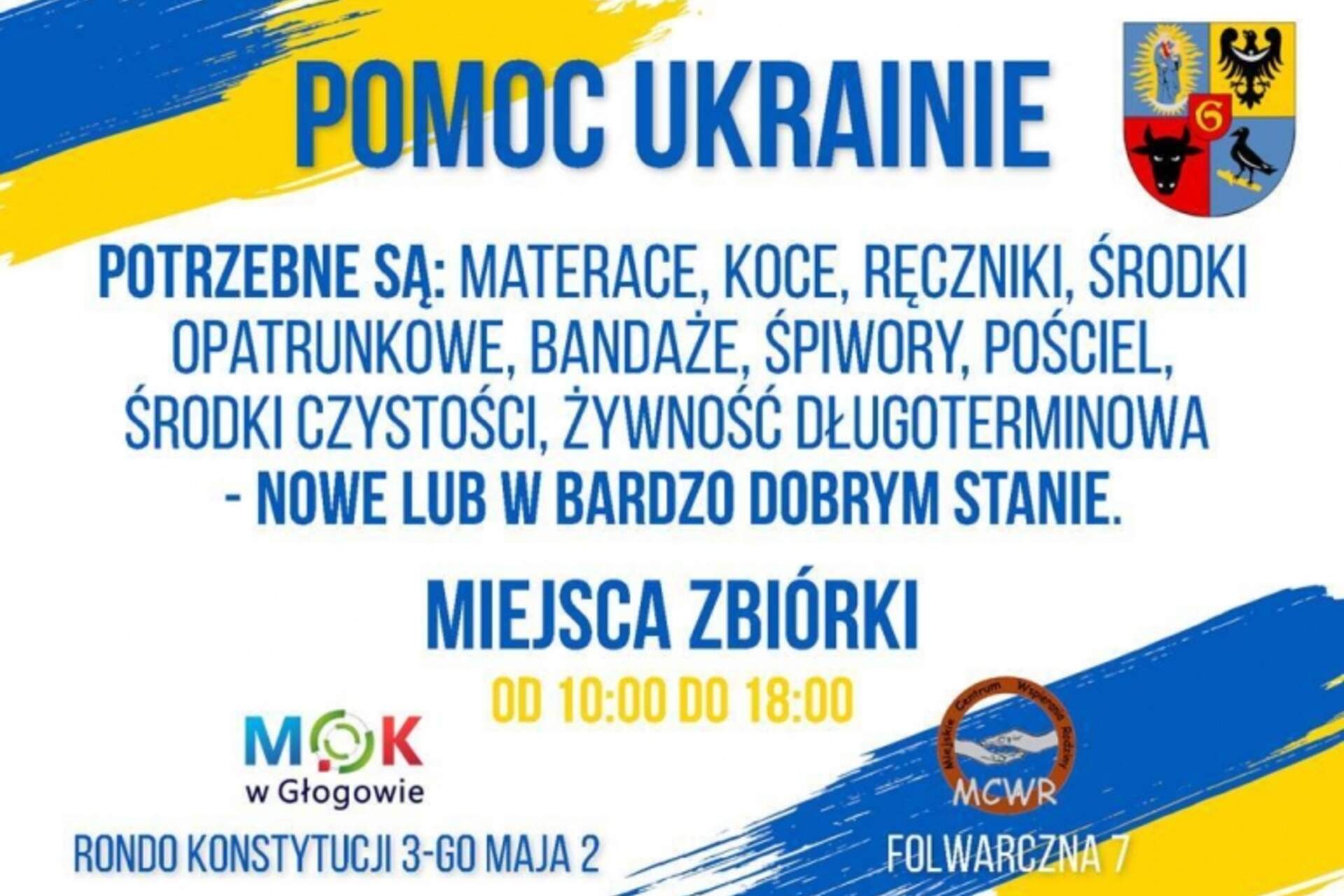 Głogów dla Ukrainy Ukraiński Kamieniec Podolski jest partnerskim miastem Głogowa, więc nasze miasto organizuje zbiórkę najpotrzebniejszych rzeczy, które trafią do objętego wojną kraju. Głogów przygotowuje transport do Kamieńca Podolskiego i… 27-02-2022 11:22 autor: ŁJ Ukraiński Kamieniec Podolski jest partnerskim miastem Głogowa, więc nasze miasto organizuje zbiórkę najpotrzebniejszych rzeczy, które trafią do objętego wojną kraju. Głogów przygotowuje transport do Kamieńca Podolskiego i uruchomił dwa magazyny, w których prowadzona jest zbiórka dla sąsiadów: w Miejskim Ośrodku Kultury oraz w Miejskim Centrum Wspierania Rodziny w godz. 10.00-18.00. - Bardzo wiele osób, instytucji, organizacji pozarządowych, zakładów pracy zaczyna organizować pomoc dla Ukrainy. My jako urząd miejski i nasze jednostki również chcemy się włączyć w tę akcję, tym bardziej, że nasze miasto partnerskie - Kamieniec Podolski - zwróciło się do nas z prośbą o pomoc, żeby dostarczyć im niezbędne rzeczy do szpitala, a także dla mieszkańców - powiedział prezydent Głogowa Rafael Rokaszewicz. Lista potrzebnych rzeczy:MateraceŚpiworyKocePościelRęcznikiŚrodki Opatrunkowe (bandaże i środki odkażające,)Środki czystościŻywność długoterminowa(prosimy, aby przynoszone rzeczy były nowe lub w bardzo dobrym stanie)