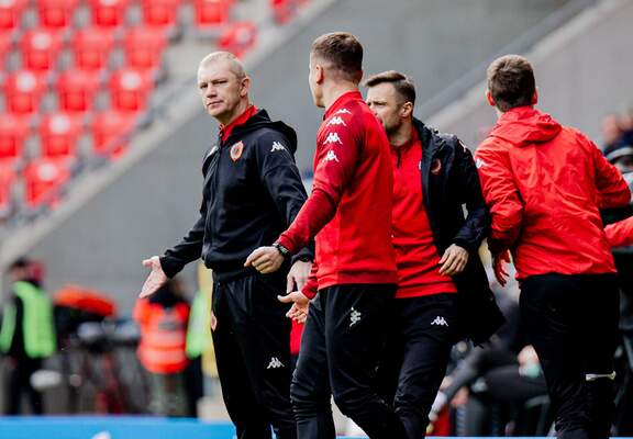 Trenerzy Piotr Plewnia i Mariusz Misiura po meczu Chrobrego ze Zniczem.