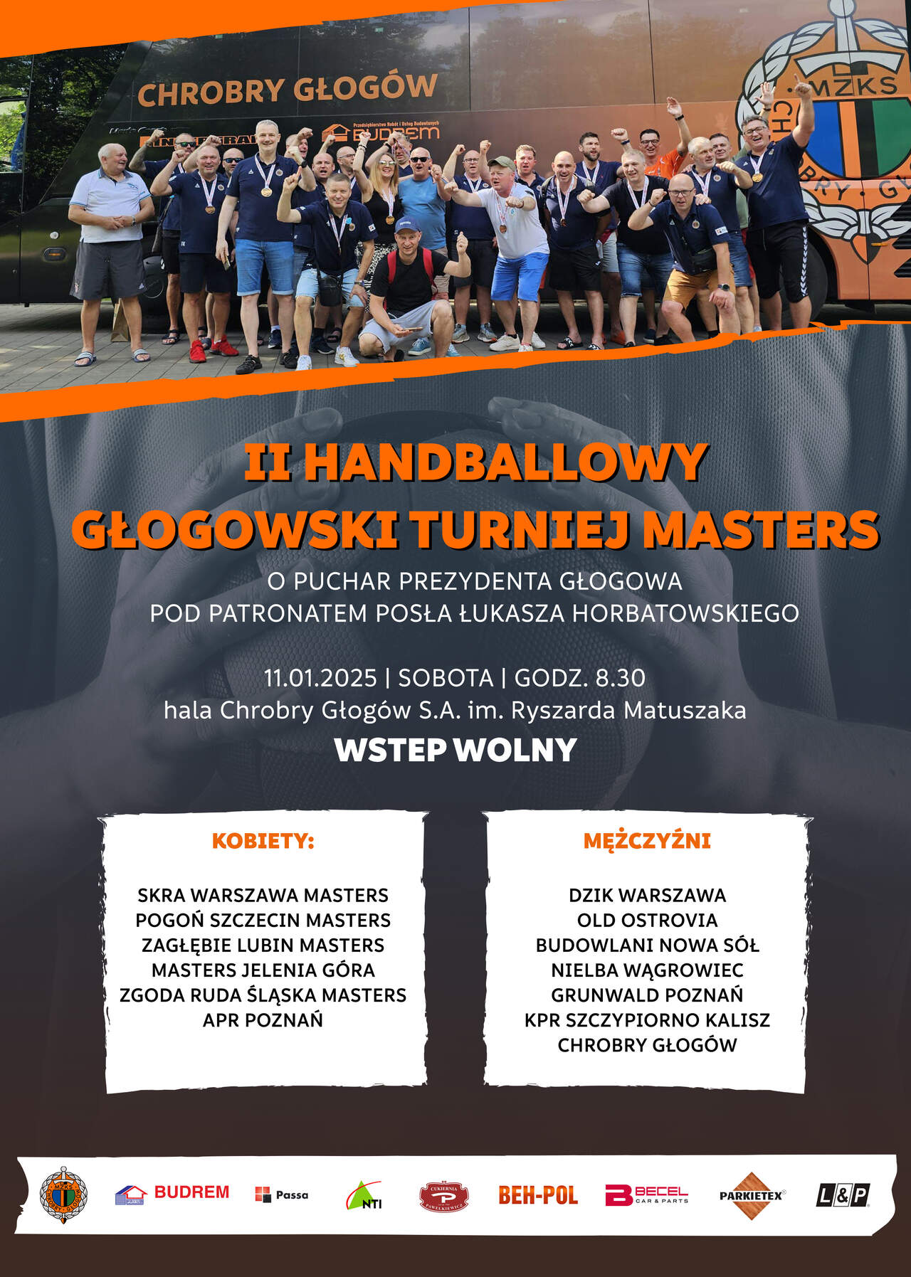 Zespoły z całej Polski. W sobotę duży turniej w hali 13 zespołów z całej Polski, w tym Chrobry Głogów - w sobotę w hali II Handballowy Głogowski Turniej Masters z udziałem oldbojów piłki ręcznej, którzy od dawna występują na parkietach pod klubowym herbem i będąc oficjalnie w strukturach Chrobrego. 10-01-2025 07:35 autor: ŁJ O tym, że oldboje Chrobrego, pomimo pokończenia swoich karier, działają prężnie - nie trzeba mocno przekonywać. W samym poprzednim roku wzięli udział w kilku turniejach. Potrafili wrócić z nich z pierwszym miejscem, jak z Karpacza czy Nowej Soli, oraz indywidualnymi nagrodami. Byli nawet na Masters Handball Worldd Cup w Chorwacji, a na swoim głogowskim parkiecie zorganizowali Handballowy Głogowski Turniej Masters. Na tej jednej edycji turnieju nie poprzestali i w sobotę czeka nas kolejna. Do Głogowa zjadą zespoły z Lubina, Jeleniej Góry, Warszawy, Szczecina, Kalisza, Ostrowa, Nowej Soli, Rudy Śląskiej i Poznania. Łącznie 13 drużyn, które w dwóch kategoriach, kobiet i mężczyzn, będą rywalizować o zwycięstwo w całym turnieju o puchar Prezydenta Głogowa i pod patronatem Posła Łukasza Horbatowskiego. Początek turnieju o godz. 8.30, a zakończenie po godz. 17.00. Wstęp na halę jest bezpłatny.
