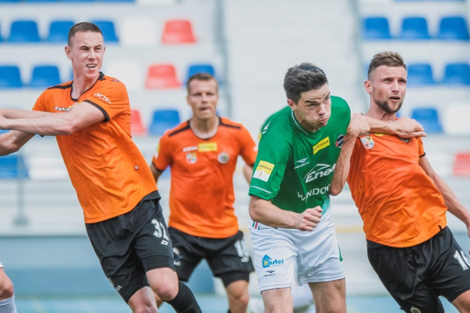 Kończy się tegoroczna seria Chrobrego Chrobry po raz drugi przegrał z Radomiakiem Radom 0:2. To jego pierwsza porażka w tym roku, na którą chyba największy wpływ miała gorsza pierwsza połowa. Podczas drugiej Pomarańczowo-Czarni zdecydowanie żywiej gonili, lecz… 13-06-2020 04:46 autor: ŁJ Chrobry po raz drugi przegrał z Radomiakiem Radom 0:2. To jego pierwsza porażka w tym roku, na którą chyba największy wpływ miała gorsza pierwsza połowa. Podczas drugiej Pomarańczowo-Czarni zdecydowanie żywiej gonili, lecz bezskutecznie.Chrobry po raz pierwszy w tym roku zaczął w innej jedenastce. Kontuzjowanego Mikołaja Lebedyńskiego zastąpił z przodu Damian Kowalczyk.Mecz toczył się przy palącym słońcu i w taki klimat wpisywała się pierwsza połowa, którą kończyły dwa celne strzały. Oba były w wykonaniu gospodarzy, choć jako piersi zagrozili głogowianie. Na niemal czystą pozycję wychodził Adrian Benedyczak. Naciskany i przez obrońcę, i przez wychodzącego bramkarza nie zdołał oddać strzału.Z biegiem czasu zaczęła zarysowywać się optyczna przewaga Radomiaka. Pomarańczowo-Czarni poza próbą Benedyczaka nie byli w stanie skonstruować ofensywnej akcji, więc przy piłce utrzymywali się miejscowi. W 19 minucie, po wrzutce z prawej strony, piłkę wprost w Michała Szromnika głową skierował Merveille Fundambu. W końcówce we znaki dał się Michał Kaput. Najpierw umyślnym przytrzymaniem za koszulkę powstrzymał groźnie wychodzącego Benedyczaka, a żółtą kartkę odbił sobie bramką. Radomiak dłuższą chwilę utrzymywał się na połowie Chrobrego i kończył to strzałem Kaputa tuż zza pola karnego. Futbolówka odbiła się od słupka, wpadła do środka i od tego momentu Chrobry musiał myśleć o odrabianiu straty.Obraz gry uległ zmianie po przerwie, a już wtedy trener Ivan Djurdjević zmienił Miłosza Kozaka na Maksymiliana Banaszewskiego. Chrobry zaczął przeważać i odważniej szukać swoich okazji. Jedną z nich mógł mieć Adrian Benedyczak, którego na czystą pozycję z głębi pola wypuścił Szymon Drewniak. Napastnik głogowian po raz kolejny niemal na nią wychodził, lecz w ostatniej chwili uprzedził go Maciej Świdzikowski.Taka był ta część. Chrobry wyraźnie naciskał i choć nie można powiedzieć, że był blisko trafienia, to jednak coś wisiało w powietrzu. Najlepiej podsumowuje to sytuacja z 82 minuty. Po akcji lewą stroną w wykonaniu wchodzących w tej części Maksymiliana Banaszewskiego z Damianem Piotrowskim, tego pierwszego faulowano nie w polu karnym, a na samej linii pola. Zawsze czegoś brakowało, tu tych kilku centymetrów. Zresztą, faulujący Kaput otrzymał za to drugą żółtą kartkę i opuścił boisko. Takiego problemu nie mieli rywale. W 88 minucie Michał Michalec sfaulował Dominika Sokoła i tu nie było wątpliwości - wszystko działo się w szesnastce. Rzut karny wykorzystał Patryk Mikita. Chrobremu trzeba oddać, że nawet przy takim wyniku i niewielkiej ilości czasu próbował. Efektem tego była świetna szansa Banaszewskiego, który uderzając na bramkę obsadzoną zawodnikami Radomiaka z pola, bo bramkarz nie zdążył wrócić, z kilku metrów posłał piłkę za wysoko.Kolejny mecz Pomarańczowo-Czarnych już we wtorek. O godz. 16.00 Chrobry podejmie na własnym stadionie GKS Jastrzębie. Natomiast w piątek wyjazdowe spotkanie z Odrą Opole, więc szykuje się bardzo intensywny i ciekawy tydzień.Fot. Radomiak Radom