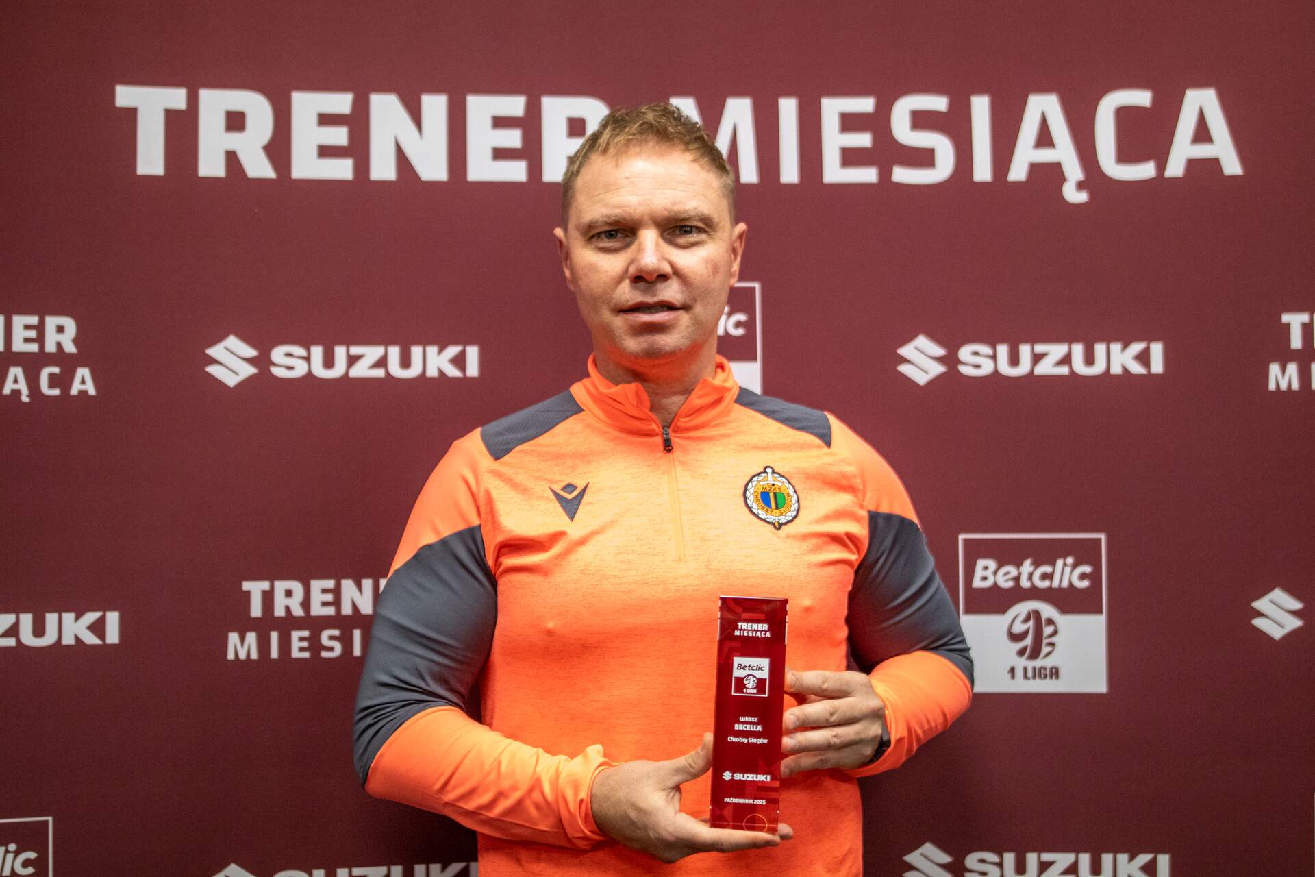 Łukasz Becella trenerem października Betclic 1 Ligi Szkoleniowiec Chrobrego Głogów odebrał wyróżnienie za doskonały miesiąc, w którym jego zespół imponował regularnością, organizacją gry i wynikami. Nagroda przyznawana jest we współpracy ze sponsorem kategorii – firmą Suzuki. 16-11-2025 10:30 autor: ŁJ Październik był dla Chrobrego wyjątkowo udany. Drużyna z Głogowa zanotowała serię zwycięstw, pokonując m.in. Stal Mielec, Polonię Warszawa i GKS Tychy. Zespół Łukasza Becelli nie tylko punktował, ale też prezentował styl, który pozwolił mu awansować na 3. miejsce w ligowej tabeli po 16. kolejkach. To wyróżnienie potwierdza świetną pracę wykonaną przez sztab szkoleniowy Chrobrego. Zespół prowadzony przez Becellę konsekwentnie rozwija się z meczu na mecz, stając się jedną z rewelacji sezonu 2025/2026. Trener miesiąca wybierany jest w drodze głosowania panelu ekspertów, w którego skład wchodzą przedstawiciele wszystkich 18 klubów Betclic 1 Ligi, sponsor kategorii – firma Suzuki, partner telewizyjny TVP Sport oraz Pierwsza Liga Piłkarska. Od sezonu 2025/2026 w procesie głosowania uczestniczy również Stowarzyszenie Trenerów Piłki Nożnej jako partner merytoryczny. W głosowaniu na Trenera Października zwyciężył: · Łukasz Becella – 13 głosów · Piotr Stokowiec – 8 głosów · Janusz Niedźwiedź – 1 głos · Mariusz Jop – 0 głosów TRENERZY MIESIĄCA BETCLIC 1 LIGI 2025/2026: · LIPIEC/SIERPIEŃ 2025 – MARIUSZ JOP (WISŁA KRAKÓW) · WRZESIEŃ 2025 - PIOTR STOKOWIEC (POGOŃ GRODZISK MAZOWIECKI) · PAŹDZIERNIK 2025 - ŁUKASZ BECELLA (CHROBRY GŁOGÓW)