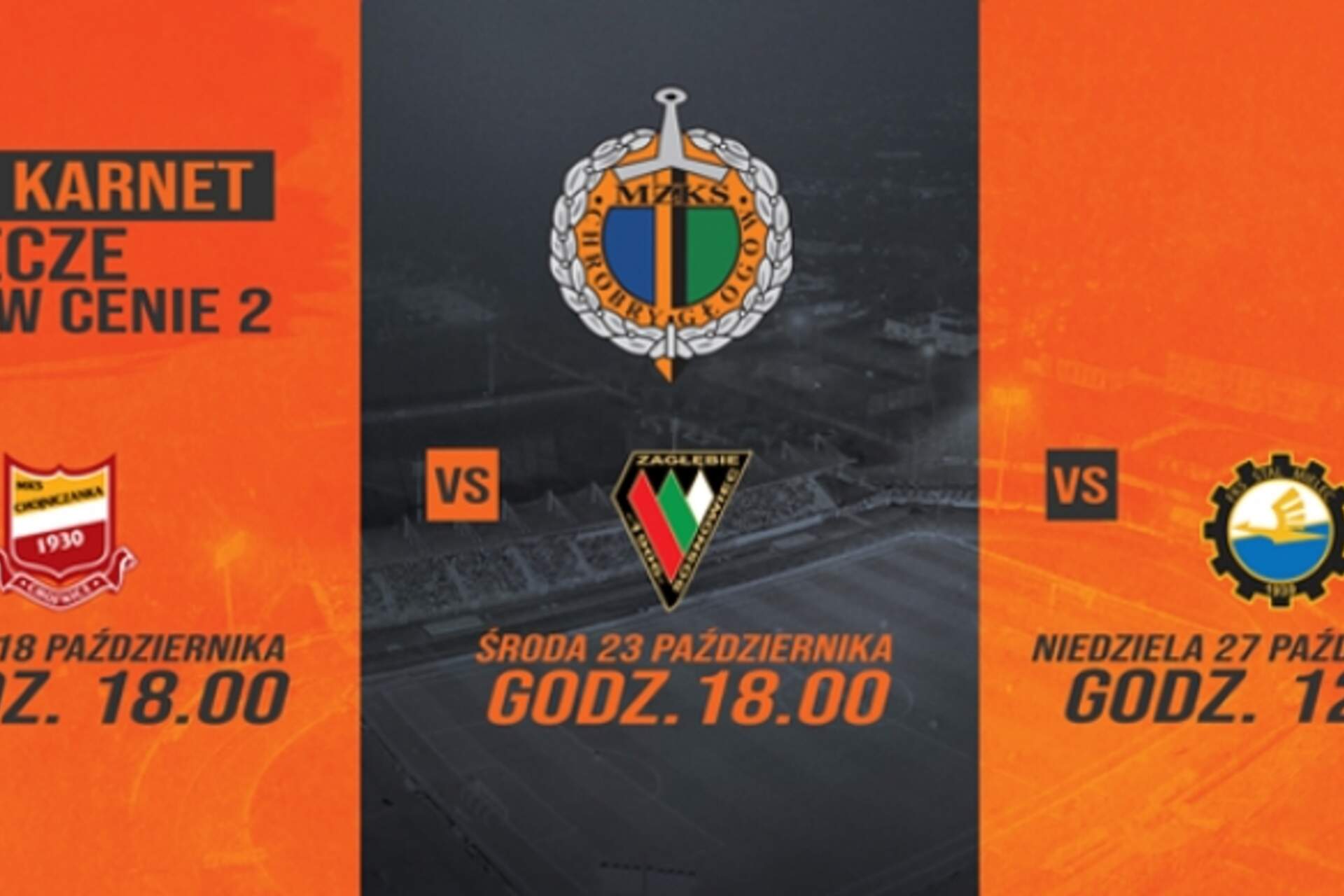 Mini karnety na trzy mecze przy WS3 Duża promocja tym razem dla kibiców kupujących meczowe bilety! W ciągu dziesięciu dni w okresie od 18 do 27 października Chrobry Głogów zagra trzykrotnie u siebie, a my uruchamiany specjalne „mini karnety”. Bądź z Chrobrym… 09-10-2019 12:15 autor: ŁJ Duża promocja tym razem dla kibiców kupujących meczowe bilety! W ciągu dziesięciu dni w okresie od 18 do 27 października Chrobry Głogów zagra trzykrotnie u siebie, a my uruchamiany specjalne „mini karnety”. Bądź z Chrobrym przez ten czas i stań się posiadaczem mini karnetu gwarantującego udział w trzech meczach w cenie dwóch, a do tego zyskaj 10 procent rabatu na zakupy w Pomarańczowo-Czarnym Sklepie!Specjalna promocja na zakup mini karnetów obejmuje stacjonarny punkt sprzedaży (kasy pływalni Chrobry) i rozpocznie się w piątek 11 października o godz. 15.00, a zakończy w piątek 27 października o godz. 14.30.Przy zakupie mini karnetu, kibic otrzyma wstęp na trzy mecze, spośród których jeden będzie zupełnie za darmo. Do tego mini karnet upoważni do 10-procentowego rabatu na zakupy w Pomarańczowo-Czarnym Sklepie (zakupy za min. 25 zł w punkcie w pływalni lub na stadionie podczas meczów) w terminie do 27 października, czyli do momentu ostatniego z trzech meczów. Cennik mini karnetów (trzy mecze przy Wita Stwosza w okresie od 18.10 do 27.10):10 zł - ulgowy dla dzieci w wieku 13-15 lat16 zł - ulgowy dla młodzieży w wieku 16-18 lat, dla emerytów za okazaniem legitymacji, dla posiadaczy Karty Dużej Rodziny oraz dla posiadaczy Karty Seniora30 zł - dorośli34 zł - rodzinny 1 opiekun + maksymalnie 2 dzieci do 13 roku życia60 zł - rodzinny 2 opiekunów + maksymalnie 4 dzieci do 13 roku życiaSprzedaż mini karnetów jest prowadzona tylko w kasach pływalni. Sprzedaż internetowa na www.kupbilet.pl oraz w punktach pośredniczących z KupBilet.pl (Empik, Kolporter) dotyczy tylko biletów na pojedyncze mecze.
