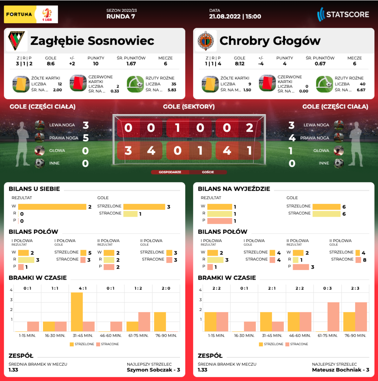 ND. 15.00: Zagłębie Sosnowiec - Chrobry Głogów Dziś mecz w Sosnowcu. O godz. 15.00 rozpocznie się spotkanie 7 kolejki Fortuna 1 Ligi z Zagłębiem. 21-08-2022 07:00 autor: ŁJ W Głogowie było do tej pory trudniej o punkty, a poza swoim miastem Chrobry zapunktował w dwóch z trzech meczów, w każdym z nich zdobywając przynajmniej jednego gola. Do Sosnowca pojechał więc z nadziejami na zdobycz, która poprawiłaby miejsce w tabeli (obecnie, w trakcie 7 kolejki, głogowianie są na 15 miejscu). Zagłębie jednak na swoim terenie w tym sezonie jeszcze nie oddało ani jednego punktu. W dwóch dotychczasowych spotkaniach na Stadionie Ludowym drużyna trenera Artura Skowronka pokonała Resovię Rzeszów 2:1 i GKS Tychy 1:0. Chrobry musiałby być pierwszą ekipą, która z Sosnowca nie wyjedzie z pustymi rękoma. 19-08-2022 Nasz kolejny rywal: Zagłębie Sosnowiec Więcej o Zagłębiu Sosnowiec przed niedzielnym meczem. W ostatniej kolejce obie drużyny przegrały swoje spotkania i obie w podobny sposób. Chrobry z Podbeskidziem Bielsko-Biała 0:1 po golu w 76 minucie i mniej więcej w tym samym czasie Zagłębie traciło jedynego gola w pojedynku ze Skrą Częstochowa (wygrana rywali 1:0 po bramce w 73 minucie). Ostatni mecz Chrobrego z Zagłębiem był popisem jednej drużyny. Pomarańczowo-Czarni zwyciężyli wówczas 4:0, zmierzając po baraże, podczas gdy rywale koniec końców z punktem przewagi wywalczyli utrzymanie na pierwszoligowym poziomie. Mimo kilku miesięcy, od tamtego momentu dużo się wydarzyło i patrząc po tabeli to sosnowiczanie są obecnie w lepszym położeniu. Mają 8 miejsce, a Chrobry odpiera ataki przeciwników ze strefy spadkowej. Liczy się jednak tu i teraz, a w tym momencie mający trzy porażki z rzędu głogowianie z pewnością będą bardzo zdeterminowani, aby zakończyć tę serię. Transmisja z meczu w Polsat Box Go. Możesz też aktywować jednorazowy dostęp do meczu - PRZEJDŹ DO STRONY TRANSMISJI O KLUBIE Pełna nazwa: Zagłębie Sosnowiec Spółka Akcyjna Rok powstania: 1918 (jako spółka od 2001) Adres: Kresowa 1, 41-200 Sosnowiec Internet: www.zaglebie.eu Barwy: czerwono-zielono-białe Sukcesy: - wicemistrzostwo Polski - 1955, 1963/64, 1966/67, 1971/72 - Puchar Polski - 1961/62, 1962/63, 1976/77, 1977/78 - finalista Pucharu Polski - 1970/71 Stadion: - Stadion Ludowy - pojemność - 4900 miejsc siedzących - oświetlenie - 1877lx - boisko - 106 x 68m Bramkarze: Szymon Frankowski (01), Michał Gliwa (88), Mateusz Kos (87), Matko Perdijic (82), Kacper Siuta (05). Obrońcy: Mateusz Bodzioch (90), Filip Borowski (03), Oleksiy Bykov (98), Vedran Dalic (95), Dawid Gojny (94), Dominik Jończy (97), Mateusz Machała (00), Maksym Niemiec (03), Kacper Smoleń (02). Pomocnicy: Maksymilian Banaszewski (95), Michał Barć (03), Sebastian Bonecki (95), Patryk Bryła (90), Bartosz Chęciński (04), Igor Dziedzic (05), Jakub Kaczmarek (01), Michał Masłowski (89), Szymon Pawłowski (86), Maksymilian Rozwandowicz (94), Dawid Ryndak (89), Wojciech Szumilas (96), Adrian Troć (03), Mateusz Ziółkowski (03). Napastnicy: Marek Fabry (98), Tymoteusz Klupś (00), Antoni Kulawiak (05), Mateusz Popczyk (01), Szymon Sobczak (92), Roman Tierbalan (97). Trener: Artur Skowronek.