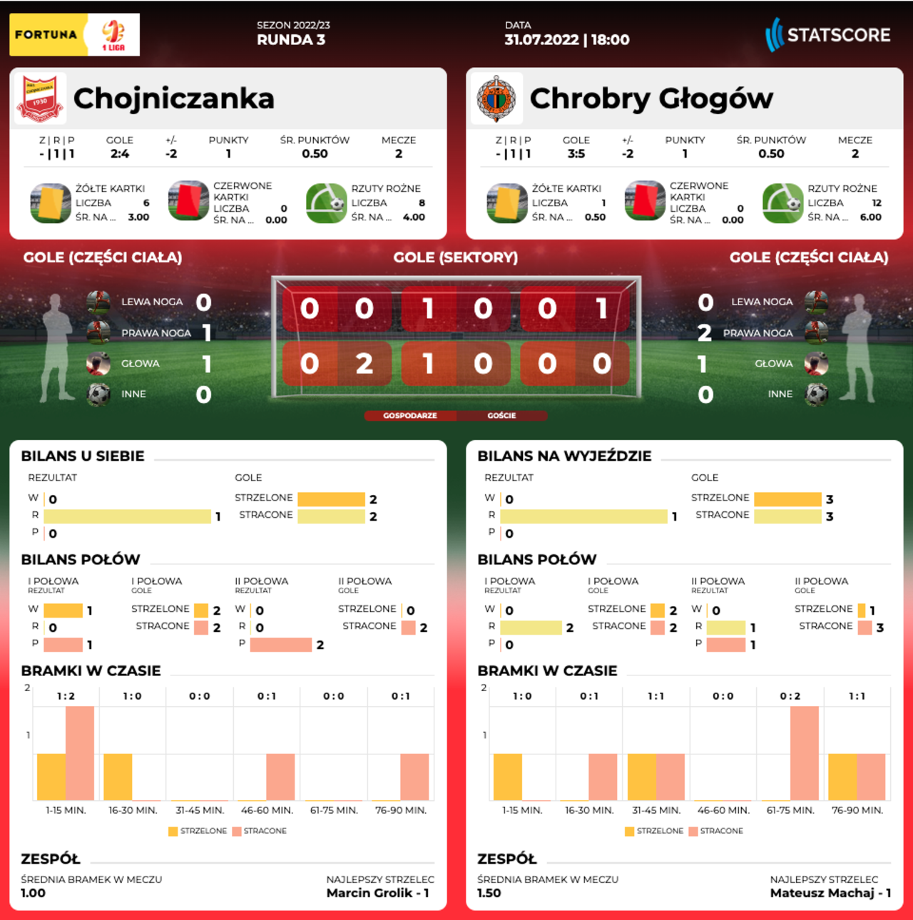 ND. 18.00: Chojniczanka Chojnice - Chrobry Głogów W niedzielę o godz. 18.00 w Chojnicach mecz 3 kolejki Fortuna 1 Ligi z Chojniczanką. 30-07-2022 09:35 autor: ŁJ Chrobry kończy serię spotkań z beniaminkami. W trzecim i ostatnim takim meczu Pomarańczowo-Czarni zmierzą się z Chojniczanką Chojnice. Początek w niedzielę o godz. 18.00 na stadionie w Chojnicach. Niedzielny mecz, poza tym że oba zespoły powalczą o pierwsze ligowe zwycięstwo, ma dodatkowy smaczek. To pojedynek urodzonych w tym samym dniu braci Wolsztyńskich: Łukasz jest w Chojniczance, Rafał w Chrobrym. Jeśli w tym samym czasie będą na boisku, to... - Będzie to pierwsza taka sytuacja - mówi Rafał Wolsztyński. - Jeszcze nie było nam dane zagrać przeciwko sobie. Spotkamy się, pogadamy, ale na boisku każdy będzie chciał ciągnąć w swoją stronę. Jak to w rodzeństwie, zawsze próbujemy sobie coś udowodnić i starać się być tym lepszym. Mam nadzieję, że po meczu to ja będę w lepszym nastroju. 28-07-2022 Nasz najbliższy rywal: Chojniczanka Chojnice Dwa lata przerwy i z Chojniczanką gramy ponownie. W niedzielę o godz. 18.00 w Chojnicach mecz nr 18. Łukasz Wolsztyński zdobył dwa gole w środowym meczu Pucharu Polski, w którym Chojniczanka pokonała po dogrywce Hutnika Kraków 3:1. Zespół z Chojnic czeka jednak na pełną pulę w lidze, bo do tej pory zremisował z GKS-em Tychy 2:2 i przegrał ze Skrą Częstochowa 0:2. U Rafała Wolsztyńskiego, który w obu kolejkach na murawę wchodził z ławki, premierowe trafienie w pomarańczowo-czarnych barwach dopiero nadejdzie. Z pewnością byłoby pomocne już w niedzielę. Głogowianie po dwóch seriach również dysponują jednym punketm, a mając w perspektywie pojedynki z ŁKS-em Łódź, Bruk-Betem Termaliką Nieciecza czy Podbeskidziem Bielsko-Biała dobrze byłoby złapać przed nimi oddech za sprawą wyjazdowego zwycięstwa. Piłkarze Chrobrego w stronę Chojnic wyjechali w sobotę rano, po raz kolejny na ostatni przedmeczowy trening decydując się już na miejscu. Transmisja z meczu w Polsat Box Go. Możesz też aktywować jednorazowy dostęp do meczu - PRZEJDŹ DO STRONY TRANSMISJI O KLUBIE Pełna nazwa: Miejski Klub Sportowy Chojniczanka 1930 Chojnice Rok powstania: 1930 Adres: Mickiewicza 12, 89-600 Chojnice Internet: www.mkschojniczanka.pl (oficj.) Barwy: żółto-biało-czerwone Sukcesy: - 3. miejsce w I lidze - 2017/18 - awans do 1/4 Pucharu Polski (x3) - 2015/16, 2017/18, 2020/21 Stadion: - Stadion Miejski Chojniczanka 1930 - pojemność - 3000 miejsc - oświetlenie - 1600 lx - boisko - 100 m x 68 m Bramkarze: Bartosz Neugebauer (02), Sebastian Sobolewski (05), Sebastian Szabłowski (03). Obrońcy: Mateusz Bartosiak (00), Maciej Białczyk (03), Wojciech Błyszko (99), Damian Byrtek (91), Sebastian Golak (99), Marcin Grolik (89), Kacper Kasperowicz (02), Michał Mikołajczyk (90),David Niepsuj (95). Pomocnicy: Mateusz Cegiełka (01), Paweł Czajkowski (95), Konrad Formela (04), Robert Janicki (97), Bartłomiej Kalinkowski (94), Filip Karbowy (97), Michał Marsza (94), Szymon Stróżyński (02), Sam van Huffel (98), Łukasz Wolsztyński (94). Napastnicy: Tomasz Mikołajczak (87), Antoni Prałat (03), Adam Ryczkowski (97), Szymon Skrzypczak (90), Patryk Tuszyński (89). Trener: Tomasz Kafarski.