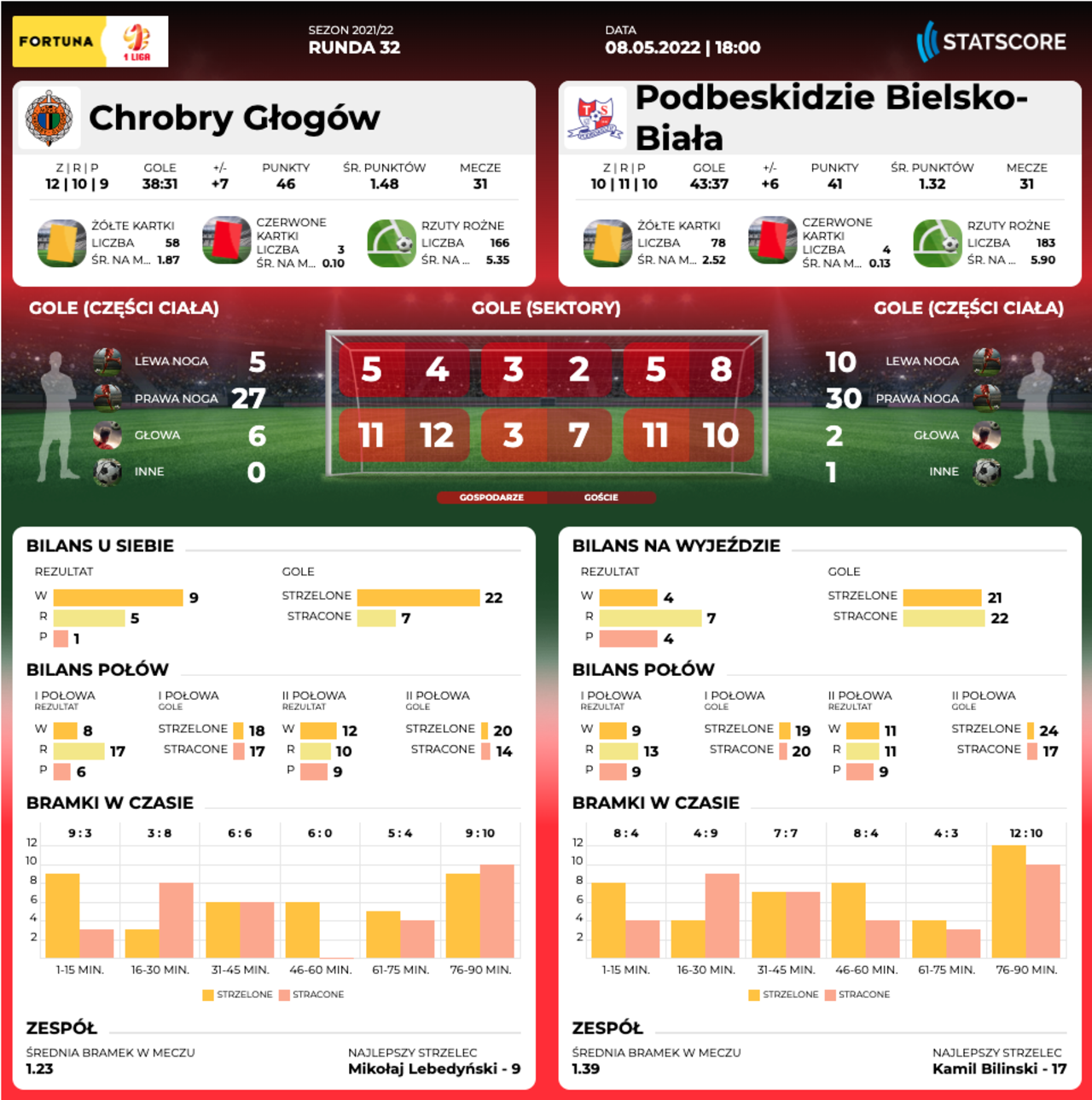 ND. 18.00: CHROBRY GŁOGÓW - PODBESKIDZIE BIELSKO-BIAŁA Przedostatni raz w sezonie zasadniczym na Wita Stwosza. O godz. 18.00 Chrobry - Podbeskidzie. 08-05-2022 07:13 autor: ŁJ To jedna z trzech ostatnich kolejek i jakże ważna. O godz. 18.00 mecz dwóch zespołów rywalizujących o miejsce w barażach: Chrobry - Podbeskidzie Bielsko-Biała. Mało prawdopodobne, że znajdą się w nich oba, dlatego oba zagrają o pełną pulę. W tabeli w lepszej sytuacji są Pomarańczowo-Czarni, którzy mają przewagę pięciu punktów. Za nami jednak już kilka spotkań 32 kolejki i zespoły, które rywalizują o miejsce w szóstce pozdobywały punkty. Odra Opole i GKS Tychy wygrały swoje mecze i spokojniej przyglądają się reakcjom ze strony innych, w tym Chrobrego. W tej chwili na 5 pozycji są opolanie, a tuż za nimi mający mecz mniej Chrobry i Sandecja, a te dwie ekipy rozdziela tylko punkt. Robi się bardzo ciekawie i jak określił to niedawno trener Ivan Djurdjević zaczyna się walka z nożem na gardle, bo może nie być miejsca na potknięcie. W ostatniej kolejce obie drużyny schodziły z boiska w roli pokonanych. Chrobry ma za sobą porażkę w Legnicy 0:1, a Podbeskidzie przegrało z Zagłębiem Sosnowiec 0:2. W derbowym pojedynku z Miedzią czwartą żółtą kartkę zobaczył Michał Ilków-Gołąb i jego na murawie nie zobaczymy. Chrobry na swoim głównym stadionie pozostaje niepokonany, ale trzy ostatnie domowe spotkania zakończyły się remisami, kolejno 2:2, 1:1 oraz 3:3. Podbeskidzie natomiast, grając niedawno w Nowym Sączu, odniosło swoje pierwsze zwycięstwo od listopada. Głogowska defensywa, wciąż jedna z najlepszych w lidze, będzie musiała bardzo uważać, zwłaszcza że w ekipie rywali jest najlepszy strzelec ligi, autor 17 trafień Kamil Biliński. 07-05-2022 PRZED "MAŁYM FINAŁEM" 1 dzień do absolutnie bardzo ważnego meczu z Podbeskidziem Bielsko-Biała. Bilety na mecz do momentu rozpoczęcia spotkania dostępne są w kasach pływalni Chrobry i na bilety.chrobry-glogow.pl. W kasach pływalni do godz. 17.00 oraz w internetowym systemie do samego meczu obowiązują ceny przedsprzedażowe (ulgowe 7 zł / normalne 15 zł / 0 zł to 13 roku życia). Kasa stadionu otwarta zostanie na godzinę przed meczem i od tego momentu, włącznie z punktem w pływalni, bilety będą w cenach: ulgowe 10 zł / normalne 20 zł / 0 zł to 7 roku życia. Transmisja z meczu w Polsat Box Go. Możesz też aktywować jednorazowy dostęp do meczu - PRZEJDŹ DO STRONY TRANSMISJI Wszystkie spotkania Fortuna 1 Ligi możesz obstawiać na www.efortuna.pl Kurs w Fortunie, że Chrobry wygra z Podbeskidziem wynosi 3.25. Fortuna online zakłady bukmacherskie sp. z o.o. to legalny bukmacher posiadający zezwolenia na urządzanie zakładów wzajemnych w Polsce. Udział w nielegalnych grach hazardowych grozi konsekwencjami prawnymi. Hazard związany jest z ryzykiem. O KLUBIE Pełna nazwa: TS Podbeskidzie Spółka Akcyjna Rok powstania: 1995 Adres: Rychlińskiego 21, 43-300 Bielsko-Biała Internet: tspodbeskidzie.pl (oficj.) Barwy: czerwono-biało-niebieskie Sukcesy: - 10. miejsce w Ekstraklasie - 2013/14 - 1/2 finału Pucharu Polski - (2x) - 2010/11, 2014/15 Stadion: - Stadion Miejski - pojemność - 15 316 miejsc siedzących - oświetlenie - 1800 lx - boisko - 105 m x 68 m Bramkarze: Matvei Igonen (96), Michal Peskovic (82), Martin Polacek (90). Obrońcy: Ezequiel Bonifacio (94), Kacper Gach (98), Maciej Kowalski-Haberek (94), Mateusz Lipp (04), Daniel Mikołajewski (99), Julio Rodriguez (95), Jeppe Simonsen (95), Mateusz Wypych (98). Pomocnicy: Bartosz Bieroński (06), Jakub Bieroński (03), Yigit Emre Celtik (03), Dominik Frelek (01), Konrad Gutowski (99), Michał Janota (90), Giorgi Merebashvili (86), Titas Milasius (00), Marcel Misztal (03), Dawid Polkowski (98), Joan Roman (93), Mathieu Scalet (97). Napastnicy: Kamil Biliński (88), Kacper Wełniak (00). Trener: Mirosław Smyła.