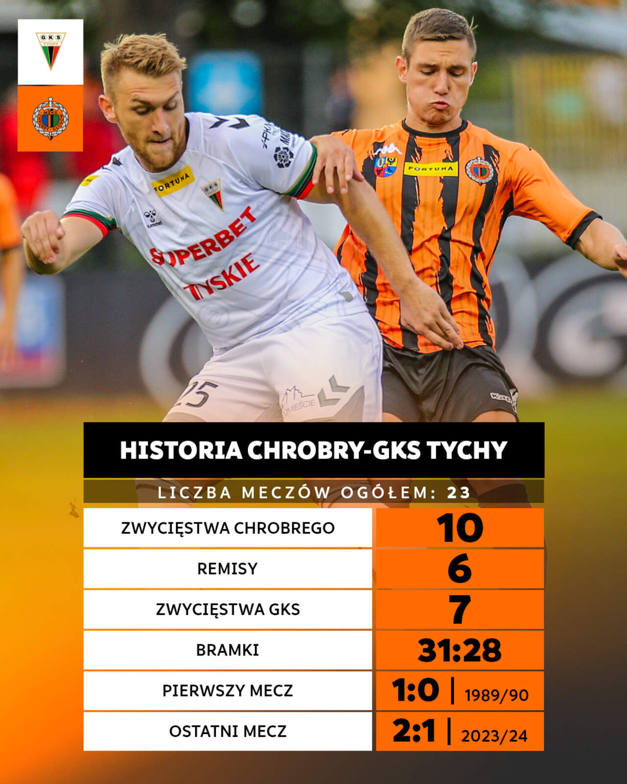 Nasz rywal: GKS Tychy Mecz w Tychach już w sobotę. Przyjrzeliśmy się naszemu wyjazdowemu rywalowi i dzielimy się z Wami najważniejszymi o nim informacjami. 14-03-2024 09:15 autor: ŁJ Podobnie jak jesienią GKS zajmuje trzecie miejsce w tabeli z wciąż realną szansą na bezpośredni awans, bo do najsilniejszej w tym momencie dwójki traci tylko trzy punkty. Od początku sezonu forma tyszan jest wysoka i stabilna. Były kolejki, po których GKS zajmował najwyższą pozycję, a przez cały ten okres jest przynajmniej w ścisłej czołówce. Do tej pory GKS-owi zdarzył się tylko jeden okres w lidze z serią trzech spotkań bez wygranej. Czy będzie drugi? To zależy od postawy Chrobrego, bo właśnie na tym etapie rywale są po dwóch występach bez kompletu punktów. Najpierw przegrali z Arką Gdynia 0:1, a ostatnio zremisowali z Miedzią Legnica 2:2. Identycznie było jesienią, kiedy tyszanie byli po porażce z Arką i remisie z Miedzią, a wygrywający 2:1 Pomarańczowo-Czarni stali się tym zespołem, który przedłużył gorszą passę przeciwnika. Trener rywali. Z szansą na kolejny w karierze awans Od kwietnia ubiegłego roku trenerem GKS-u jest Dariusz Banasik. W swojej karierze trenerskiej ma już kilka zespołowych awansów. Prowadząc Znicza Pruszków awansował z nim do 1 Ligi. Później to samo zrobił z Radomiakiem Radom, z którym dodatkowo uzyskał promocję do Ekstraklasy. Z Radomia odchodził, gdy jego zespół był na szóstym miejscu w tabeli, więc dla środowiska było to zaskakujące wydarzenia. Teraz, pomimo zmiany otoczenia, utrzymuje się w ligowej czołówce. Kadra GKS-u Do bardzo dużych zmian w kadrze GKS-u doszło przed sezonem, więc zima pod tym względem była spokojniejsza, choć ściągnięty w tym okresie Austriak Julius Ertlthaler z WSG Tirol z miejsca wskoczył do podstawowego składu. Spośród letnich nabytków najwięcej rozegranych minut ma bramkarz Maciej Kikolski (2070), a najwięcej bramek Bartosz Śpiączka (4), ale zawodnicy dłużej grający w GKS-ie nie pozostają w tyle. 2070 minut również ma na koncie Nemanja Nedic, podobnie wygląda to u Jakuba Tecława (2066), a najlepszym strzelcem drużyny z sześcioma bramkami jest Daniel Rumin. Stadion w Tychach Fot. 1liga.org Klubowe powiązania Jedynym zawodnikiem mającym w swoim CV oba kluby jest Bartosz Biel. Obecny pomocnik Pomarańczowo-Czarnych w Tychach spędził dwa sezony. W latach 2020-2022 rozegrał 65 spotkań, w których zdobył 9 goli. Obsada sędziowska Sędzia główny: Grzegorz Kawałko - Wyszowate Sędziowie asystenci: Michał Pierściński, Damian Sadowski Sędzia techniczny: Marcin Bielawski Sędziowie VAR: Sebastian Krasny, Szymon Łężny 24. mecz z GKS-em Pierwszy mecz w 1989 roku to zwycięstwo Chrobrego 1:0. Ostatni - z września ubiegłego roku - również zakończył się wygraną głogowian (2:1), którzy mają lepszy bilans pojedynków z GKS-em. Liczba meczów Chrobry-GKS: 23 Zwycięstw Chrobrego: 10 Remisów: 6 Zwycięstw GKS-u: 7 Bramki Chrobry-GKS: 31:28