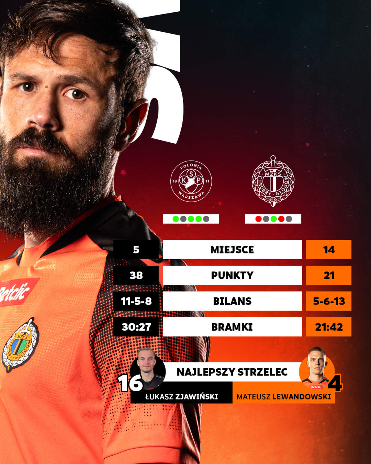 Nasz rywal: Polonia Warszawa Polonia Warszawa sobotnim przeciwnikiem Chrobrego w Betclic 1 Lidze. W artykule przybliżamy naszego rywala. 28-03-2025 09:15 autor: ŁJ Niepokonani w tym roku Choć Polonia ten sezon zaczęła od jednego punktu w pierwszych sześciu meczach, dziś jest piąta z dużymi szansami na baraże. Co ważniejsze dla jej dyspozycji, w tym roku nie przegrała ani razu. W pięciu tegorocznych spotkaniach zdobyła 11 punktów. Za porażkę można co prawda uznać 1:2 z Puszczą Niepołomice w 1/4 finału Pucharu Polski i odpadnięcie z dalszej rywalizacji, ale nawet w tym pojedynku po regulaminowym czasie gry był remis, a o wszystkim zadecydowała dogrywka. Biorąc pod uwagę samą ligę w tym roku, tylko w jednym spotkaniu „Czarne Koszule” nie zdobyły bramki, w pozostałych najczęściej strzelając ich dwie lub trzy. Przed Chrobrym i jego obroną ciężki pojedynek z zespołem, który ma szansę nawiązać do swoich najlepszych czasów. A jeszcze w 2000 roku świętował mistrzostwo Polski, po raz ostatni na najwyższym poziomie będąc w 2013 roku. Trener rywali: Mariusz Pawlak Na zaplecze Polonię wprowadził trener Rafał Smalec, ale po złym starcie już w sierpniu dokonywano zmian. Ostatecznie zespół przejął wtedy jej były zawodnik Mariusz Pawlak. Pod wodzą tego szkoleniowca zespół ze stolicy na 21 meczów wygrał w trzynastu (to daje średnią punktową 2.05). 53-letni Mariusz Pawlak w przeszłości był trenerem m.in. Olimpii Grudziądz, Wisły Puławy, GKS-u Bełchatów i Chojniczanki Chojnice. W swojej karierze ma już dwa awanse, z Chojniczanką do pierwszej, a z Wisłą do drugiej ligi. Kadra rywali: najlepszy strzelec pauzuje Groźną bronią Polonii jest Łukasz Zjawiński. 16 bramek, jakie zdobył w tym sezonie Betclic 1 Ligi, to jeden z najlepszych wyników w całej lidze. W tej klasyfikacji o jedno trafienie wyprzedza go tylko Angel Rodado z Wisły Kraków. I tu ważna informacja: przeciwko Chrobremu nie zagra, bo w ostatniej kolejce otrzymał dwie żółte kartki, po tym ma ich osiem, a to oznacza mecz przerwy. Innymi podstawowymi zawodnikami Polonii są Michał Grudniewski, Mateusz Kuchta, Bartłomiej Poczobut, Przemysław Szur czy Ernest Terpiłowski. Terpiłowski w swoim CV ma 53 rozegrane spotkania w Ekstraklasie, ale pod tym względem najwięcej występów - 58 w barwach Lechii Gdańsk - ma Ilkay Durmus z tureckim i niemieckim obywatelstwem. Ciekawostki: Właścicielem i prezesem Polonii jest francusko-polski przedsiębiorca Gregoire Nitot, założyciel i dyrektor generalny Sii Polska. Największymi osiągnięciami Polonii są dwukrotne mistrzostwo Polski (1946, 1999/2000), trzykrotne wicemistrzostwo, Puchar Polski (1951/52, 2000/01), Puchar Ligi (1999/2000), Superpuchar Polski (2000) oraz 1/2 finału UEFA Intertoto (1999). Tu zagramy Fot. 1liga.org Fot. laczynaspilka.pl Klubowe powiązania - Obsada sędziowska Sędzia główny: Piotr Idzik - Poznań Sędziowie asystenci: Maciej Cebulski, Szymon Filip Sędzia techniczny: Szymon Rutkowski Sędziowie VAR: Marcin Szczerbowicz, Dawid Golis Z Polonią dopiero po raz drugi Chrobry w piątym w historii meczu z Polonią powalczy o pierwsze z nią zwycięstwo. Do tej pory trzykrotnie wygrywały "Czarne Koszule", a jedno spotkanie zakończyło się remisem. W tym sezonie będzie już trzecim obustronnym meczem, bo we wrześniu doszło do dwóch: w Betclic 1 Lidze i Pucharze Polski. Oba rywale wygrali 2:1. Liczba meczów Chrobry - Polonia: 4 Zwycięstw Chrobrego: 0 Remisów: 1 Zwycięstw Polonii: 3 Bramki Chrobry-Polonia: 3:8