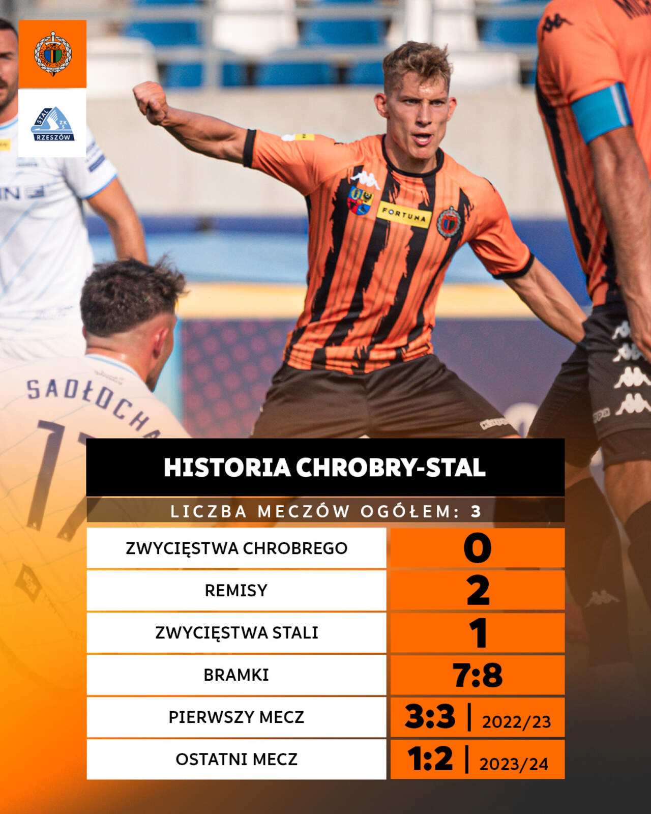 Nasz rywal: Stal Rzeszów 87, 90 i 90 - w tych minutach padały decydujące o wyniku bramki we wszystkich meczach ze Stalą Rzeszów. W sobotę czas na kolejny emocjonujący pojedynek. 08-03-2024 08:15 autor: ŁJ Walczą o przełamanie Stal jest po czterech porażkach z rzędu i w tabeli jest tuż przed Chrobrym z taką samą liczbą punktów (23). Przed tygodniem przegrała z Miedzią Legnica 1:3 i w każdym z tych spotkań traciła minimum dwa gole, a to spowodowało, że zaraz po swoim derbowym rywalu - Resovii - ma najwięcej goli na minusie (39). Trzeba jednak pamiętać, że już jesienią Stal zmagała się z podobnymi kryzysami. Sezon zaczęła od pięciu występów bez wygranej, po czym przełamała się w rywalizacji z Chrobrym, zwyciężając wtedy 2:1 po golu w 90 minucie. Trener rywali. "Patrzymy do góry" Od początku sezonu trenerem Stali jest Marek Zub. To 59-letni szkoleniowiec, który w latach 2013 i 2014 wywalczył z Žalgirisem Wilno mistrzostwo Litwy. Na swoim koncie ma też wicemistrzostwo tego kraju, trzykrotny Puchar Litwy oraz Superpuchar Litwy. Do 2023 roku, z jedną tylko przerwą na GKS Bełchatów, pozostawał trenerem za granicą, nie tylko na Litwie, ale też na Łotwie, Białorusi i w Kazachstanie. - Dopóki matematycznych szans na miejsce w barażach nie stracimy, ja nie zmienię tonu. (…) Patrzymy tylko i wyłącznie do góry - powiedział o celach zespołu na ten sezon mimo aktualnej sytuacji w tabeli. Latem rewolucja, zimą stabilizacja O ile przed sezonem w Stali doszło wręcz do kadrowej rewolucji, o tyle zimą uspokojono sytuację, jedynie włączając do szerokiej kadry zawodników drugiej drużyny. Liderem strzelców z siedmioma golami jest urodzony w Szwajcarii Adler Da Silva, który jednak w tym roku jak na razie wchodził na boisko z ławki. Z drugiej strony aż sześć goli zdobył w… ostatnim kwadransie, więc trzeba bardzo uważać. W ekipie Stali najwięcej grają Andreja Prokic, Kamil Kościelny, Krzysztof Danielewicz, Paweł Oleksy, Patryk Warczak, Jakub Wrąbel czy Sebastien Thill. Z tego grona najwięcej występów w Ekstraklasie, ponad 90, mają Danielewicz oraz Oleksy, ale i Prokic z Kościelnym uzbierali ich dobrych kilkadziesiąt (kolejno 49 i 58). W sobotnim meczu z powodu żółtych kartek zabraknie Szymona Kądziołki (19 / 3) oraz Milana Simcaka (12 / 0). Klubowe powiązania Byłym zawodnikiem Stali, a obecnie Chrobrego jest Patryk Plewka. W Rzeszowie spędził sezon 2019/20 (24 / 2) zakończony udziałem Stali w barażach o awans do Fortuna 1 Ligi. Po drugiej stronie są natomiast Paweł Oleksy i Łukasz Góra. Paweł (w Chrobrym w sezonach 2010/11 i 2020/21) w 17 meczach tego sezonu zdobył dwie bramki, raz wpisując się na listę strzelców w ostatniej kolejce. Łukasz (w Chrobrym w sezonie 2019/20) również wystąpił w 17 spotkaniach trwających rozgrywek. Obsada sędziowska Sędzia główny: Piotr Idzik - Poznań Sędziowie asystenci: Dariusz Bohonos, Mariusz Borkowski Sędzia techniczny: Aleksander Borowiak Sędziowie VAR: Karol Arys, Artur Aluszyk Zawsze pełne emocji Do tej pory odbyły się tylko trzy mecze ze Stalą, ale każdy z nich należał do bardzo emocjonujących. Dwa pierwsze zakończyły się remisem 3:3, do którego Chrobry doprowadzał bramkami najpierw w 87 minucie, a następnie w 90 minucie. Za to zrewanżowała się Stal w pierwszym spotkaniu tego sezonu, bo wygrała 2:1 golem zdobytym w doliczonym czasie. Liczba meczów Chrobry – Stal: 3 Zwycięstw Chrobrego: 0 Remisów: 2 Zwycięstw Stali: 1 Bramki Chrobry - Stal: 7:8