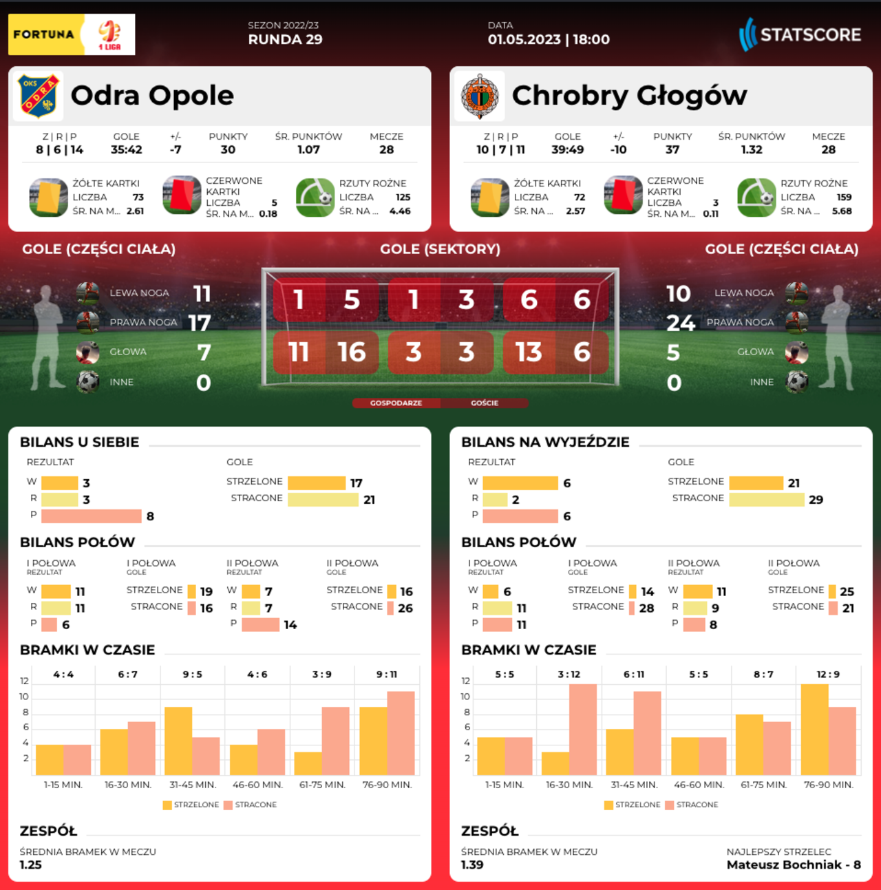 PN. 18.00: Odra Opole - Chrobry Głogów Na zakończenie 29 kolejki Fortuna 1 Ligi Chrobrego czeka wyjazdowy mecz z Odrą Opole. Początek poniedziałkowego spotkania o godz. 18.00. 01-05-2023 12:01 autor: ŁJ Pomarańczowo-Czarni pozostają bez wygranej od siedmiu kolejek i choć ta runda jest dla nich bardzo trudna, podobnie jak jesienią zbierają punkty w pojedynkach z zespołami dolnej części tabeli. O ile rywalizacja z bijącymi się o awans okazuje się nie do przejścia, o tyle w spotkaniach z Chojniczanką, Zagłębiem, Sandecją czy Resovią głogowska drużyna nie poniosła porażki. Odra Opole jest kolejnym tego typu zespołem i Chrobry może udowodnić, że choć góra to jeszcze nie teraz, to nad dołem ma kontrolę. Opolanie przed startem weekendowej kolejki zajmowali ostatnie bezpieczne, 15 miejsce, ale wygrana Skry Częstochowa zepchnęła ich do strefy spadkowej. Mają w swoim dorobku 30 punktów, więc przy 37 ze strony głogowian łatwo obliczyć, że ta rywalizacja ma sportowe znaczenie dla obu stron. Emocji nie powinno zabraknąć, podobnie jak jesienią, kiedy to zespoły podzieliły się punktami. Przy Wita Stwosza było 2:2 po golach Mateusza Bochnaka i Sebastiana Stebleckiego oraz po stronie rywali Macieja Makuszewskiego i Mateusza Marca. Po jednym strzelcu w każdej drużynie już nie ma, bo barwy zmienił nie tylko Bochnak, ale też Marzec. Trzeba liczyć między innymi na Stebleckiego, tym bardziej że z powodu żółtych kartek w Opolu nie będzie mógł wystąpić grający z przodu Kamil Wojtyra. 30-04-2023 Przed meczem z Odrą Opole Na dzień przed meczem w Opolu zbiór najważniejszych informacji. Wydaje się, że Chrobry będzie musiał zagrać znacznie lepiej niż w trakcie całej rundy. Odra mocno walczy o uniknięcie spadku i to dobrze widać po ostatnich tygodniach. Za drużyną trenera Adama Noconia trzy spotkania z rzędu bez porażki, z siedmioma punktami i sześcioma strzelonymi bramkami. Chrobry za minione serie takich liczb nie ma (dwa punkty, jeden gol), więc będzie musiał na nie zapracować, aby podtrzymać niezłą serię w starciach z rywalami, których ma za sobą. Transmisja z meczu w Polsat Box Go. Możesz też aktywować jednorazowy dostęp do meczu - PRZEJDŹ DO STRONY TRANSMISJI O KLUBIE Pełna nazwa: OKS Odra Opole Spółka Akcyjna Rok powstania: 1945 Adres: Oleska 51, 45-231 Opole Internet: www.oksodraopole.pl (oficj.) Barwy: niebiesko-czerwone Sukcesy: - 3. miejsce w I lidze - 1963/64 - 3. miejsce w Pucharze Polski - 1961/62 - 1/2 finału Pucharu Polski - (4x) - 1954/55, 1966/67, 1980/81, 2000/01 Stadion: - Stadion Miejski Odra - pojemność - 3300 miejsc - oświetlenie - 1600 lx - boisko - 105 x 72m Bramkarze: Artur Haluch (95), Dominik Kalinowski (85). Obrońcy: Mateusz Kamiński (88), Łukasz Kędziora (98), Konrad Kostrzycki (96), Artur Pikk (93), Maksymilian Pingot (03), Mateusz Spychała (98), Jakub Szrek (97), Maksymilian Tkocz (02), Piotr Żemło (95). Pomocnicy: Wojciech Kamiński (01), Michal Klec (95), Antoni Klimek (02), Mikołaj Łabojko (01), Maciej Makuszewski (89), Tomas Mikinič (92), Rafał Niziołek (89), Konrad Nowak (94), Oskar Paprzycki (98), Maksymilian Paszkowski (04), Szymon Szkliński (06), Maciej Urbańczyk (95), Maciej Wróbel (03). Napastnicy: Michał Bednarski (96), Dawid Czapliński (92), Borja Galan (93), Bartosz Guzdek (02). Trener: Adam Nocoń.