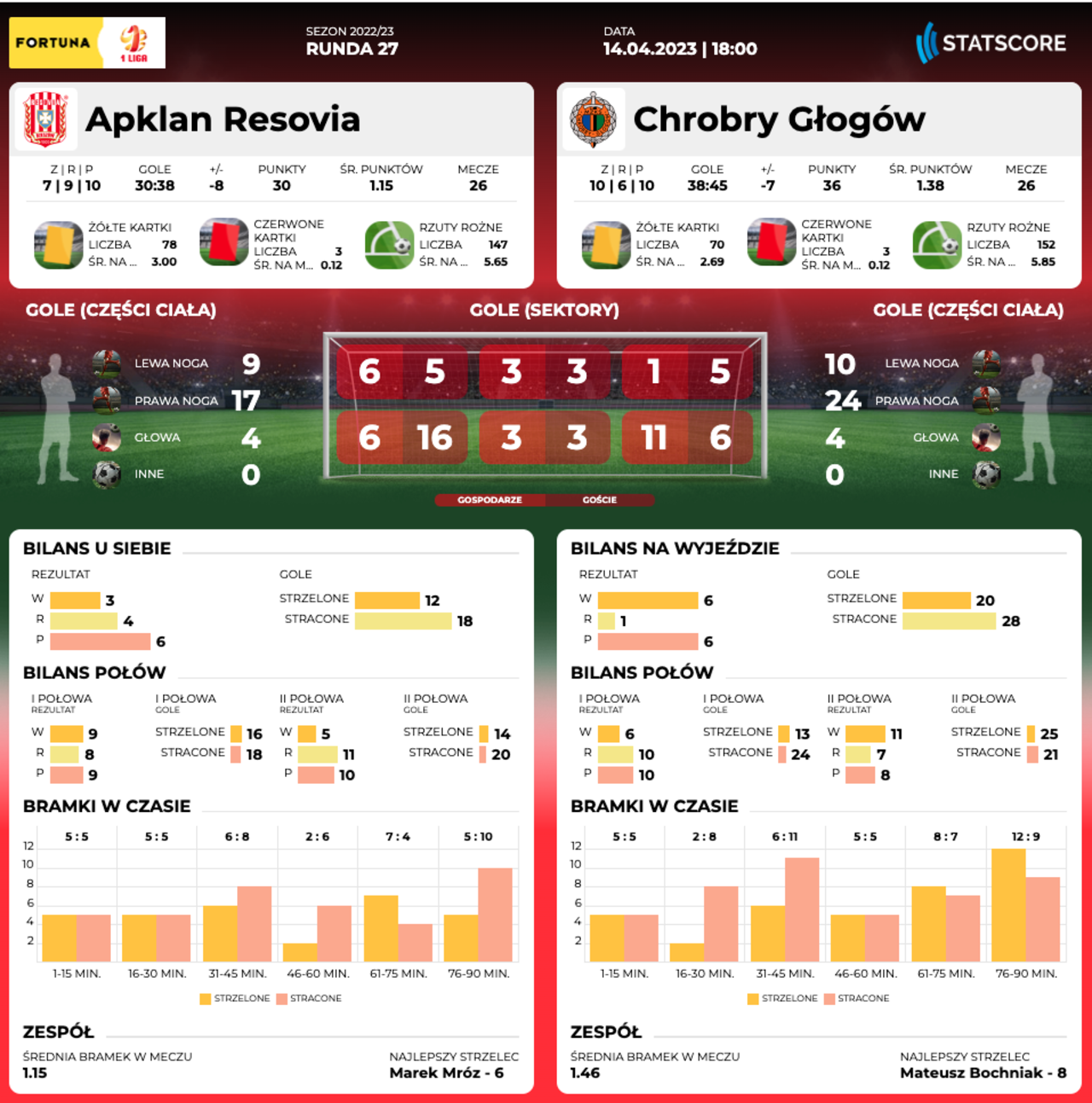 PT. 18.00: Resovia Rzeszów - Chrobry Głogów O godz. 18.00 rozpocznie się wyjazdowy mecz Chrobrego Głogów z Resovią Rzeszów. 14-04-2023 12:13 autor: ŁJ Dla Chrobrego to piąty wyjazd w rundzie wiosennej, ale pierwszy na teren zespołu z drugiej części tabeli. Po 26 kolejkach Resovia jest na 13 pozycji, podczas gdy wcześniejsi wyjazdowi przeciwnicy – Ruch, ŁKS, Podbeskidzie i Wisła – byli przynajmniej w dziewiątce. Z drugiej jednak strony trzeba wziąć pod uwagę aktualną dyspozycję. Tylko w tym roku Resovia zdobyła trzynaście punktów na 30 łącznie i pod względem tego dorobku jest piąta w tabeli wiosny. Do meczowego składu Chrobrego powrócił pauzujący ostatnio za kartki Jaka Kolenc, jednak z powodu otrzymanej ostatnio czerwonej nie będzie mógł zagrać Dawid Hanc. Bez względu na wyniki 27 kolejki Pomarańczowo-Czarni nie spadną poniżej aktualnie zajmowanej dziewiątej pozycji. Mogą za to przesunąć się do przodu, do czego potrzebne będą pomyślne wyniki z innych stadionów. Głogowianie tracą do ósmej Stali Rzeszów punkt, a do siódmego Podbeskidzia Bielsko-Biała dwa. Najważniejsze jednak to samemu odnieść zwycięstwo, a tym samym przełamać się po sześciu występach z rzędu bez niego. 12-04-2023 Przed meczem z Resovią Ostatnie wyjazdy nie były łaskawe dla Chrobrego Głogów, który z ciążącym bagażem doświadczeń przystąpi do kolejnego. W piątek o godz. 18.00 mecz z Resovią Rz... Transmisja z meczu w Polsat Sport Extra oraz w Polsat Box Go. Możesz też aktywować jednorazowy dostęp do meczu - PRZEJDŹ DO STRONY TRANSMISJI O KLUBIE Pełna nazwa: CWKS Resovia Rzeszów Spółka Akcyjna (Cywilno-Wojskowy Klub Sportowy Resovia) Rok powstania: 1910 Adres: ul. Wyspiańskiego 22, 35-111 Rzeszów Internet: www.cwks-resovia.pl (oficj.) Barwy: biało-czerwone Sukcesy: 1/2 finału Pucharu Polski - 1980/81 2. miejsce w II lidze - 1982/83 Stadion: - Resovia domowe mecze rozgrywa obecnie na Stadionie Miejskim - 11 547 miejsc seidzących - murawa 105x68m Bramkarze: Tadeusz Grabowski (03), Paweł Łakota (01), Branislav Pindroch (91), Nikodem Sujecki (03). Obrońcy: Mateusz Bondarenko (99), Karol Chuchro (03), Ruben Hoogenhout (99), Miłosz Kałahur (99), Aleksander Komor (94), Rafał Mikulec (97), Nikodem Niski (02), Łukasz Seweryn (02). Pomocnicy: Radosław Adamski (92), Kamil Antonik (98), Radosław Bąk (04), Bruno Garcia (97), Bartłomiej Eizenchart (01), Radosław Kanach (99), Mehdi Lehaire (00), Jakub Maćkowiak (05), Marek Mróz (99), Łukasz Ostrowski (04), Kornel Rębisz (05), Kacper Szymkiewicz (03), Bartłomiej Wasiluk (95). Napastnicy: Maciej Górski (90), Filip Mikrut (03), Pedro Vieira (02), Dawid Pieniążek (05), Jakub Sylvestr (89). Trener: Mirosław Hajdo.