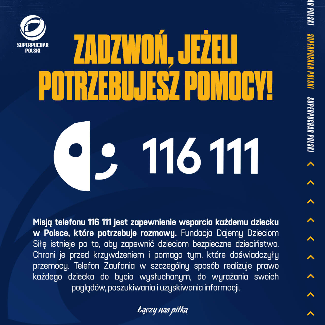 PZPN wspiera walkę z przemocą wobec dzieci Już w najbliższą sobotę, 15 lipca dojdzie do rywalizacji, która otworzy nowy sezon rozgrywek piłkarskich w Polsce. Mistrz kraju, Raków Częstochowa, o godzinie 20:10 podejmie przed własną publicznością zdobywcę Fortuna Pucharu Polski – Legię Warszawa. Przy okazji tego wydarzenia Polski Związek Piłki Nożnej nawiązał współpracę z Fundacją Dajemy Dzieciom Siłę, by nagłośnić inicjatywę 116 111 – telefonu zaufania dla dzieci i młodzieży prowadzonego przez Fundację Dajemy Dzieciom Siłę. 14-07-2023 10:00 autor: ŁJ – Polski Związek Piłki Nożnej stanowczo sprzeciwia się przemocy wobec najmłodszych, dlatego zdecydowaliśmy, że podczas meczu Rakowa Częstochowa z Legią Warszawa na stadionowym brandingu eksponowany będzie numer 116 111. Wraz z Fundacją Dajemy Dzieciom Siłę dołożymy wszelkich starań, żeby nasza wyjątkowa akcja odbiła się szerokim echem. Wszystko po to, aby dotrzeć do jak największej liczby odbiorców, którzy potrzebują pomocy – powiedział Sekretarz Generalny PZPN Łukasz Wachowski. – Chciałabym, żeby numer 116 111, czyli numer telefonu zaufania dla dzieci i młodzieży prowadzonego przez Fundację Dajemy Dzieciom Siłę, znało każde dziecko w Polsce. Telefon pracuje przez całą dobę, z konsultantami i konsultantkami można porozmawiać o wszystkim, co ważne. Klasówce, która poszła nie tak, zdenerwowaniu przed randką, przemocy, której wiele dzieci doświadcza w domu – i o każdej innej sprawie. Bardzo potrzebna jest przestrzeń, gdzie dziecko zostanie wysłuchane przez życzliwego dorosłego bez oceniania, a nasz telefon jest właśnie takim bezpiecznym i profesjonalnie działającym miejscem. Cieszymy się, że Polski Związek Piłki Nożnej zaangażował się w popularyzację numeru 116 111 – mówi Beata Wojtkowska, członkini zarządu Fundacji Dajemy Dzieciom Siłę. 116 111 jest bezpłatnym, ogólnopolskim telefonem zaufania dedykowanym dzieciom oraz młodzieży. Uruchomiono go w 2008 roku, zgodnie z decyzją Komisji Europejskiej o rezerwacji numeru 116 111 w krajach Unii Europejskiej na potrzeby działania telefonów zaufania. W Polsce z powodzeniem prowadzi go Fundacja Dajemy Dzieciom Siłę. To największa organizacja pozarządowa, której głównym celem jest ochrona przed krzywdzeniem oraz pomoc tym osobom, które doświadczyły przemocy. Fundacja chce zapewnić każdemu potrzebującemu bezpieczne dzieciństwo i dąży do ochrony praw określonych w konwencji o prawach dziecka. Telefon 116 111 w szczególny sposób realizuje prawo każdego dziecka do bycia wysłuchanym, do wyrażania swoich poglądów oraz poszukiwania i uzyskiwania informacji. Trzy minuty – średnio co tyle czasu najmłodsi szukają wsparcia i korzystają z telefonu zaufania dla dzieci i młodzieży Fundacji Dajemy Dzieciom Siłę. W ciągu piętnastu lat działalności z numeru skorzystano blisko 1,4 miliona razy, fundacja odpisywała również na tysiące wiadomości od potrzebujących. Tematy rozmów dotyczyły zdrowia psychicznego, relacji z bliskimi, rówieśnikami, trudnych doświadczeń czy przemocy. Przeprowadzono również kilkanaście tysięcy interwencji, które pozwoliły uratować zdrowie i życie najmłodszych. Promowanie 116 111 – telefonu zaufania dla dzieci i młodzieży podczas meczu o Superpuchar Polski 2023 to zapowiedź szeregu działań, które w najbliższym czasie wdroży Polski Związek Piłki Nożnej. Pierwszym z nich było przyjęcie przez zarząd federacji „Polityki Bezpieczeństwa Dzieci”. Dokument składa się z zestawu wprowadzić w organizacjach sportowych zasady postępowania dla trenerów, współpracowników, rodziców i dzieci. Naszym celem jest wdrożenie tych narzędzi w podmiotach piłkarskich i zadbanie o bezpieczeństwo dzieci w piłce nożnej.