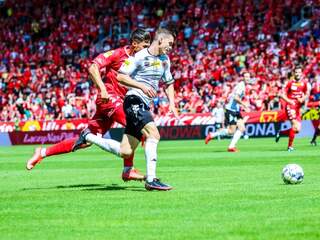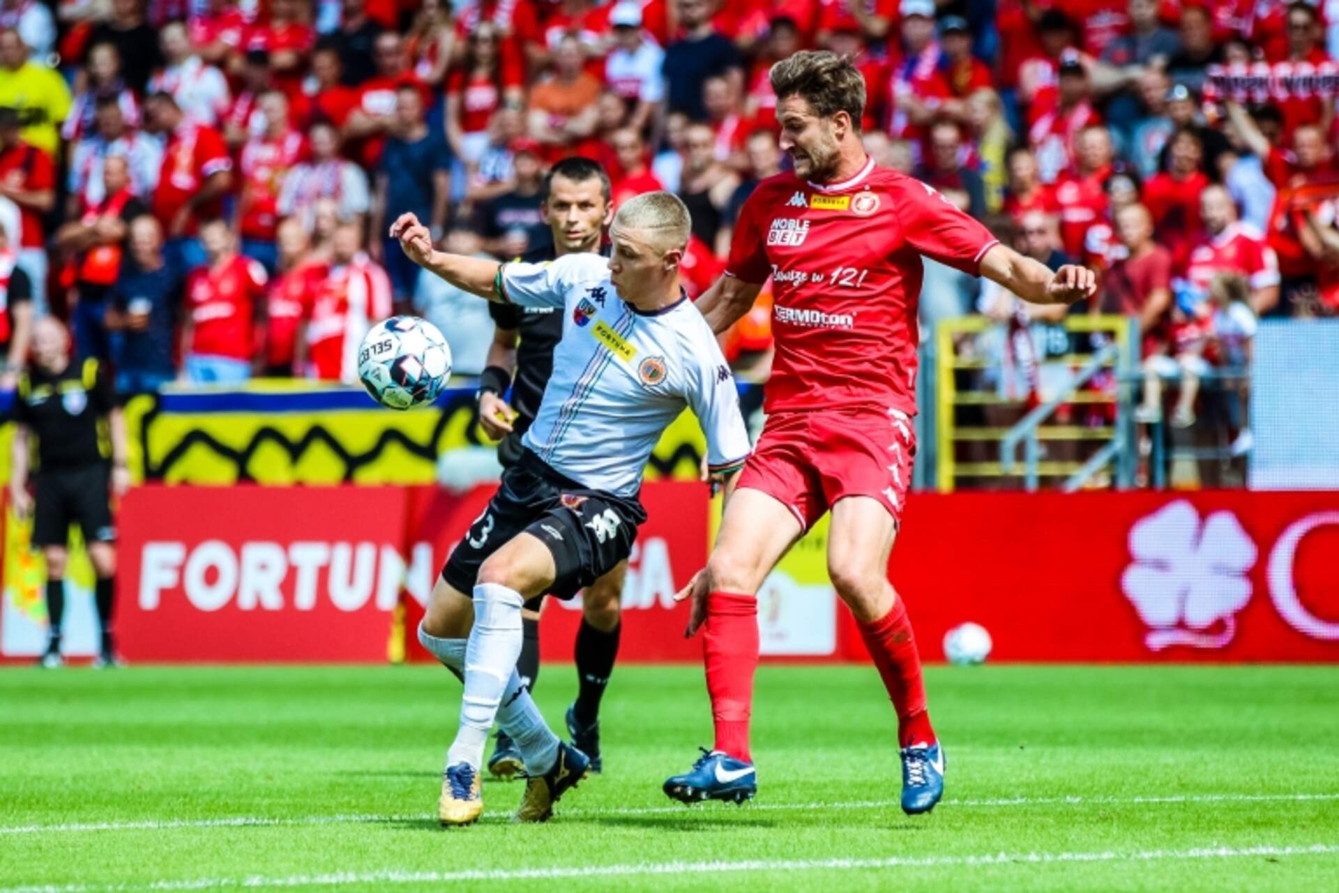 Pechowy gol i porażka w Łodzi Widzew Łódź wygrał różnicą dwóch goli, 2:0, ale zadecydował głównie ten jeden - pechowy z 11 minuty. Chrobry wraca z Łodzi bez punktów, lecz cały czas z dobrym początkiem w lidze, mając sześć na dziewięć możliwych… 15-08-2021 04:35 autor: ŁJ Widzew Łódź wygrał różnicą dwóch goli, 2:0, ale zadecydował głównie ten jeden - pechowy z 11 minuty. Chrobry wraca z Łodzi bez punktów, lecz cały czas z dobrym początkiem w lidze, mając sześć na dziewięć możliwych punktów.W Łodzi Chrobry po raz drugi wystąpił bez Mateusza Machaja, a poza chorującym trenerem Ivanem Djurdjeviciem listę absencji powiększył Dominik Piła. Podstawowy młodzieżowiec został wyeliminowany z gry przez kontuzję i choć tylko na kilka dni, po dobrych ostatnich występach była to duża strata dla drużyny. Jego miejsce zajął Dominik Dziąbek.Mecz nie zaczął się dla Chrobrego dobrze. Już w 11 minucie gospodarze byli na prowadzeniu. Piłka była adresowana w pole karne do Mateusza Michalskiego i choć nie zdołał jej przyjąć, niefortunnie odbiła się od Mavroudisa Bougaidisa i wpadła do środka. 120 sekund wcześniej Rafał Leszczyński ruszył z własnej bramki, by zapobiec zagrożeniu. Paweł Tomczyk zdążył go uprzedzić, choć w światło bramki nie trafił. Początek wyraźnie należał więc dla Widzewa i dopiero po stracie gola głogowianie odważniej pokazali się z przodu. Najpierw blokowano uderzenia Tomasza Cywki i Dominika Dziąbka, a między 28 a 29 minutą Pomarańczowo-Czarni przycisnęli bardziej. Po dograniu z boku Mateusza Bochnaka golkiper łodzian Jakub Wrąbel wypluł futbolówkę przed siebie, tyle że nie zdołał zamknąć tego będący blisko Dominik Dziąbek. Po chwili z kilkunastu metrów przymierzył Dennis van der Heijden, lecz tym razem bramkarz RTS-u stanął na posterunku.Jeszcze w 40 minucie groźnie zrobiło się po drugiej stronie, gdy Dominik Kun pewnie zrobił wjazd w szesnastkę Chrobrego, ale oddał niecelny strzał. Po pierwszej połowie było 1:0 dla Widzewa.Po przerwie mogło być 2:0, ale będący na bardzo dobrej pozycji Karol Danielak nie zdołał wykończyć zespołowej akcji. Były zawodnik Chrobrego uderzył mocno, lecz niecelnie. W 53 minucie sam na sam wyszedł Dennis van der Heijden. Przyblokowany przez bramkarza i jednego z graczy łodzian został wytrącony z równowagi i koniec końców nie oddał skutecznego strzału. Nawet gdyby jednak udało mu się doprowadzić do wyrównania, sędzia ostatecznie zasygnalizował pozycję spaloną. Poza tym Chrobry nie miał wiele "czystych" okazji z przodu, ale nie można powiedzieć, że swojej szansy nie szukał. W 74 minucie z rzutu wolnego dośrodkował Adam Banasiak, głową futbolówkę bliżej bramki zgrał Mavroudis Bougaidis i szkoda, że próbujący to zamknąć Michał Ilków-Gołąb posłał piłkę za wysoko.W końcowych minutach Pomarańczowo-Czarni starali się przebić przez łódzką defensywę i po jednej z takich prób zostali zatrzymani. Gospodarze ruszyli z kontrą, którą domknął Bartosz Guzdek i wygrana RTS-u stała się faktem.Już za kilka dni kolejny mecz o ligowe punkty. W czwartek o godz. 18.00 głogowianie zmierzą się na wyjeździe z Górnikiem Polkowice.