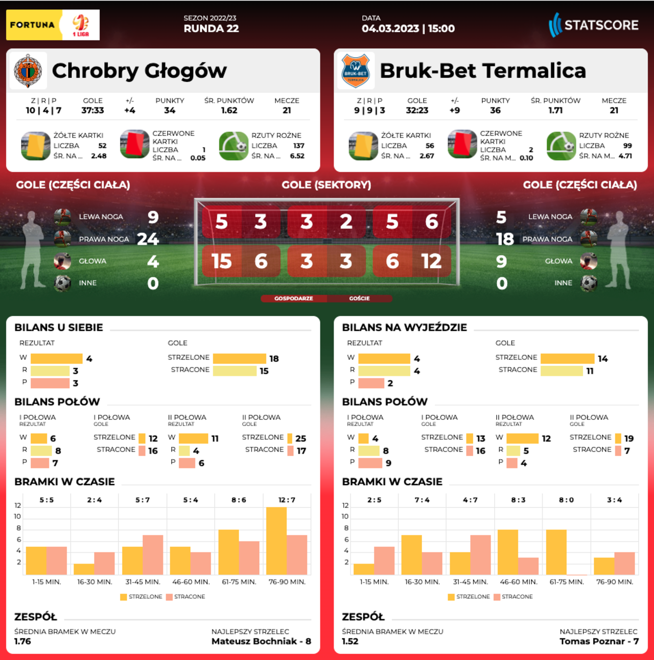 DZIEŃ MECZU: Chrobry Głogów - Termalica Nieciecza 04-03-2023 12:35 autor: ŁJ Nie ma łatwego startu zespół Chrobrego, który grał już z pierwszą dwójką, a teraz podejmie będącą na najniższym stopniu podium Termalikę (nie licząc już rozegranych spotkań 22 serii, bo po piątkowych meczach rywala z trzeciej pozycji zepchnęli Puszcza Niepołomice z Arką Gdynia). Niecieczanie bardzo dobrą dyspozycję potwierdzają już od dłuższego czasu. Osiem ostatnich kolejek w ich wykonaniu to same zwycięstwa i remisy. Przed tygodniem zespół trenera Radoslava Latala odniósł piąte w tym okresie zwycięstwo, pokonując Skrę Częstochowa 1:0. Właśnie po tej wygranej przez kilka dni był tuż za najlepszą dwójką Fortuna 1 Ligi. 01-03-2023 Nasz rywal: Bruk-Bet Termalica Nieciecza To dopiero czwarty występ rundy wiosennej, a Chrobry grał już z liderem, wiceliderem i teraz zagra z trzecim Bruk-Betem Termaliką Nieciecza. Problemem głogowian może być strata na ten mecz Patryka Muchy, który musi pauzować na żółte kartki. Z drugiej strony bez względu na sytuację kadrową świetnie radzą sobie na swoim stadionie, na którym ostatnią porażkę ponieśli 14 sierpnia, kiedy to przegrali z Podbeskidziem Bielsko-Biała. Po tym seryjnie punktowali. Kończyli z remisem nawet wtedy, gdy Stal Rzeszów prowadziła już 3:0. Teraz nie jeden, a być może całe trzy punkty mogą być potrzebne, aby utrzymać miejsce w szóstce. Goniąca Wisła Kraków ma punkt straty, a Podbeskidzie Bielsko-Biała dwa. Bilety na mecz do momentu rozpoczęcia spotkania dostępne są na bilety.chrobry-glogow.pl i do godziny przed rozpoczęciem spotkania w kasach pływalni Chrobry (bilety ulgowe 10 zł / bilety normalne 20 zł). Kasa stadionu otwarta zostanie na godzinę przed meczem, a w niej bilety będą w cenach: ulgowe 15 zł / normalne 25 zł. Dzieci do 7 roku życia na stadion wchodzą za darmo. Transmisja z meczu w Polsat Box Go. Możesz też aktywować jednorazowy dostęp do meczu - PRZEJDŹ DO STRONY TRANSMISJI O KLUBIE Pełna nazwa: Bruk-Bet Termalica Nieciecza Klub Sportowy Spółka Akcyjna Rok powstania: 1922 Adres: Nieciecza 199, 33-240 Żabno Internet: www.termalica.brukbet.com Barwy: pomarańczowo-żółto-niebieskie Sukcesy: 8. miejsce w Ekstraklasie - 2016/17 1/8 finału Pucharu Polski - (3x) - 2017/18, 2018/19, 2021/22 Stadion: - pojemność - 4595 miejsc - oświetlenie - 1942 lx - boisko - 103 m x 64 m Bramkarze: Krystian Bartoszek (02), Tomasz Loska (96), Eric Topór (05). Obrońcy: Wiktor Biedrzycki (97), Jakub Banasik (02), Marcel Błachewicz (03), Jakub Cukrowski (02), Bartosz Farbiszewski (02), Marcin Grabowski (00), Andrej Kadlec (96), Bartłomiej Kukułowicz (00), Artem Putivtsev (88), Nemanja Tekijaski (97). Pomocnicy: Maciej Ambrosiewicz (98), Andriy Dombrovskyi (95), Mariusz Fornalczyk (03, Roman Gergel (88), Michal Hubinek (94), Vlastimir Jovanovic (85), Kacper Karasek (02), Tomasz Matuszewski (01), Daniel Pietraszkiewicz (01), Artem Polarus (92), Florin Purece (91), Adam Radwański (98), Rajko Rep (90), Bruno Wacławek (01), Taras Zaviyskyi (95). Napastnicy: Damian Hilbrycht (98), Muris Mesanovic (90), Tomas Poznar (88), Kacper Śpiewak (00), Andrzej Trubeha (97). Trener: Radoslav Latal.