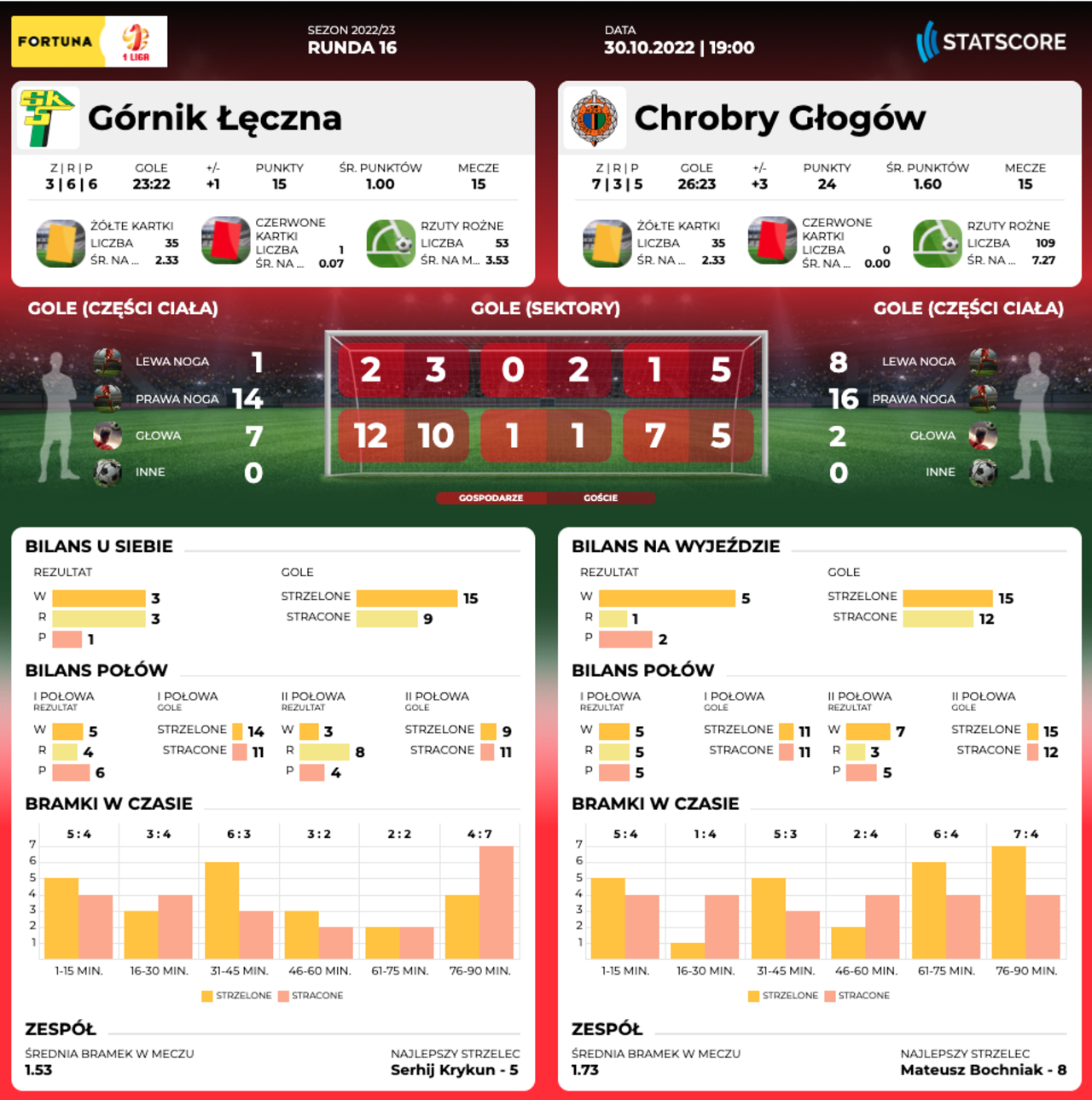 SB. 18.00: Górnik Łęczna - Chrobry Głogów Czas na ostatni w 2022 roku mecz wyjazdowy. O godz. 18.00 Górnik Łęczna - Chrobry Głogów. 30-10-2022 12:05 autor: ŁJ Chrobry w tym sezonie punktuje najbardziej na wyjazdach, z których wrócił już z pięcioma zwycięstwami. Górnikowi natomiast lepiej wychodzi gra na swoim stadionie, bo o ile poza Łęczną drużyna trenera Marcina Prasoła nie odniosła jeszcze zwycięstwa, o tyle we własnym mieście ma trzy na swoim koncie, a na siedem takich występów tylko jedną porażkę. Jedynym zespołem, który do tej pory wygrał w Łęcznej jest Arka Gdynia. Być może łatwiej byłoby o dołączenie w tym elemencie do Arki we wcześniejszych miesiącach, bo Górnik w sierpniu, Górnik we wrześniu i Górnik w październiku to częściowo inne drużyny. Po spadku z Ekstraklasy i licznych zmianach kadrowych musiało minąć siedem kolejek, żeby w tej ósmej Górnik wygrał po raz pierwszy. Za to w październiku zapunktował w czterech z pięciu ligowo-pucharowych meczach, odnosząc trzy wygrane. 29-10-2022 Mecz bramkostrzelnych. Nasz rywal: Górnik Łęczna W niedzielę o godz. 18.00 w Łęcznej Górnik – Chrobry. To starcie zespołów, które pod względem liczby zdobywanych bramek są jednymi z pierwszych sześciu w For... W Chrobrym z powodu czterech żółtych kartek zabraknie Roberta Mandrysza i to duża strata, bo w tym sezonie ma bardzo mocną pozycję w zespole, a w ostatnim meczu zagrał z opaską kapitana. Pomarańczowo-Czarni stoją przed dużą szansą, bo w przypadku kolejnego wyjazdowego zwycięstwa awansują do pierwszej piątki. Do piątego Podbeskidzia Bielsko-Biała, które w tej kolejce już grało, tracą tylko punkt. Transmisja z meczu w Polsat Box Go. Możesz też aktywować jednorazowy dostęp do meczu - PRZEJDŹ DO STRONY TRANSMISJI O KLUBIE Pełna nazwa: Górnik Łęczna Spółka Akcyjna Rok powstania: 1979 Adres: Aleja Jana Pawła II 13, 21-010 Łęczna Internet: www.gornik.leczna.pl (oficj.) Barwy: zielono-czarne Sukcesy: 7. miejsce w I lidze - 2004/05 1/4 finału Pucharu Polski - (2x) - 2000/01, 2021/22 1/2 finału Pucharu Ekstraklasy - 2006/07 Stadion: - pojemność - 7200 miejsc - oświetlenie - 1400lx - boisko - 105x68m Bramkarze: Maciej Gostomski (88), Mikołaj Kiliszek (05), Tomasz Woźniak (02). Obrońcy: Marcin Biernat (92), Souleymane Cisse (99), Jonathan de Amo (90), Kamil Duda (04), Daniel Dziwniel (92), Ruben Lobato (94), Viktor Lykhovydko (92), Karol Turek (00), Damian Zbozień (89). Pomocnicy: Jakub Czelej 97), Damian Gąska (96), Łukasz Grzeszczyk (87), Grzegorz Gulczyński (96), Egzon Kryeziu (00), Sergiy Krykun (96), Jakub Kwiatkowski (03), Szymon Lewkot (99), Patryk Pierzak (03), Arkadiusz Pluta (04), Łukasz Szramowski (02), Dawid Tkacz (05), Szymon Zabłotny (05). Napastnicy: Mateusz Golba (03), Karol Podliński (97), Hubert Sobol (00), Michał Szałachowski (04). Trener: Marcin Prasoł.