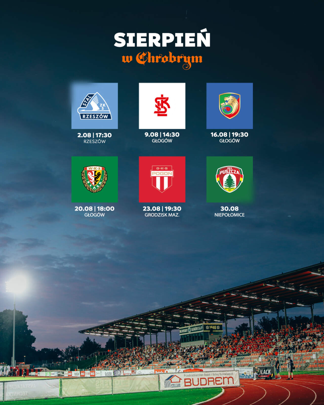 Sierpień w Chrobrym Sprawdzamy, co nas czeka w sierpniu. A w nim aż sześć meczów, w tym połowa w Głogowie, spośród których na pierwszy plan wysuwają się derby z Miedzią i ze Śląskiem. 01-08-2025 07:13 autor: ŁJ Sobota, 2 sierpnia 17.30 Stal Rzeszów – Chrobry Głogów (Betclic 1 Liga) Sobota, 9 sierpnia 14.30 Chrobry Głogów – ŁKS Łódź (Betclic 1 Liga) Sobota, 16 sierpnia 19.30 Chrobry Głogów – Miedź Legnica (Betclic 1 Liga) Środa, 20 sierpnia 18.00 Chrobry Głogów – Śląsk Wrocław (Betclic 1 Liga) Sobota, 23 sierpnia 19.30 Pogoń Grodzisk Mazowiecki – Chrobry Głogów (Betclic 1 Liga) Sobota, 30 sierpnia Puszcza Niepołomice – Chrobry Głogów (Betclic 1 Liga)* *dokładny termin zostanie wyznaczony przez Departament Rozgrywek Krajowych PZPN