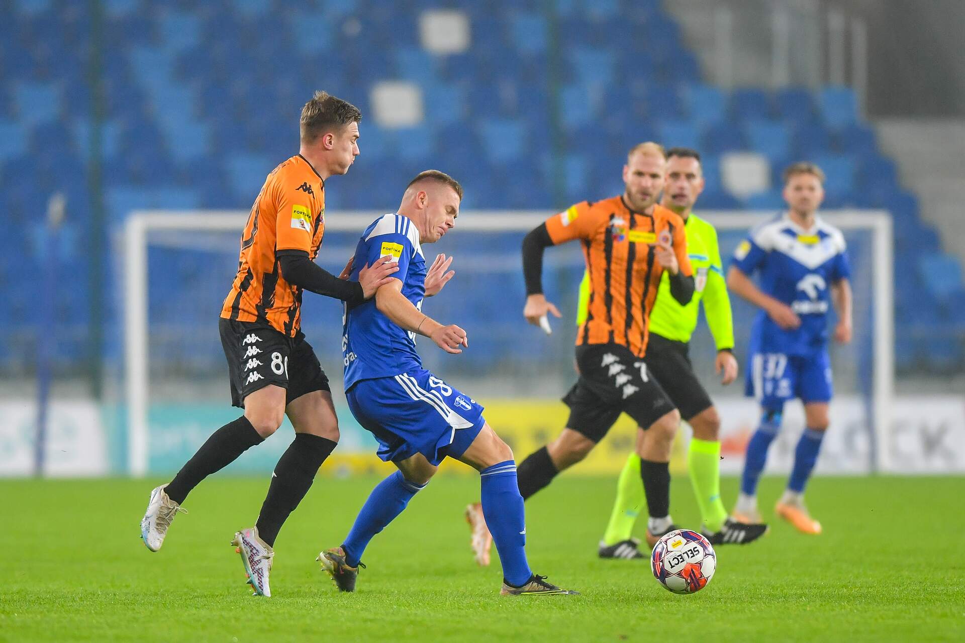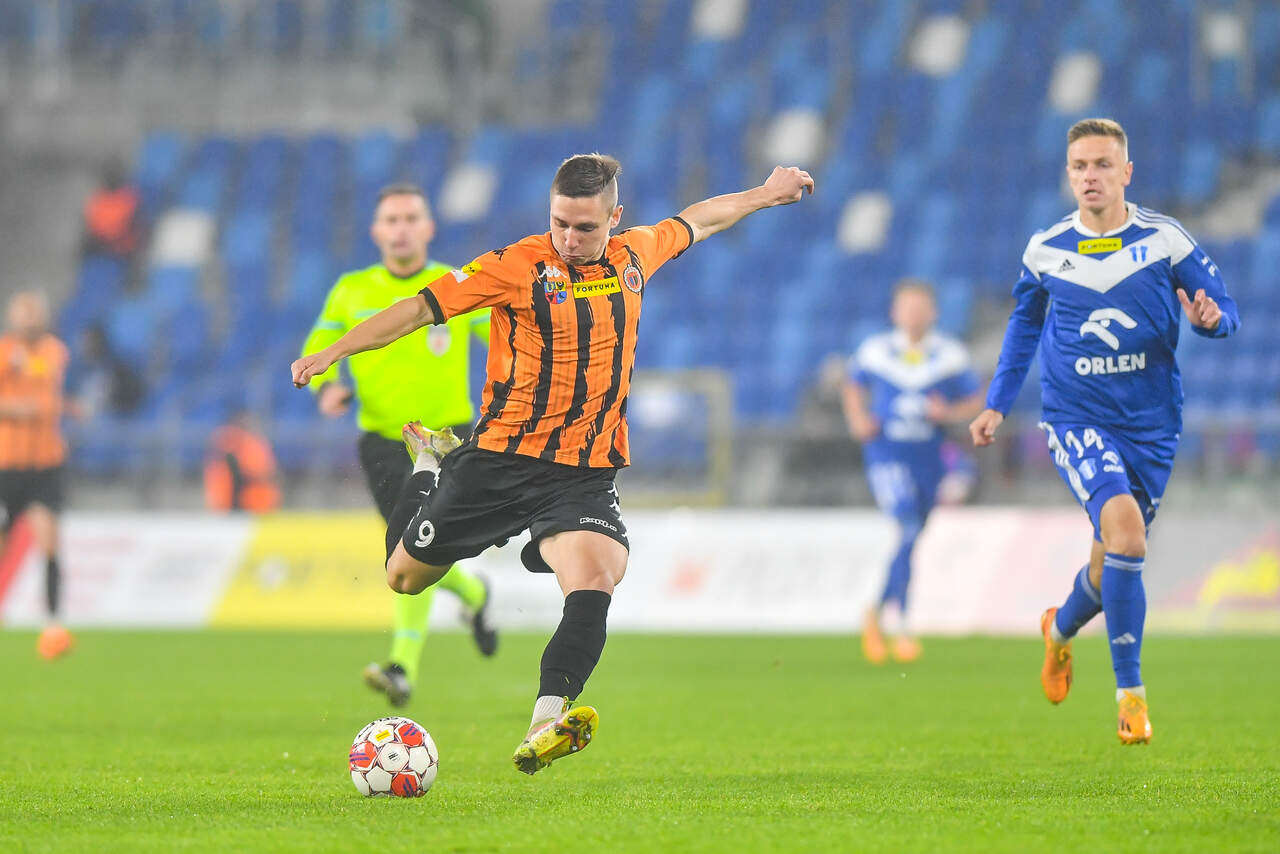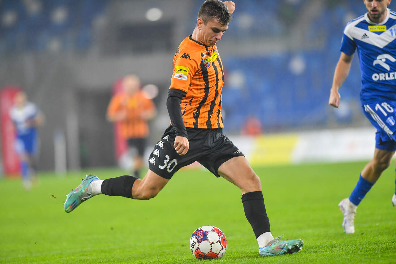 Mimo wielu okazji bez punktów w Płocku Znacznie bardziej aktywny w ofensywie i mający więcej sytuacji Chrobry nie zasłużył na taki koniec, ale po 90 minutach na tablicy zostało 2:1 dla Wisły Płock. 27-10-2023 07:55 autor: ŁJ Trener Piotr Plewnia zdecydował się na kilka zmian w zestawieniu jedenastki. Obronę zasilił Gabriel Estigarribia, zastępując Mavroudisa Bougaidisa, a w podstawie pojawili się też Szymon Bartlewicz z Arturem Boguszem, wobec czego na ławce usiedli Robert Mandrysz i Bartosz Biel. W porównaniu do ostatniego meczu z Motorem Lublin, Chrobry robił dużo w ofensywie, aby mieć z czego strzelić. Co prawda jako pierwszy uderzał Fabian Hiszpański, przy czym interweniował Damian Węglarz, ale głogowianie odpowiadali. Artur Bogusz przymierzył ładnie, choć niecelnie z dystansu, a w 20 minucie po rajdzie Patryka Muchy prawą stroną i jego dograniu w szesnastkę, strzelał Mateusz Ozimek, tyle że i w tym przypadku futbolówka poszybowała ponad poprzeczką. W 32 minucie dobrze na będącego w polu karnym Mikołaja Lebedyńskiego dośrodkował Kacper Tabiś. Mocna główka napastnika Chrobrego, podobnie jak wcześniejsze próby Pomarańczowo-Czarnych, była niecelna, ale trudno było nie odnieść wrażenia, że głogowianie wyciągnęli wnioski, bo konsekwentnie przedzierali się do przodu. Tym bardziej, że po raz drugi w tym pojedynku na uderzenie z dystansu zdecydował się Artur Bogusz. Było to groźne dla gospodarzy, choć ostatecznie piłka nie zmierzała w światło bramki. Mimo tych chęci wynik po 45 minutach pozostawał bez zmian. Celny strzał był po stronie Wisły, lecz więcej miał Chrobry. W drugiej połowie Chrobry nadal intensywnie szukał swojej chociaż jednej, jedynej okazji. Mógł prowadzić w 52 minucie, gdy po wrzutce Patryka Muchy z rzutu rożnego tuż obok bramki główkował Mikołaj Lebedyński. To była najlepsza sytuacja tego meczu, który zaraz po niej zaskakująco ułożył się dla gospodarzy. Jednym wejściem w szesnastkę wywalczyli rzut karny, gdy faulował Kacper Tabiś, i dokładnie w 54 minucie Damiana Węglarza z jedenastego metra pokonał najlepszy strzelec płocczan Łukasz Sekulski. Pomarańczowo-Czarni odpowiedzieli błyskawicznie. Pewny w tym spotkaniu egzekutor stałych fragmentów Patryk Mucha dośrodkował tym razem z rzutu wolnego, a głową golkipera Wisły pokonał Gabriel Estigarribia. To pierwszy gol tego zawodnika w barwach Chrobrego. Wydawało się, że to napędzi głogowian, jednak wykazywać się zaczęli miejscowi. W 65 minucie pomógł Damian Węglarz, który obronił strzał Mateusza Szwocha i dobitkę. W tym okresie to rywale naciskali i 120 sekund później znów objęli prowadzenie, a na listę strzelców po raz drugi wpisał się Łukasz Sekulski. To trochę podcięło skrzydła aktywnemu w tym spotkaniu Chrobremu, choć nie na tyle, aby nie mieć kolejnych sytuacji. Próbowali jeszcze Kamil Wojtyra z Mateuszem Ozimkiem, a już w 90 minucie po kolejnej główce Wojtyry piłkę z linii bramkowej wybił Jakub Gric... Następnie niemal to samo po strzale Bartosza Biela zrobił Beniamin Czajka… Trzy punkty zostały więc w Płocku. Co za pech. Teraz ponad tydzień przerwy, bo mecz 14 kolejki ze Zniczem Pruszków w poniedziałek 6 listopada. Rozpocznie się o godz. 18.00 na stadionie w Głogowie. Fot. 400mm.pl