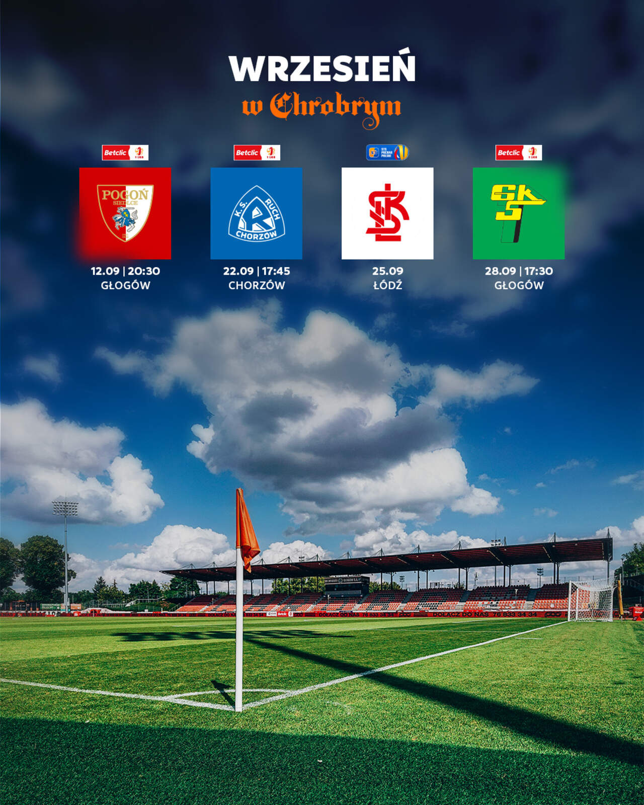 Wrzesień w Chrobrym Mecze reprezentacji powodują, że w planie na wrzesień jest mniej meczów, ale są dwa w Głogowie, wyjazdowy z Ruchem Chorzów i start w STS Pucharze Polski. 01-09-2025 09:13 autor: ŁJ Piątek, 12 września 20.30 Chrobry Głogów - Pogoń Siedlce (Betclic 1 Liga) Poniedziałek, 22 września 17.45 Ruch Chorzów - Chrobry Głogów (Betclic 1 Liga) Czwartek, 25 września ŁKS Łódź - Chrobry Głogów (STS Puchar Polski - I runda)* Niedziela, 28 września 17.30 Chrobry Głogów – Górnik Łęczna (Betclic 1 Liga) *dokładny termin zostanie wyznaczony przez gospodarza meczu