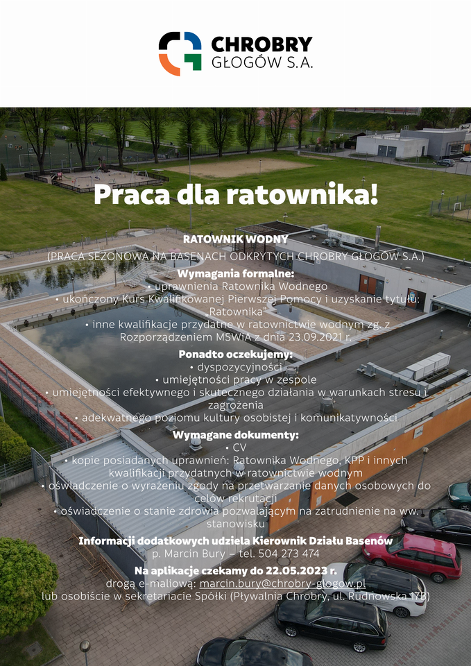 Od czerwca do końca sierpnia w Chrobrym Głogów trwa sezon letni. W tym okresie czynne są Baseny Zewnętrzne. Aby zapewnić bezpieczeństwo podczas korzystania z wodnych atrakcji i odpowiednią jakość wody poszukujemy ratowników wodnych i technologów wody.