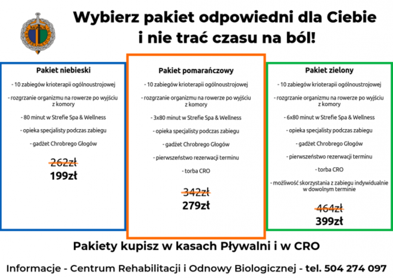 Promocyjne pakiety na zabiegi krio Krioterapia to leczenie zimnem w temperaturze nawet -160 st. C. Pomaga pokonać ból. Usprawnia pracę stawów. A co ważne w okresie jesienno-zimowym podnosi odporność organizmu. Aby wesprzeć organizm przygotowaliśmy pakiety… 12-10-2019 12:09 autor: MK Krioterapia to leczenie zimnem w temperaturze nawet -160 st. C. Pomaga pokonać ból. Usprawnia pracę stawów. A co ważne w okresie jesienno-zimowym podnosi odporność organizmu. Aby wesprzeć organizm przygotowaliśmy pakiety promocyjne zabiegów krioterapii ogólnoustrojowej.Promocja trwa od 14 do 28 października. Pakiety są dostępne w kasach Pływalni i w Centrum Rehabilitacji i Odnowy Biologicznej. Aby skorzystać z zabiegu krioterapii potrzebne jest skierowanie od lekarza!