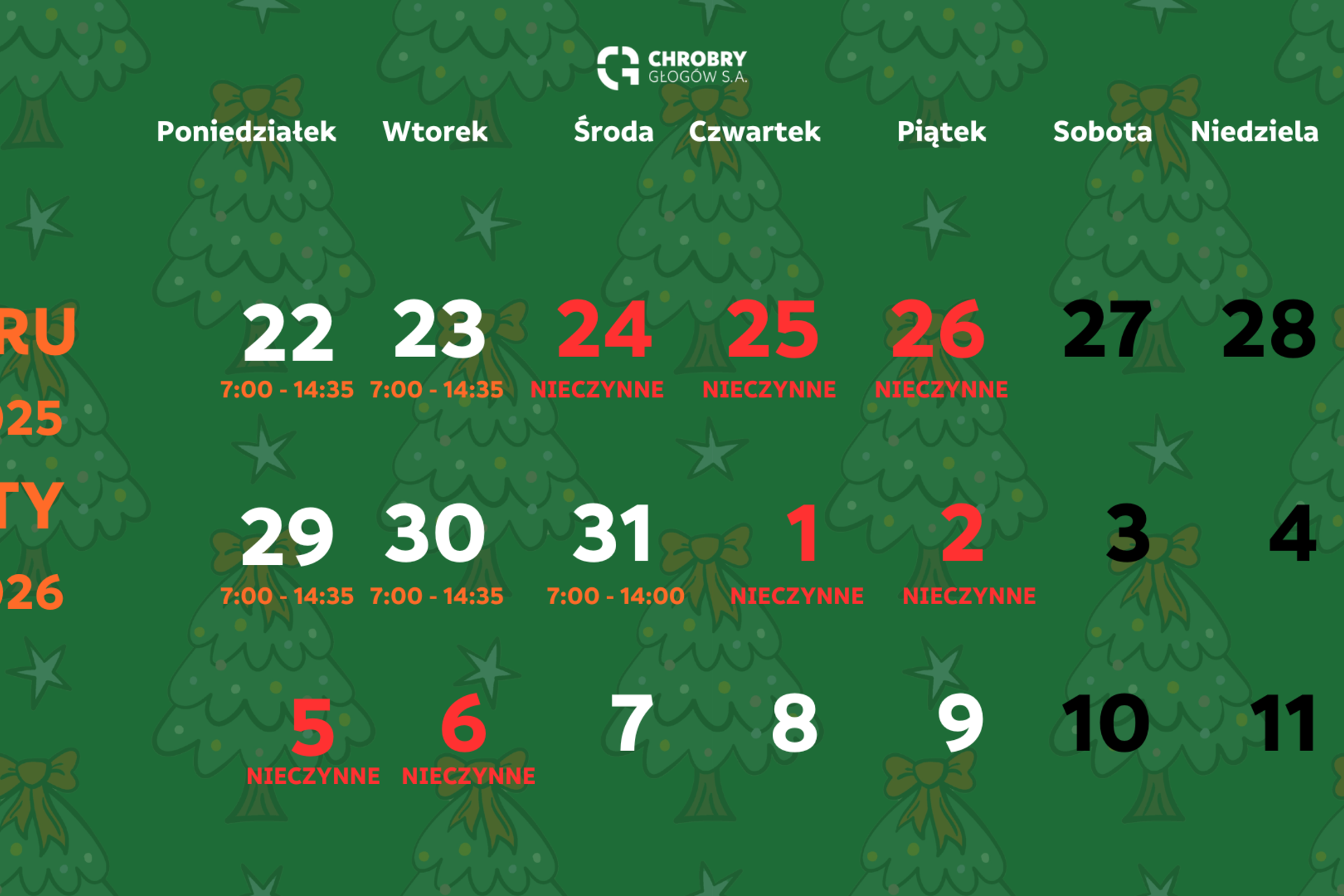 Harmonogram pracy Centrum Rehabilitacji Chrobry Głogów w okresie Świąt Bożego Narodzenia i Nowego Roku 12-12-2025 10:35 autor: BK Szanowni Państwo,w związku ze zbliżającym się okresem świąteczno–noworocznym informujemy o zmianach w godzinach funkcjonowania naszego Centrum Rehabilitacji: 📆 22–23 grudniaCRO pracuje w godzinach 7:00–14:35. ❌ 24–26 grudniaW tych dniach CRO będzie nieczynne — to czas przeznaczony na świąteczny odpoczynek z najbliższymi. 📆 29–30 grudniaJesteśmy do Państwa dyspozycji w godzinach 7:00–14:35. 📆 31 grudniaJesteśmy do Państwa dyspozycji w godzinach 7:00–14:00. ❌ 1–6 styczniaCRO pozostaje nieczynne. 📣 Od 7 styczniaWracamy do pracy i widzimy się ponownie w pełnym składzie.