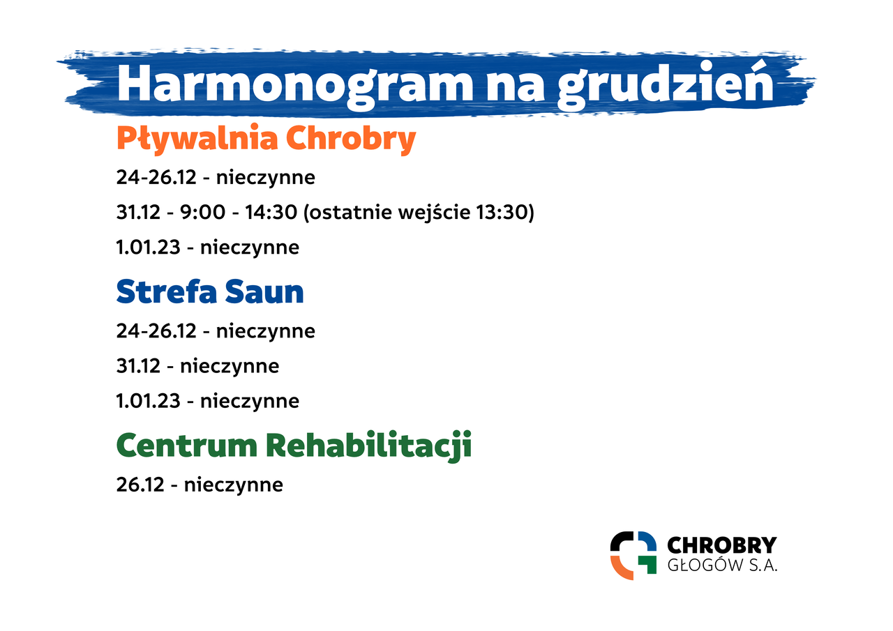 Harmonogram pracy Obiektów w grudniu Przed nami ostatni miesiąc 2022 roku. Zobacz, jak w tym gorącym okresie czynne będą nasze obiekty. 29-11-2022 08:10 autor: MK / MK / zdjęcia: MK Harmonogram obiektów Chrobrego w grudniu Koniec roku to gorący czas. Mikołajki. Święta Bożego Narodzenia. Sylwester. Nowy Rok. Zobacz, kiedy w grudniu skorzystasz z naszych obiektów.