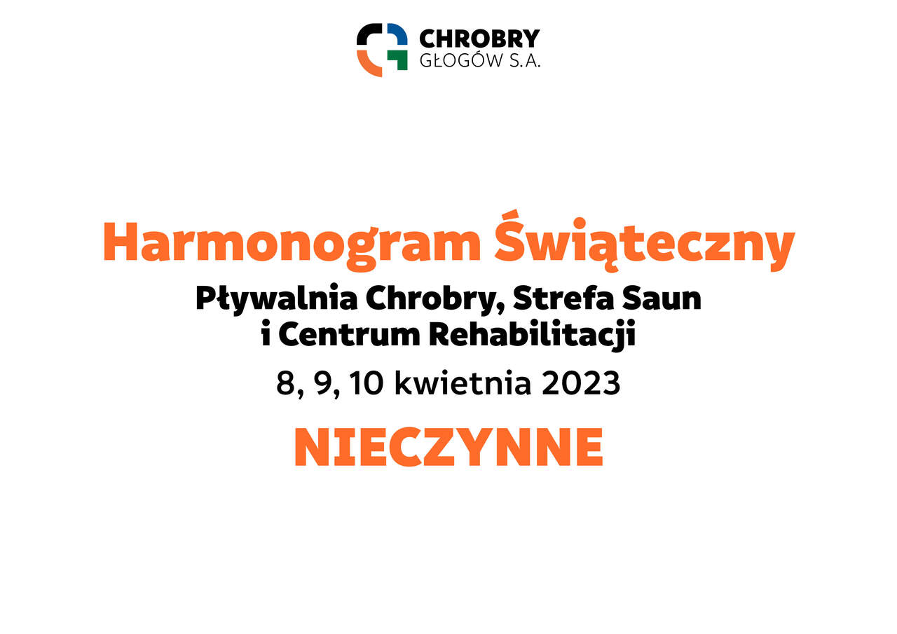 Harmonogram pracy Pływalni, saun i Centrum Rehabilitacji w Wielkanoc 2023 Na Święta zmieniamy harmonogram pracy naszych obiektów. Sprawdź, co się zmienia. 05-04-2023 07:20 autor: MK / MK / zdjęcia: MS W Święta Wielkanocne Pływalnia Chrobry, Strefa Saun i Centrum Rehabilitacji zmieniają swój harmonogram pracy. W dniach 8, 9 i 10 kwietnia wszystkie te obiekty będą nieczynne.