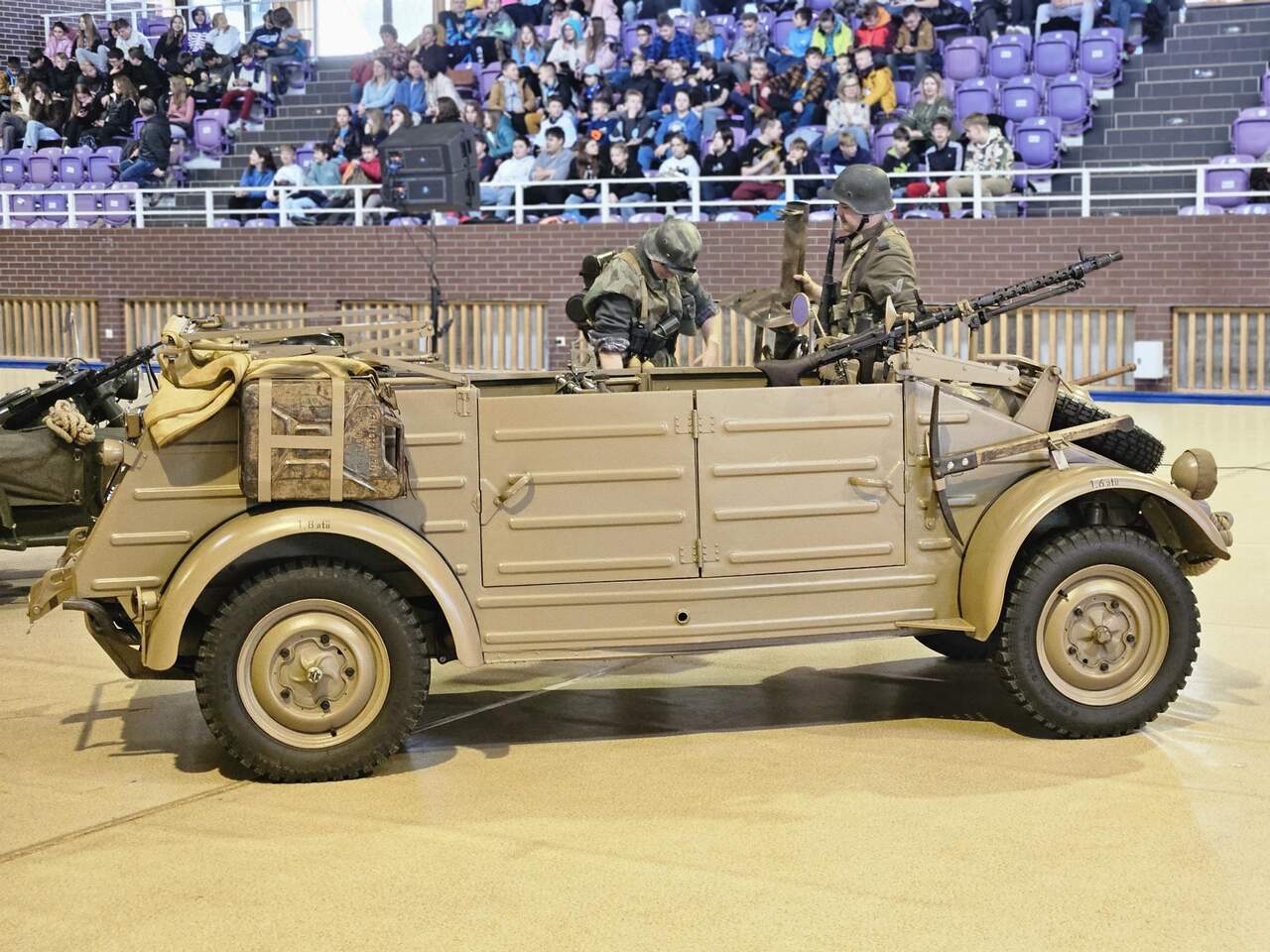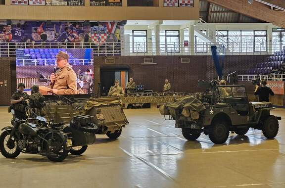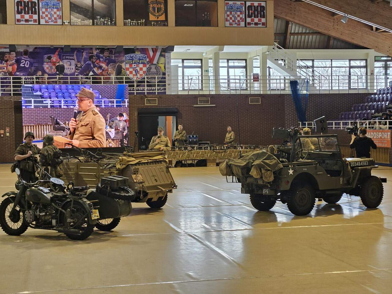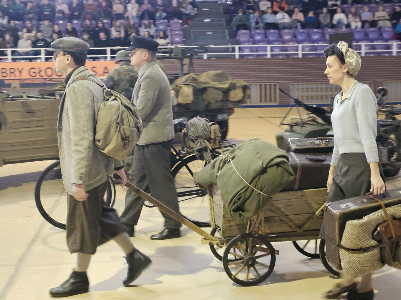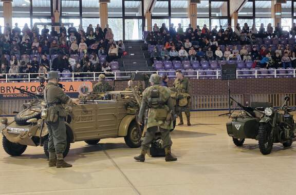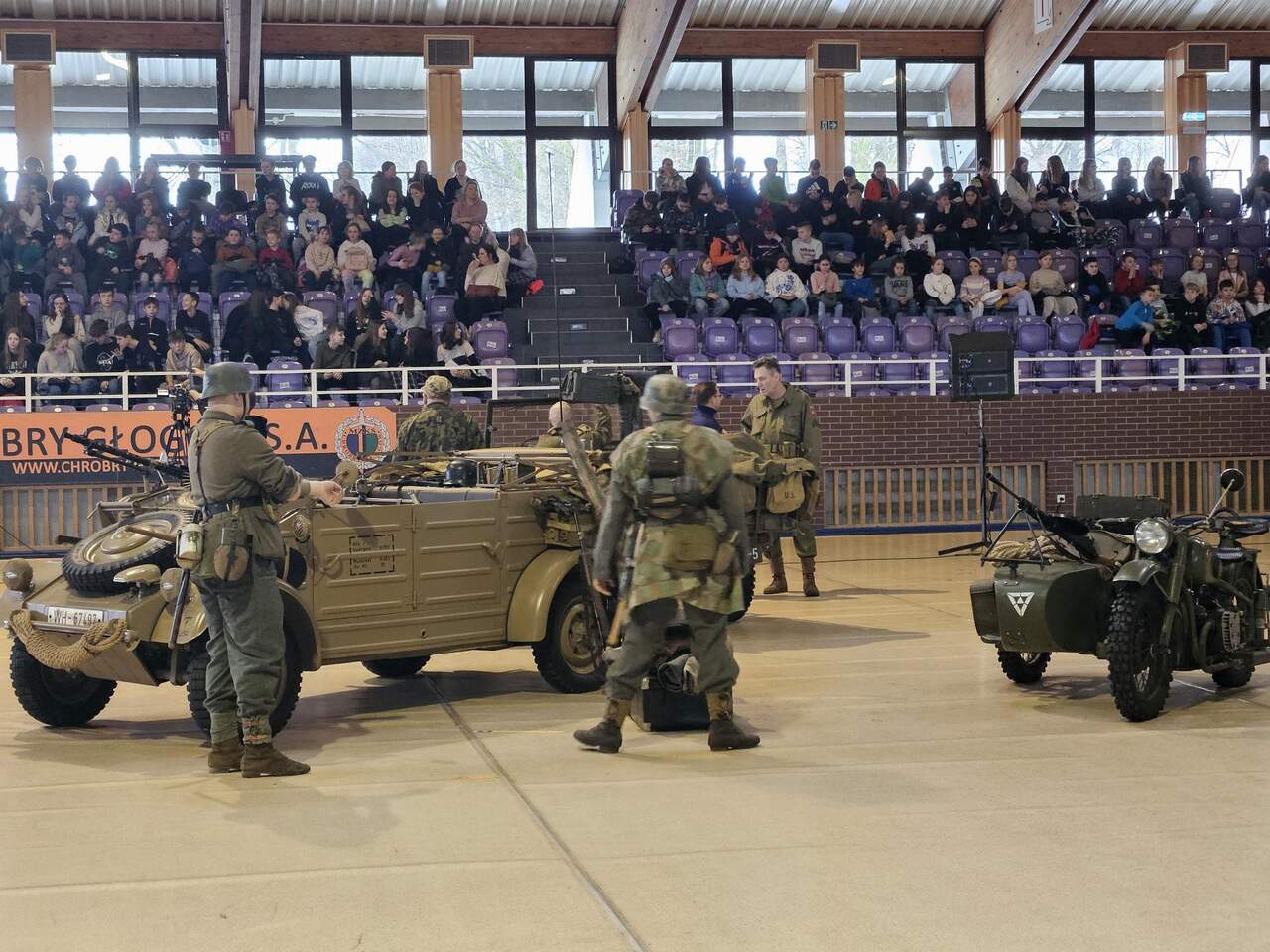 Interaktywna lekcja historii Głogowa W Hali WIdowiskowo-Sportowej im. Matuszaka odbyła się przygotowana specjalnie dla uczniów Szkół Podstawowych interaktywna lekcja historii. 31-03-2023 11:31 autor: MK / MK / zdjęcia: MK Hala Widowiskowo-Sportowa im. Matuszaka gościła niesamowitą lekcję historii. "Głogów — moje miasto, moja ojczyzna". Wzięli w niej udział uczniowie Głogowskich szkół podstawowych. Poznali historię swojego miasta od upadku Festung Glogau, aż do dzisiaj. Po wykładzie zapoznali się z pamiątkami wojennymi. Lekcja odbyła się w ramach I Głogowskiego Festiwalu Historycznego. Lekcja rozpoczęła się od pokazu mody, który przedstawił zmiany w modzie oraz pomysłowość mieszkańców zniszczonych przez wojnę miast. Był płaszcz z koca, była sukienka ze spadochronu, sukienka z zasłon czy buty z drewna. Kolejnym punktem był wykład o trudnej, naznaczonej wieloma tragediami historii powojennego Głogowa. O zmianie granic Polski, która wpłynęła na wędrówkę ludzi ze wschodu na zachód. O pierwszych osadnikach. O pierwszym burmistrzu. Cały wykład ubarwiony był zdjęciami i wspomnieniami byłych i nowych mieszkańców zniszczonego w 85% miasta. Po teorii przyszła pora na praktykę. Uczniowie mieli możliwość obcować z bronią, pojazdami, historykami, którzy przybliżali czasy już dawno minione, a które są widoczne do dziś. Kolejne punkty I Głogowskiego Festiwalu Historycznego w sobotę 01.04.