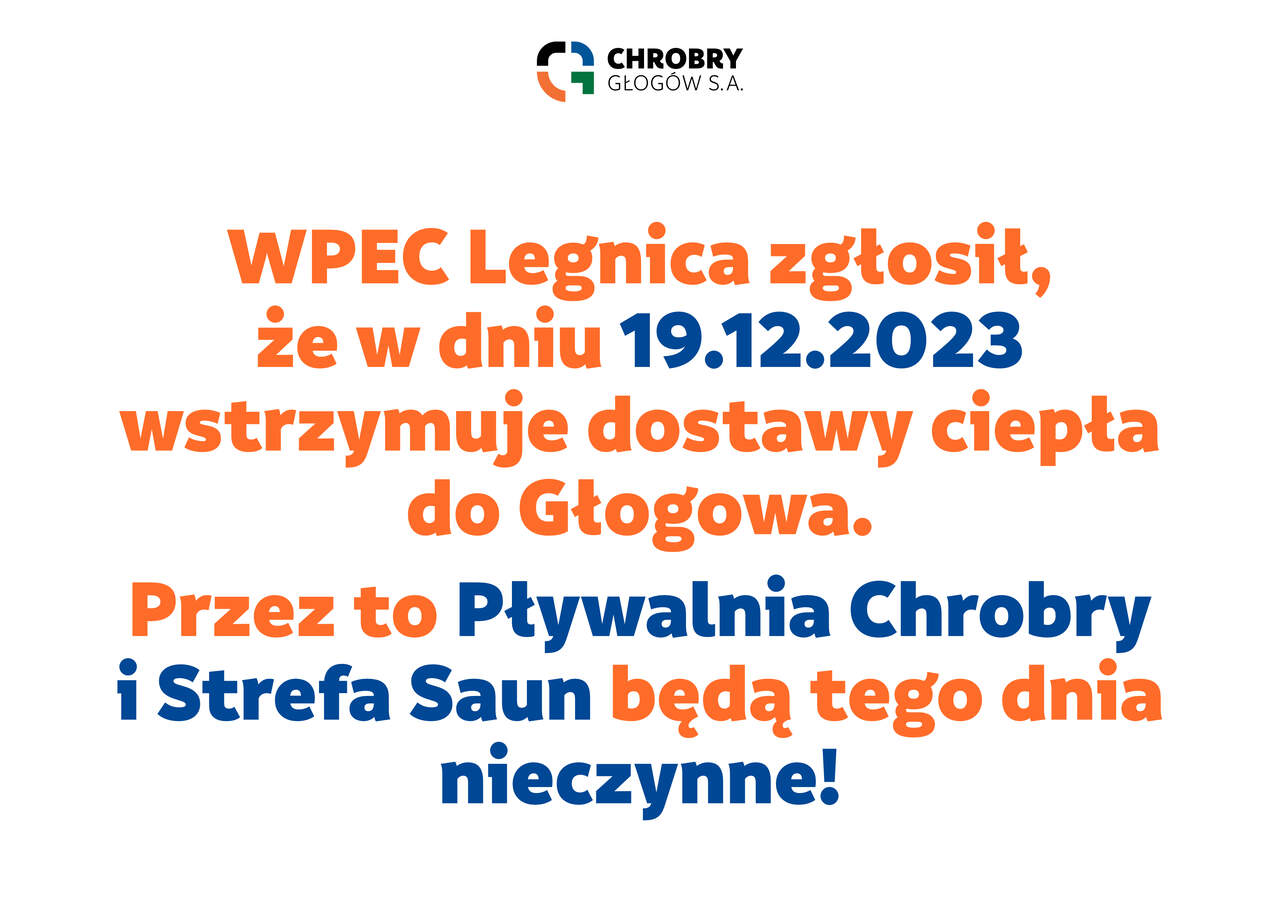 Pływalnia i sauny nieczynne 19 grudnia! WPEC Legnica zgłosił, że 19 grudnia nie będzie dostarczał ciepła do Głogowa. 15-12-2023 07:50 autor: MK / MB / zdjęcia: MS Wojewódzkie Przedsiębiorstwo Energetyki Cieplnej w Legnicy zgłosiło, że w dniu 19 grudnia planuje wstrzymanie dostaw czynnika grzewczego do Głogowa. Brak ciepła dotknie między innymi Pływalnie Chrobry. Dlatego nie możemy udostępnić hali basenowej klientom. Pływalni Chrobry i Strefa Saun będą nieczynne 19 grudnia 2023. Otwarty będzie Pomarańczowo-Czarny Sklepik.