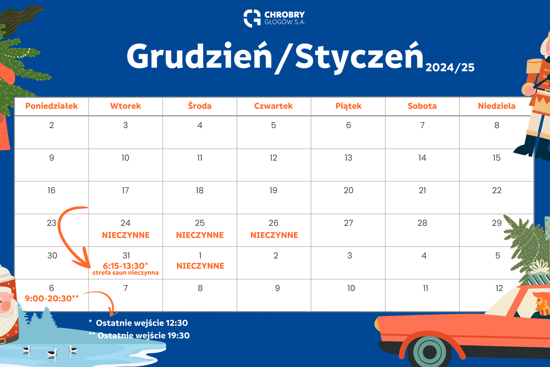 Przerwa świąteczno-noworoczna na Pływalni Zobacz w jakich dniach i godzinach możesz nas odwiedzić! 18-12-2024 03:37 autor: Rozkład funkcjonowania Baseny i sauny Chrobry Głogów S.A. na grudzień i początek stycznia Drodzy Klienci, przedstawiamy szczegóły dotyczące godzin otwarcia w okresie świąteczno-noworocznym, a także przerwy w zajęciach aqua aerobik oraz ceremoniach saunowych. Dni, kiedy jesteśmy zamknięci: 24.12 (Wigilia) – basen i sauny nieczynne 25.12 (I Dzień Świąt) – basen i sauny nieczynne 26.12 (II Dzień Świąt) – basen i sauny nieczynne 01.01.2025 (Nowy Rok) – basen i sauny nieczynne Skrócone godziny otwarcia: 31.12 (Sylwester): Basen czynny od 06:15 do 13:30 (ostatnie wejście o 12:30) Sauny nieczynne 06.01.2025 (Trzech Króli): Basen i sauny czynne od 09:00 do 20:30 (ostatnie wejście o 19:30) Aqua aerobik Od 23.12 do 06.01.2025 zajęcia nie odbywają się Wracamy do gry 08.01.2025 (środa) Ceremonie saunowe Od 23.12 do 06.01.2025 brak rytuałów saunowych Wracamy z ceremoniami koedukacyjnymi od 09.01.2025 (czwartek). Uwaga: W poniedziałki sauny od godziny 19:00 pozostają przeznaczone wyłącznie dla pań, zgodnie z regularnym harmonogramem – jednak bez ceremonii saunowych. Dziękujemy za zrozumienie i zapraszamy do wspólnego relaksu oraz aktywnego spędzania czasu po przerwie świątecznej. W razie pytań jesteśmy do Waszej dyspozycji! Jednocześnie zastrzegamy sobie prawo do wprowadzenia zmian w podanym harmonogramie.