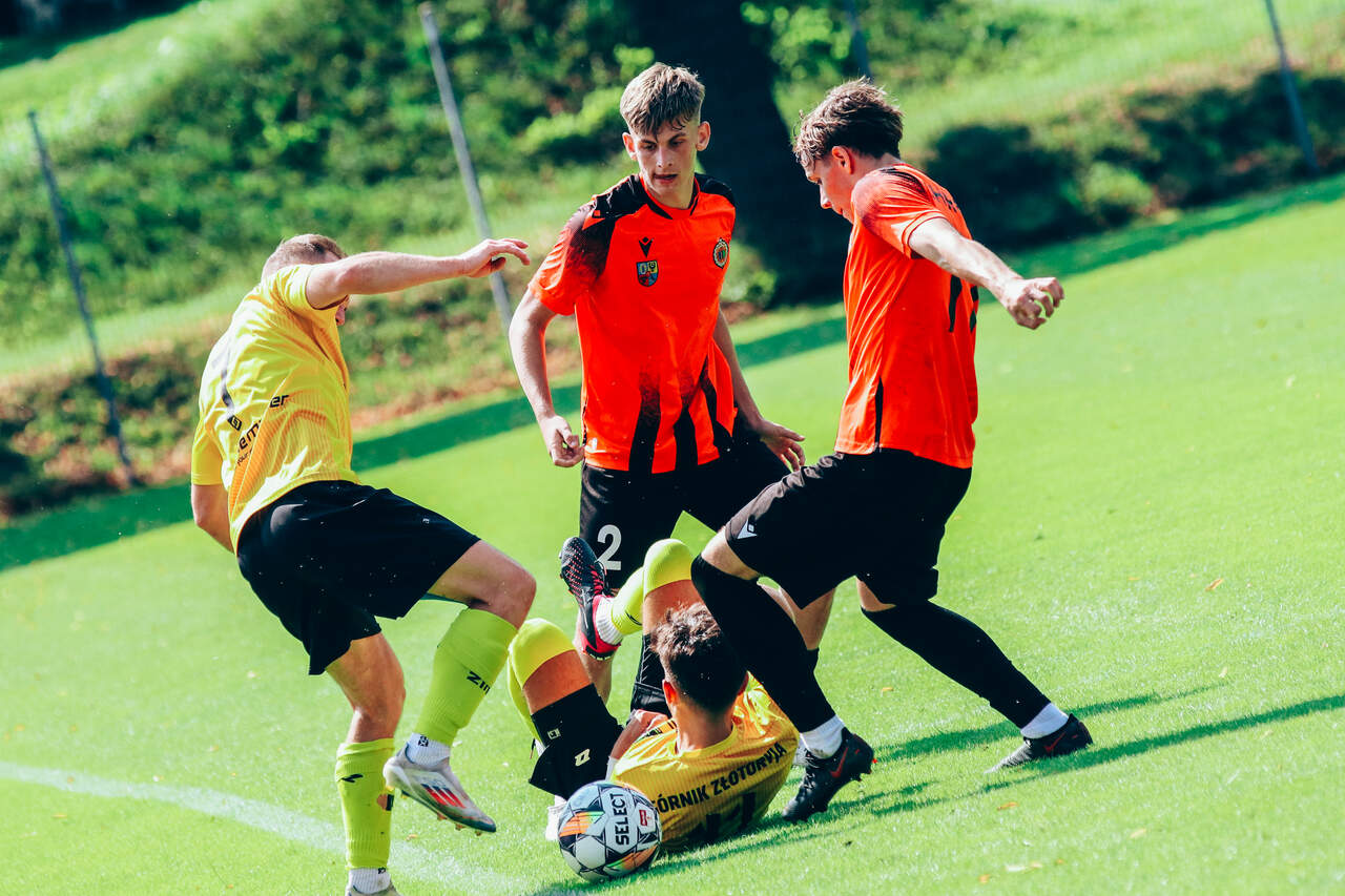 ChG II: pech w doliczonym czasie gry Pech Chrobrego w doliczonym czasie gry. Po bramce zdobytej w ostatnich minutach Górnik Złotoryja wygrał w Głogowie 1:0 w meczu 2. kolejki Koleje Dolnośląskie 4 Ligi. 10-08-2025 01:28 autor: ŁJ Spotkanie było zacięte, choć w pierwszej połowie to Chrobry był bliżej zdobycia gola – dwukrotnie jednak na drodze piłki stanął słupek. W drugiej odsłonie wszystko wskazywało na podział punktów. Nawet w najbardziej groźnych sytuacjach było remisowo. Po stronie Chrobrego swojej okazji nie wykorzystał Miłosz Skowronek, natomiast po drugiej – strzał wychodzącego na czystą pozycję zawodnika Górnika obronił Paweł Lenarcik. W doliczonym czasie gry ogromny pech spotkał gospodarzy. W trakcie interwencji Wiktor Łaszyński niefortunnie skierował piłkę do własnej bramki. Głogowianie grali wówczas w dziesięciu – chwilę po wejściu na boisko kontuzji doznał Adrian Tworzydło i musiał opuścić plac gry, a limit zmian został już wyczerpany. Wcześniej, tuż po rozpoczęciu drugiej połowy, urazu nabawił się też Ziemowit Witczak. Obaj zawodnicy zostali zniesieni z murawy na noszach. Życzymy im szybkiego powrotu do zdrowia, a Chrobremu – szybkiego odbicia po tym pechowym występie. Okazja ku temu nadarzy się w sobotę, 16 sierpnia, kiedy Pomarańczowo-Czarni zagrają na wyjeździe z Łużycami Lubań. CHROBRY II GŁOGÓW – GÓRNIK ZŁOTORYJA 0:1 (0:0) 0:1 Łaszyński 90 (sam.) Chrobry II: Lenarcik – Janik, Szarek (59 Łaszyński), Tworzydło K. (85 Tworzydło A.), Francus (67 Machaj), Janczukowicz (59 Cichy), Antkowiak (46 Wojtal), Bonecki, Kuzdra (59 Skowronek), Malczuk, Witczak (52 Manijak). Żółte kartki (Chrobry II): Machaj, Janik, Francus, Manijak, Skowronek, Cichy.