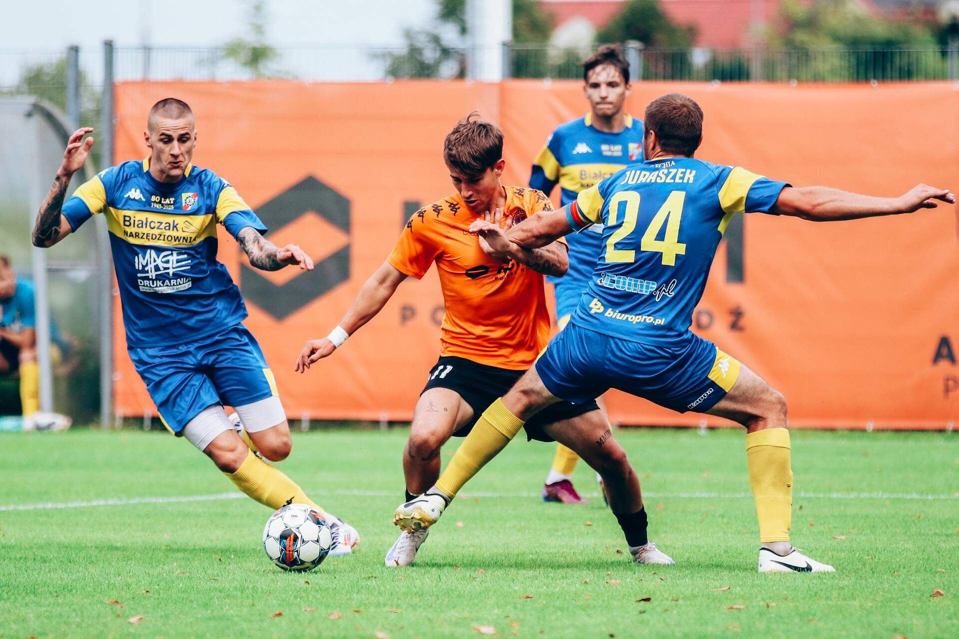 Chrobry II Głogów - Lechia Dzierżoniów 1:1 Chrobry II podzielił się punktami w meczu 6 kolejki Kolei Dolnośląskich 4 Ligi z Lechią Dzierżoniów. 31-08-2024 05:05 autor: ŁJ Pomarańczowo-Czarni swoją przewagę udokumentowali golem zdobytym do szatni. W 45 minucie bramkarza rywali pokonał Tomasz Wojciechowski i z jednobramkowym prowadzeniem Chrobry zszedł na przerwę. Wcześniej dwie świetne okazje miał Mateusz Machaj, którego przed wpisaniem się na listę strzelców najpierw zatrzymał golkiper Lechii, a następnie poprzeczka. Trzeba było zadowolić się tym 1:0. Po zmianie stron goście zdołali jednak doprowadzić do wyrównania, wykorzystując stały fragment gry. W 61 minucie Marcel Gawłowski został pokonany bezpośrednio z rzutu wolnego i ta bramka spowodowała, że mecz zakończył się podziałem punktów. CHROBRY II GŁOGÓW – LECHIA DZIERŻONIÓW 1:1 (1:0) 1:0 Wojciechowski 45 1:1 Wasilewski 61 CHROBRY II: Gawłowski – Bartecki (67 Biliński), Marcinkowski, Diduszko, Antkowiak (67 Francus), Grzelak, Janiszewski, Wojciechowski (67 Marciniak), Skowronek, Machaj, Witczak (83 Tworzydło). ŻÓŁTE KARTKI (CHROBRY II): Grzelak.