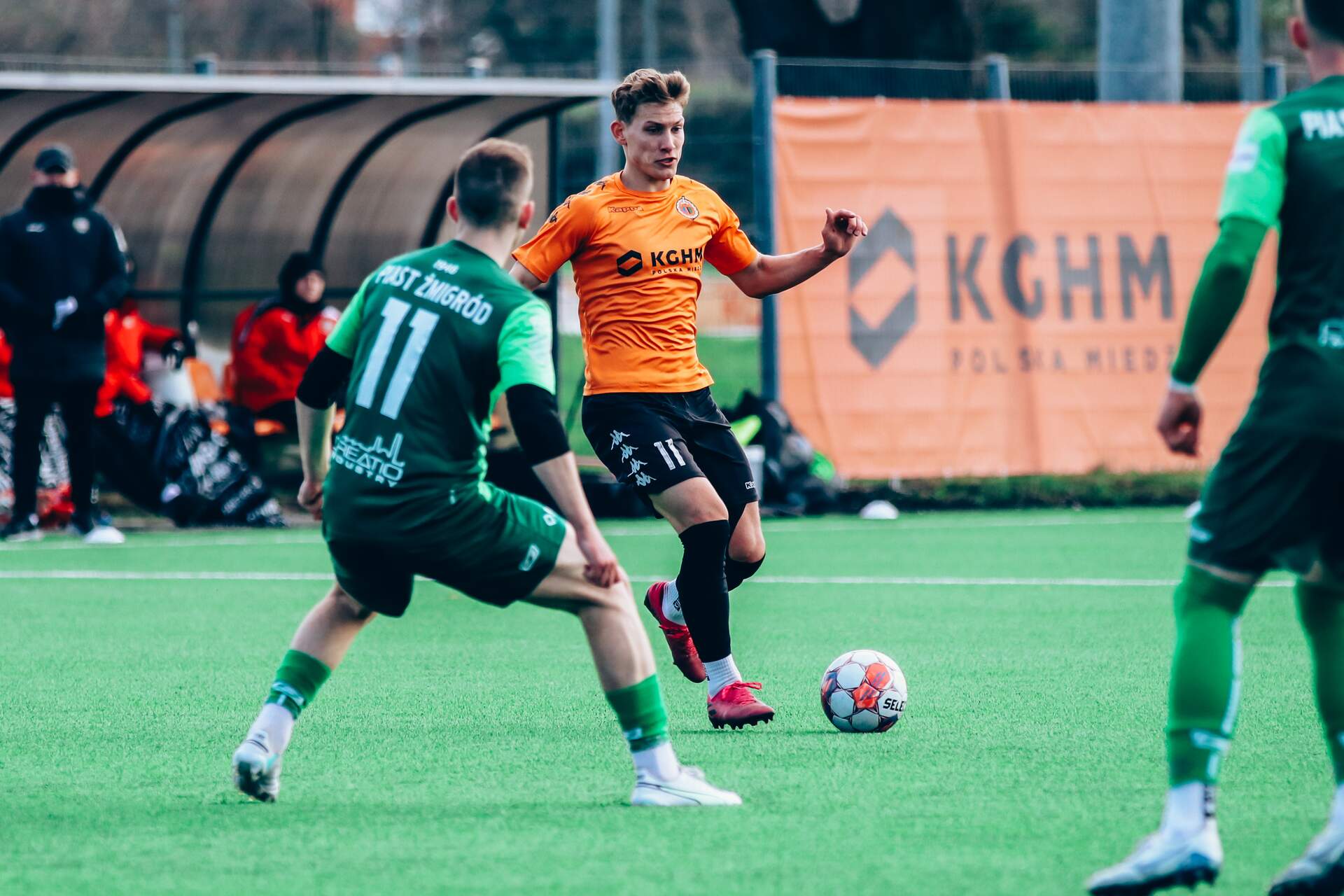 Chrobry II Głogów - Piast Żmigród 1:3 W 20 kolejce Koleje Dolnośląskie 4 Ligi Chrobry II Głogów przegrał z Piastem Żmigród 1:3. Bramkę dla Pomarańczowo-Czarnych zdobył Stanisław Antosik. 17-03-2024 01:49 autor: ŁJ To był mecz dwóch bardzo wyrównanych zespołów, co pokazała pierwsza połowa. Upłynęła pod znakiem walki i bez czystych okazji. Więcej sytuacji było w drugiej części. Zaczęło się od gości, którzy w 62 minucie po szybkiej akcji zakończonej przez Patryka Łukaszewskiego objęli prowadzenie. W 73 minucie w polu karnym sfaulował Jakub Korolewicz, a jedenastkę wykorzystał Błażej Chouwer i było 0:2. Chrobry ruszył mocno do przodu, a w efekcie kontaktowego gola w 78 minucie zdobył Stanisław Antosik. Po chwili było blisko remisu 2:2, jednak piłka po uderzeniu Piotra Bilińskiego obiła poprzeczkę. Kiedy wydawało się, że zdeterminowani głogowianie zdobędą się jeszcze na skuteczną akcję, w doliczonym czasie po faulu Stanisław Antosika sędzia po raz drugi wskazał na wapno i po raz drugi wstrzelił się Błażej Chouwer. CHROBRY II GŁOGÓW - PIAST ŻMIGRÓD 1:3 (0:0) 0:1 Łukaszewski 62 0:2 Chouwer 73 (k) 1:2 Antosik 78 1:3 Chouwer 90 (k) CHROBRY II: Korolewicz - Malczuk, Jandziak (56 Biliński), Maćkowiak, Pieczarka (76 Krawiec), Ozimek, Szczutowski (53 Wojciechowski), Tupaj, Grzelak (79 Jurgo), Janiszewski (56 Antosik), Klimczak (76 Bartecki). ŻÓŁTE KARTKI (CHROBRY II): Jandziak.