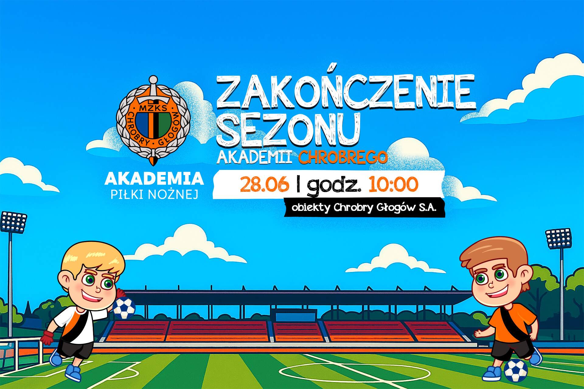Wielkie zakończenie sezonu Akademii! Dobiega koniec kolejnego sezonu w Akademii Piłki Nożnej Chrobrego Głogów. Zachęcamy do jego wspólnego świętowania – w sobotę 28 czerwca na obiektach klubu. 20-06-2025 01:56 autor: ŁJ Zaczynamy na pierwszej płycie stadionu o godz. 10.00. - Zapraszamy wszystkich zawodników i zawodniczki Akademii Piłki Nożnej Chrobrego, a także rodziców i trenerów. Chcemy wspólnie, aktywnie spędzić czas i podsumować upływający sezon. Nadrzędnym celem naszego spotkania jest integracja środowiska zawodników, zawodniczek, rodziców i trenerów klubowej Akademii - zaprasza dyrektor APN Jarosław Wielgus. Na program wydarzenia składa się mnóstwo atrakcji. Tego dnia odbędzie się jedyny w swoim rodzaju mecz towarzyski rodziców na trenerów. Po głośnym dopingu zapraszamy na dmuchańce, na baseny odkryte, które wszystkim uczestnikom zostaną udostępnione za darmo i na poczęstunek, bo skoro prawdziwie letni piknik, to nie może zabraknąć pysznych potraw z grilla i wojskowej grochówki. Czas wypełnią też treningi, choć tego dnia liczy się przede wszystkim dobra zabawa. Podczas zakończenia tętnił życiem będzie nie tylko stadion z basenami, ale też inne boiska treningowe. Na nich odbędzie się inauguracyjna kolejka Ligi Orlikowej, której będziemy patronować, oraz zajęcia Trenera Osiedlowego. - W ten sposób chcemy zaprosić zawodników i zawodniczki do udziału w prowadzonym przez klub projekcie Trenera Osiedlowego oraz w głogowskiej Lidze Orlikowej. To świetna okazja na aktywne spędzenie wakacji, bo oba przedsięwzięcia będą prowadzone przez całe lato - dodaje Jarosław Wielgus.