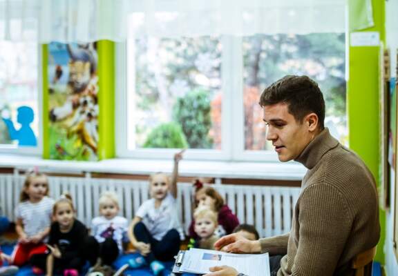 Mikołaj Lebedyński z juniorami w przedszkolu