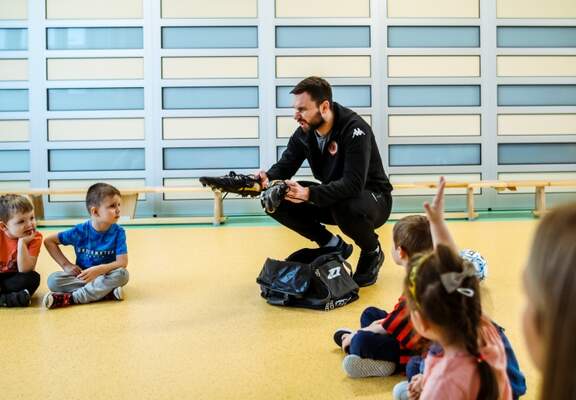 Poobijany po meczu z ŁKS-em, już po rundzie, a chętnie odwiedził maluchy z Przedszkola Publi...