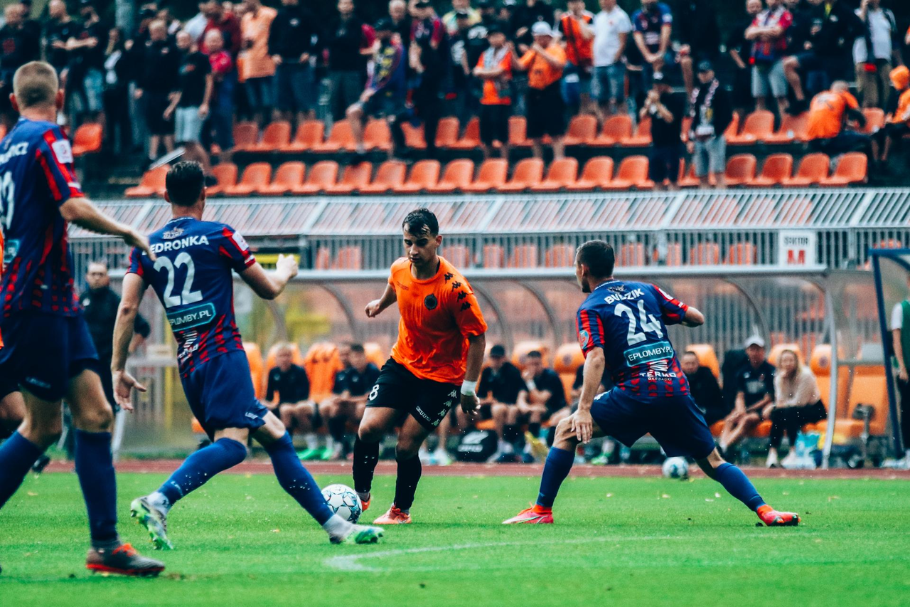 3 LIGA: Chrobry II Głogów - Polonia Bytom 0:2 W 4 kolejce 3 ligi Chrobry przegrał z Polonią Bytom 0:2. 20-08-2022 07:02 autor: ŁJ Mecz toczył się w trudnych warunkach, przy momentami mocno padającym deszczu i to miało wpływ na wygląd spotkania. W pierwszej połowie w tych warunkach więcej z przodu zdziałali bardziej doświadczeni goście, którzy mieli więcej okazji, a przy dwóch głogowian ratowała poprzeczka i słupek. W 41 minucie rywale wykonywali rzut rożny i zrobili z niego użytek. Po dośrodkowaniu z narożnika głową Bartka Szafera pokonał Jakub Góralczyk i po 45 minutach Polonia była na jednobramkowym prowadzeniu. W drugiej połowie Polonia zdołała podwyższyć swoje prowadzenie. W 78 minucie, po stracie piłki przez głogowian, bramkę po ładnym strzale z kilkunastu metrów zdobył Tomasz Gajda. Choć młodym zawodnikom Chrobrego II nie można odmówić woli walki i podejmowania prób odrobienia strat nawet po stracie drugiego gola, zwycięstwo bytomian jest zasłużone. Chrobry ma teraz tydzień przygotowań do kolejnego meczu. W 5 kolejce głogowianie zmierzą się w małych derbach z Miedzią II Legnica. Początek zaplanowano na sobotę 28 sierpnia na godz. 12.00 w Legnicy. CHROBRY II GŁOGÓW – POLONIA BYTOM 0:2 (0:1) 0:1 Góralczyk 41 0:2 Gajda 78 CHROBRY II: Szafer – Iwanowicz, Malczuk, Wawrzyniak, Jandziak, Inoue (58 Jurgo), Cieślicki (58 Wojciechowski), Matysiak (74 Krawiec), Maćkowiak, Bartlewicz (58 Jaszczyk), Jóźwiak (68 Zygmunt). POLONIA: Gniełka – Zieliński (87 Tkachuk), Żagiel (68 Lipp), Góralczyk, Stefański (68 Andrzejczak), Gajda, Wolny, Bedronka, Budzik (89 Anklewicz), Konieczny, Radkiewicz. ŻÓŁTE KARTKI: Malczuk, Bartlewicz, Szafer, Wawrzyniak, Cieślicki – Stefański, Konieczny, Radkiewicz, Andrzejczak.